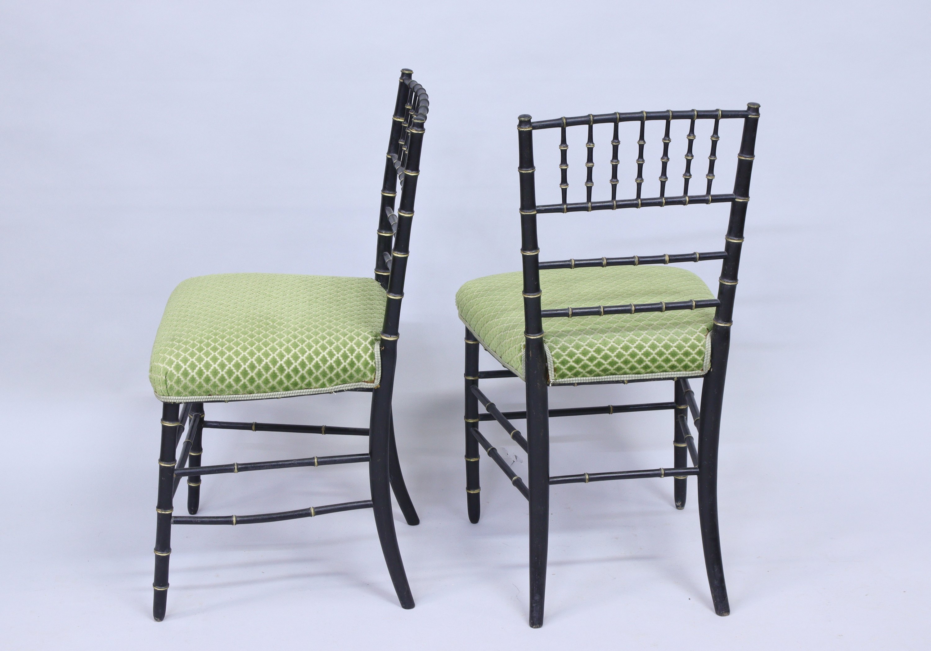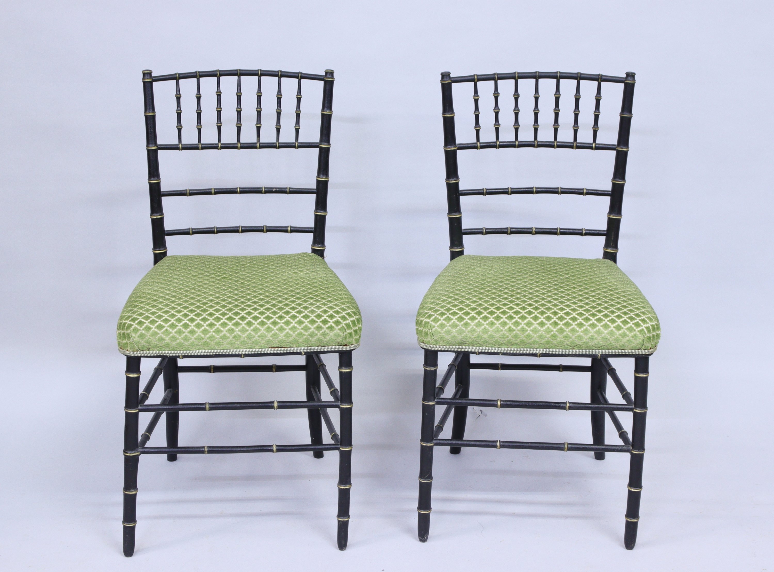 en bois noirci en forme de bambou. Assise capitonnée en velours vert.