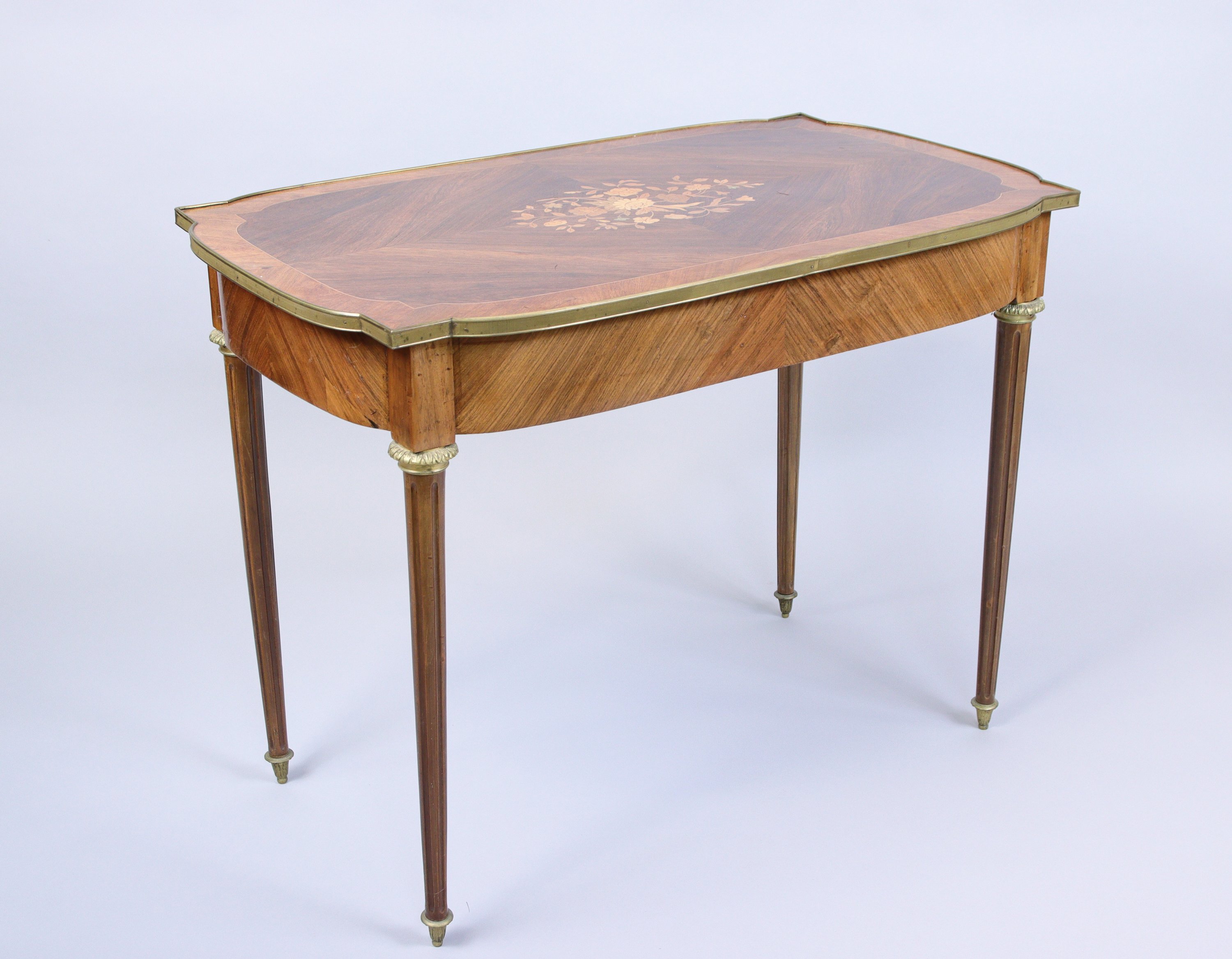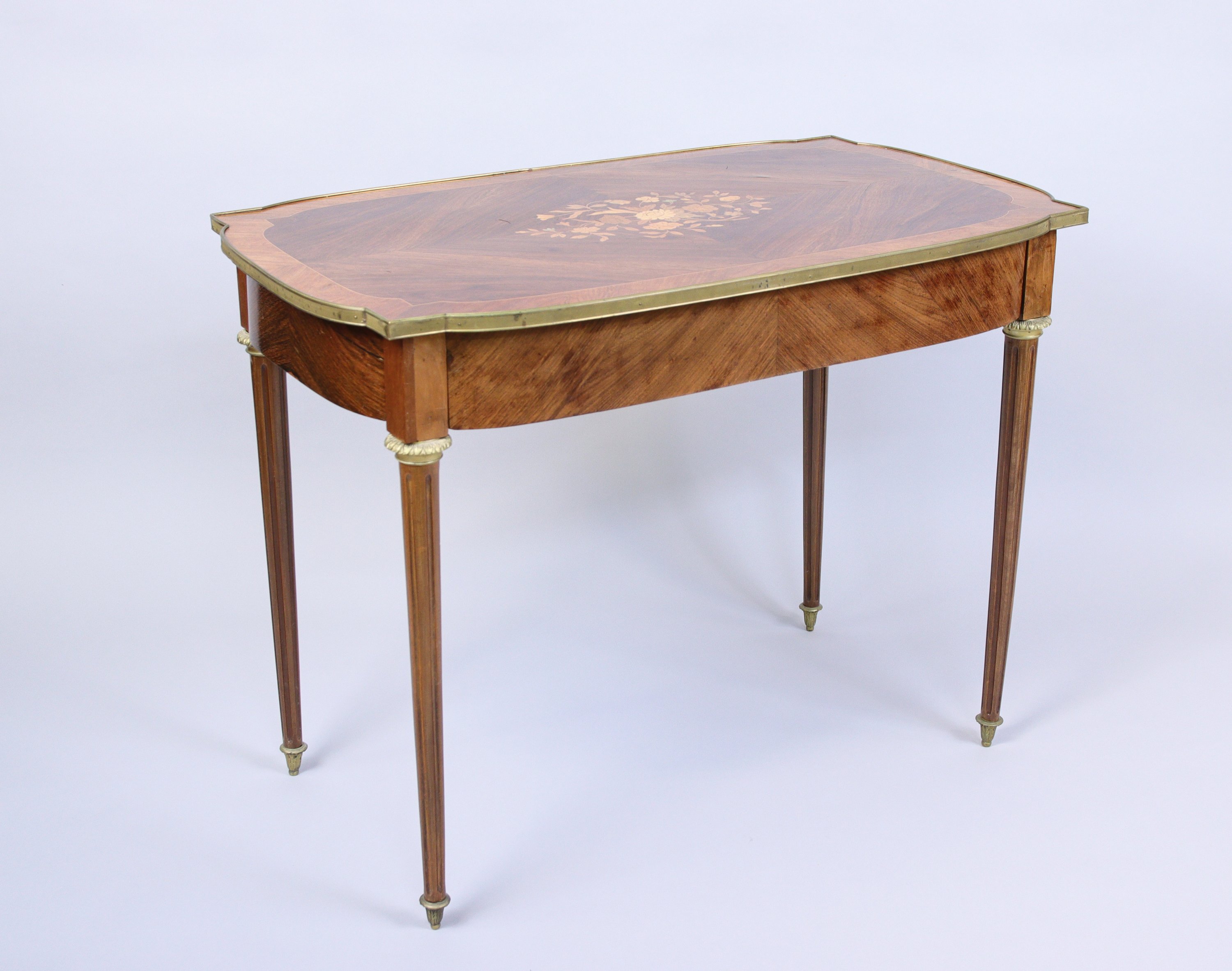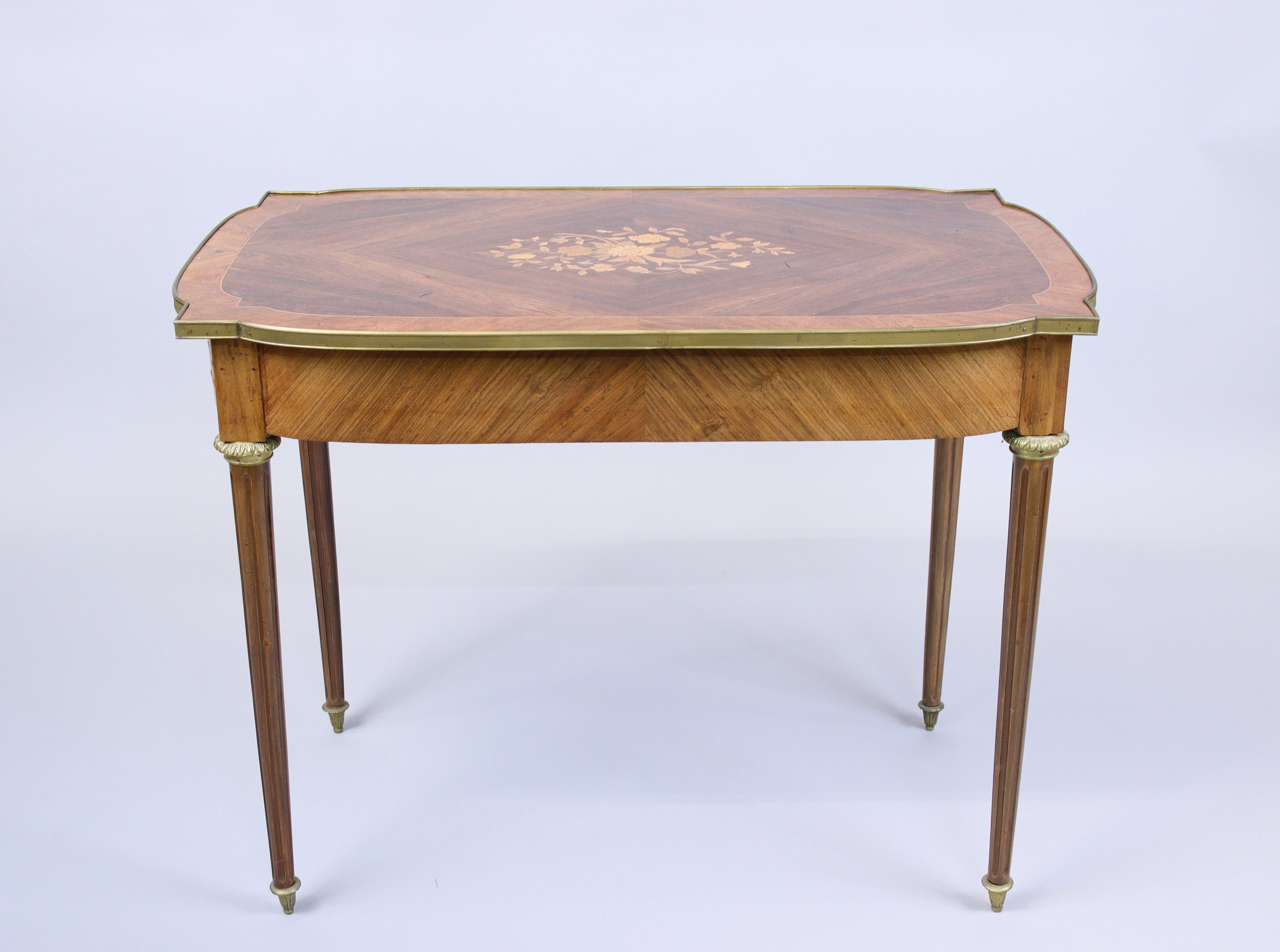 en placage d'acajou, ouvrant à un tiroir. Le plateau à doucine est ceint de bronze doré sur sa tranche et d'une marqueterie de fleurs en bois fruitiers en son centre. Son piétement cannelé est lié au plateau par un chapiteau en palmette.