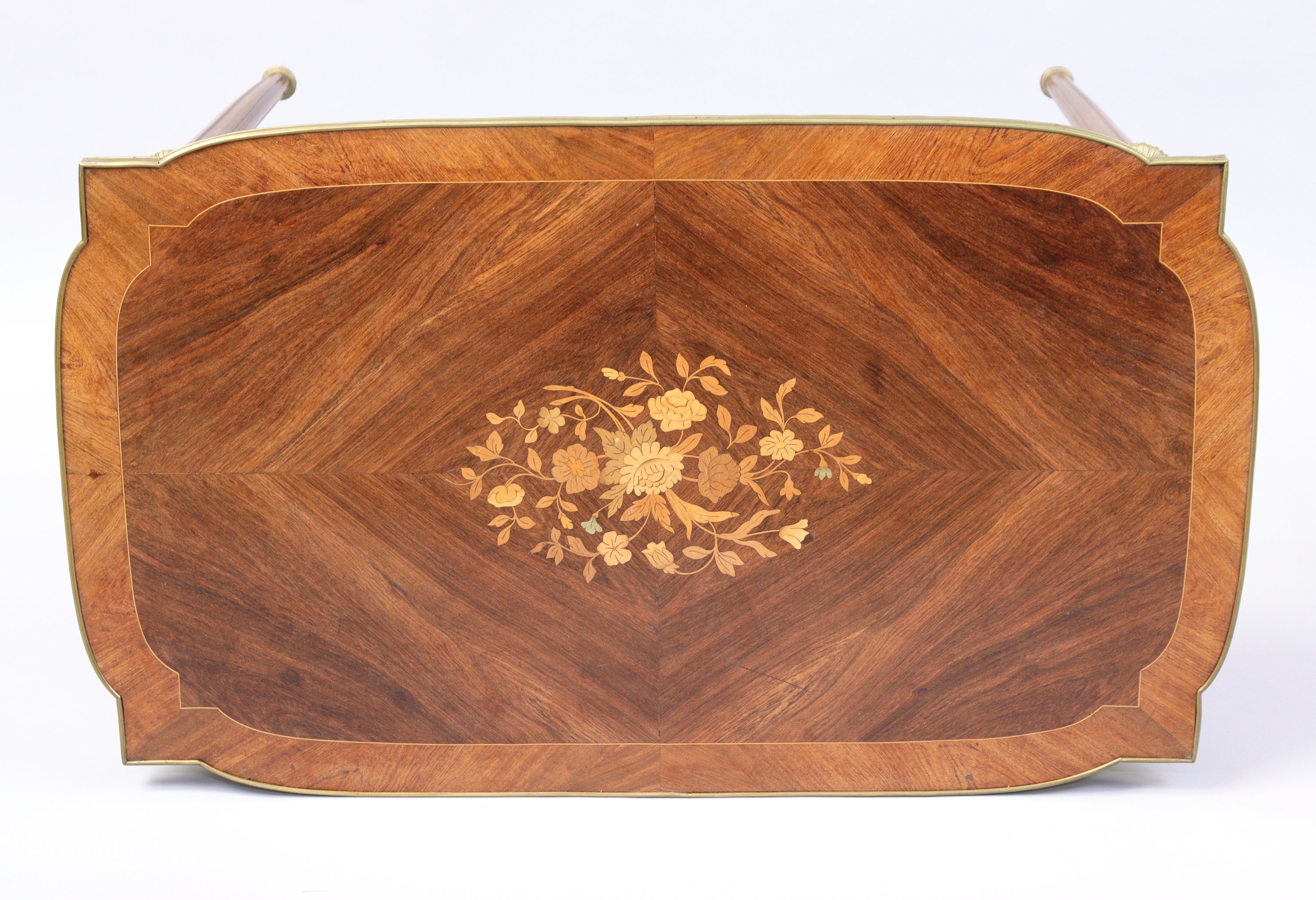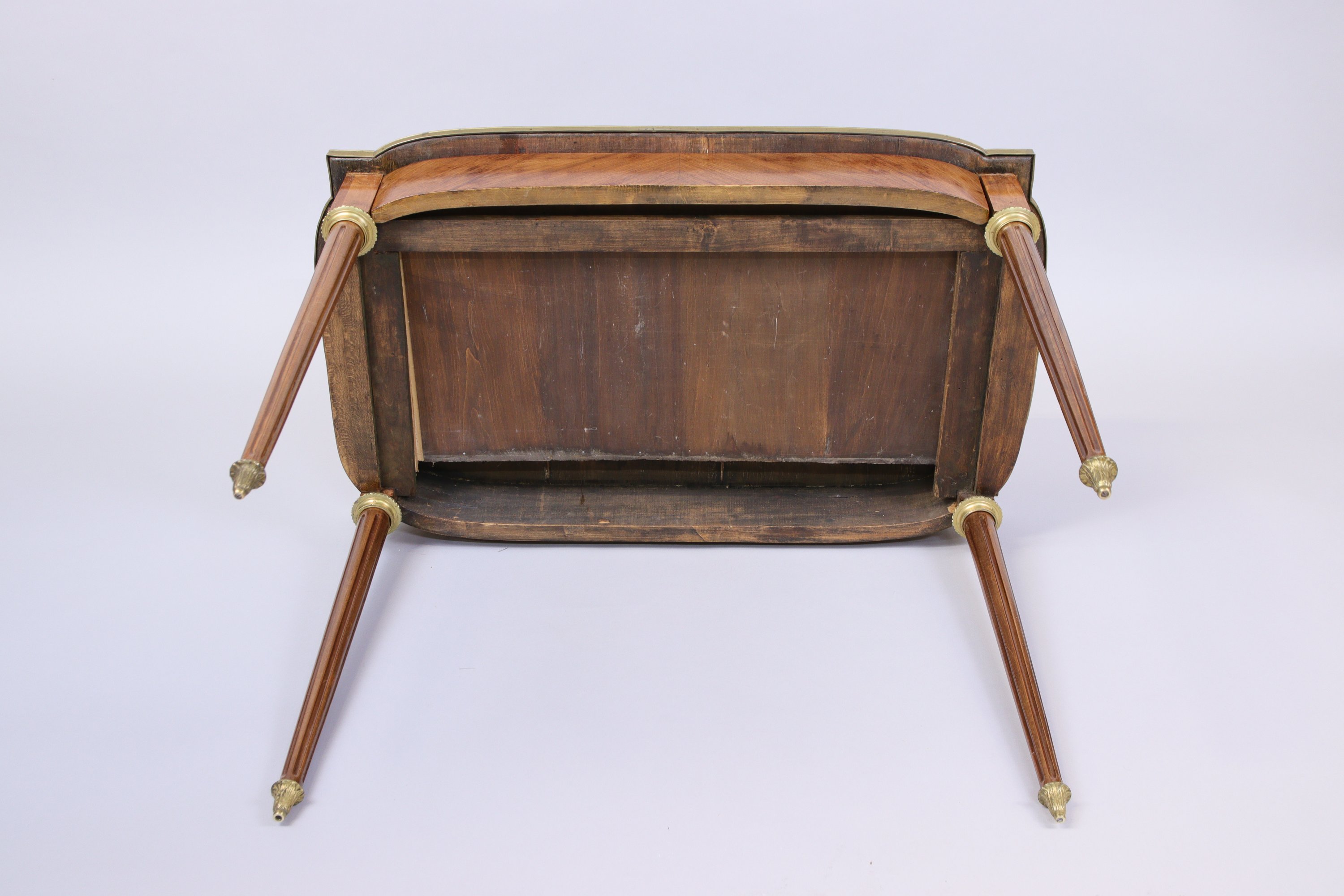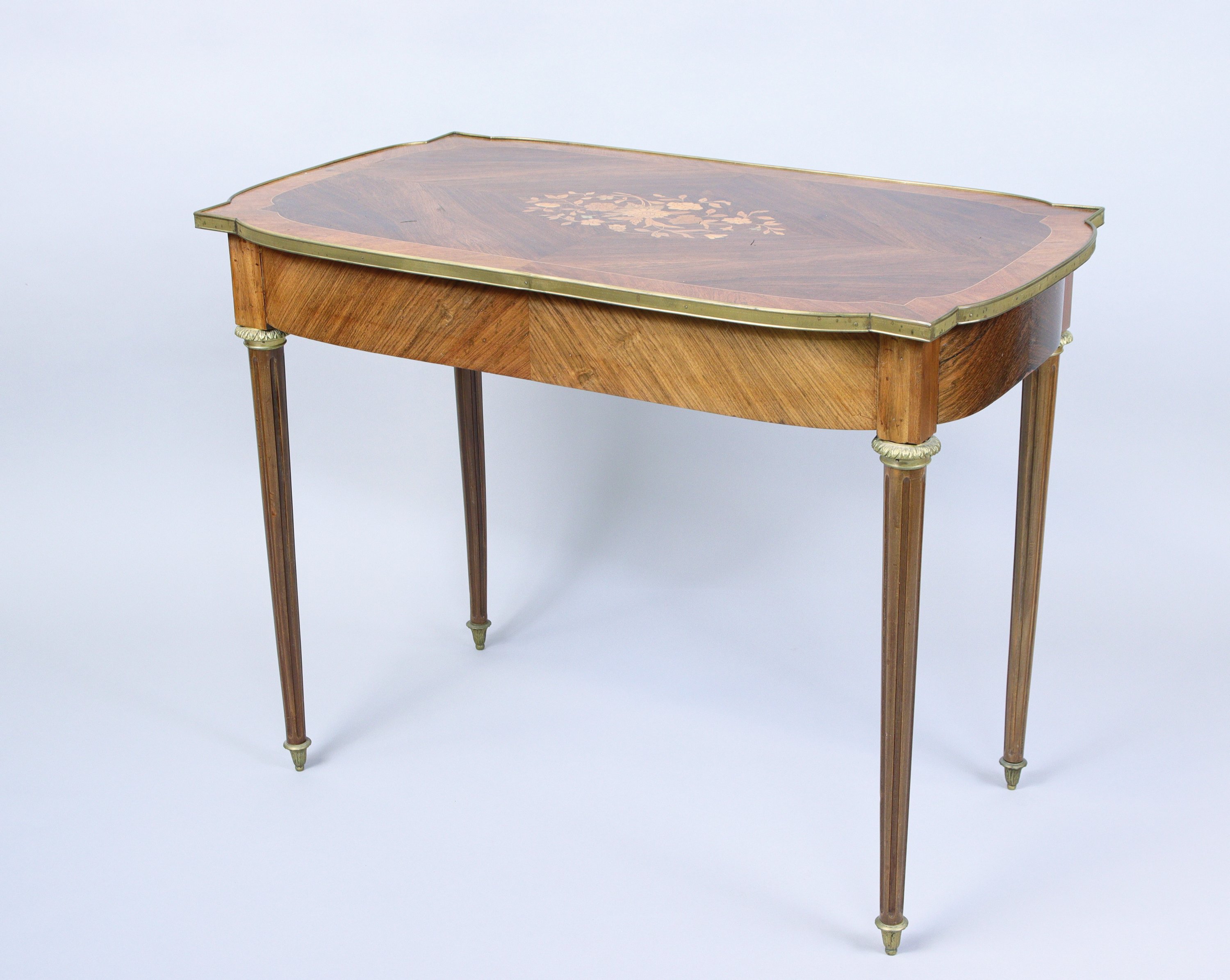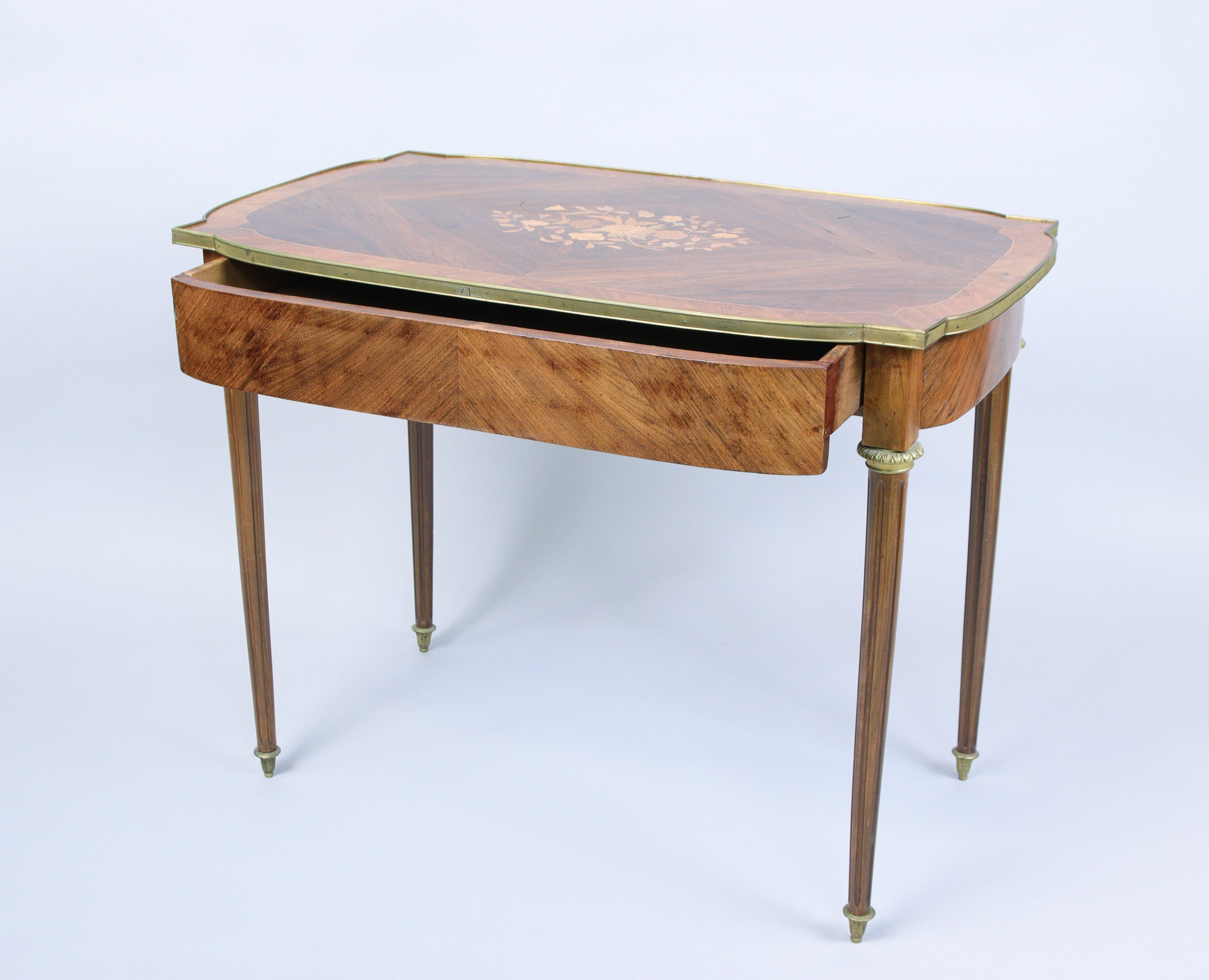 en placage d'acajou, ouvrant à un tiroir. Le plateau à doucine est ceint de bronze doré sur sa tranche et d'une marqueterie de fleurs en bois fruitiers en son centre. Son piétement cannelé est lié au plateau par un chapiteau en palmette.