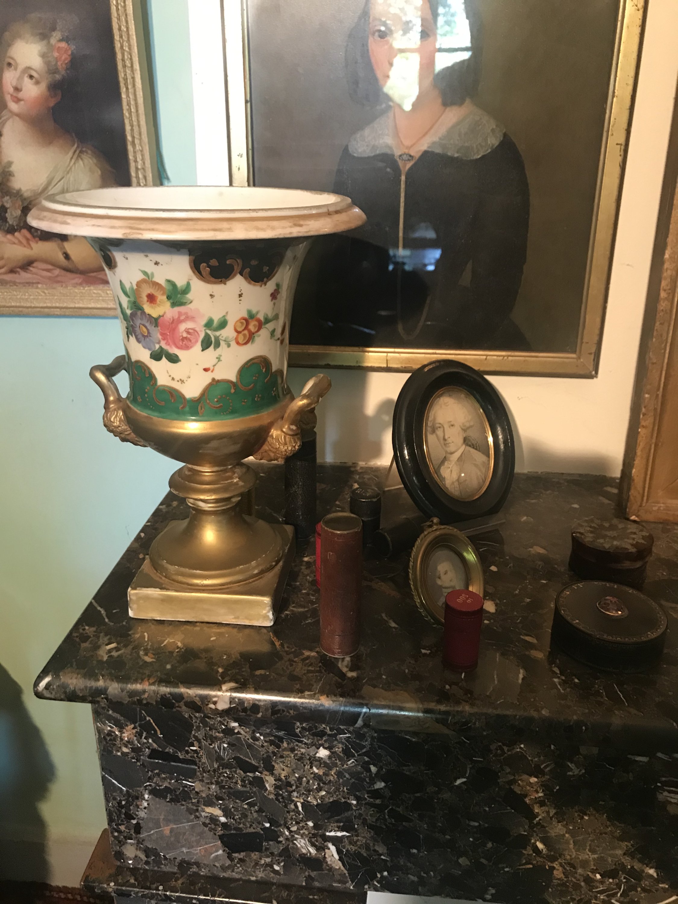 - PAIRE de VASES MÉDICIS en porcelaine blanche, polychrome et or repeint. Restauration, XIXe. Haut. 26 cm. (accidents et restaurations).