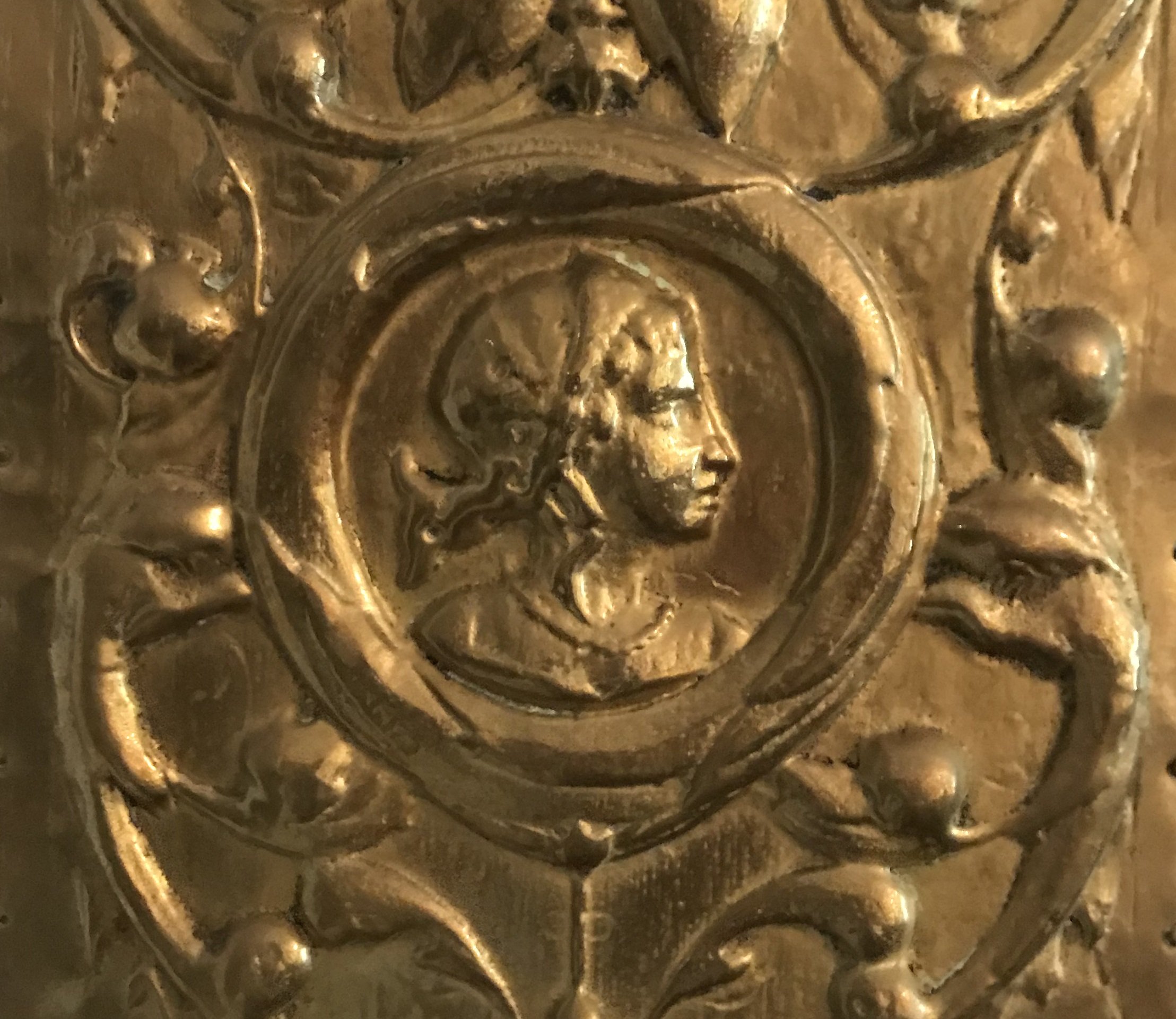PAIRE de PLAQUES en cuivre repoussé dans le goût de la Renaissance, à profils de femme et de guerrier.