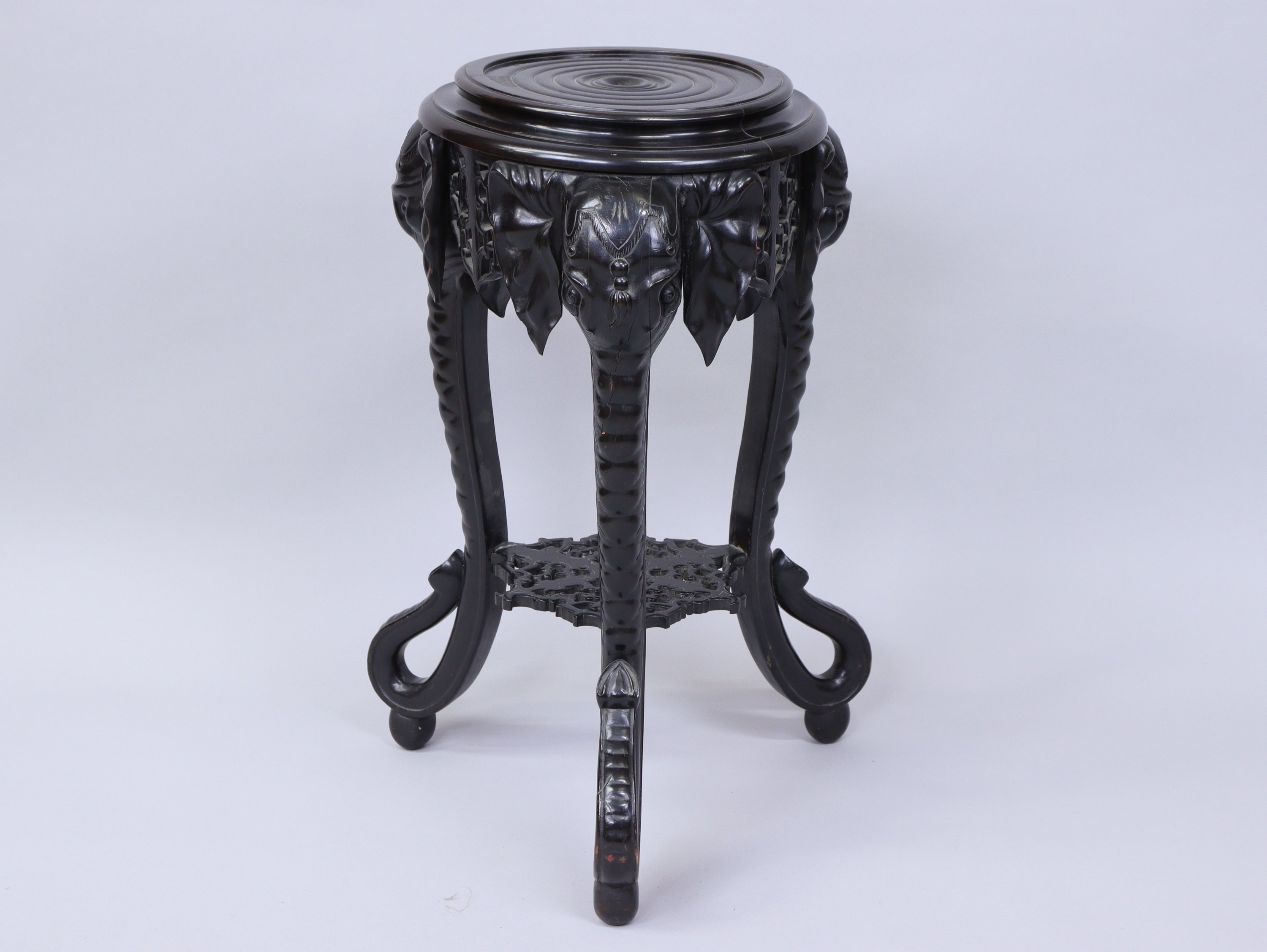 SELLETTE AUX ÉLÉPHANTS en bois noirci, à piétement tripode reposant sur des protomés d'éléphant.