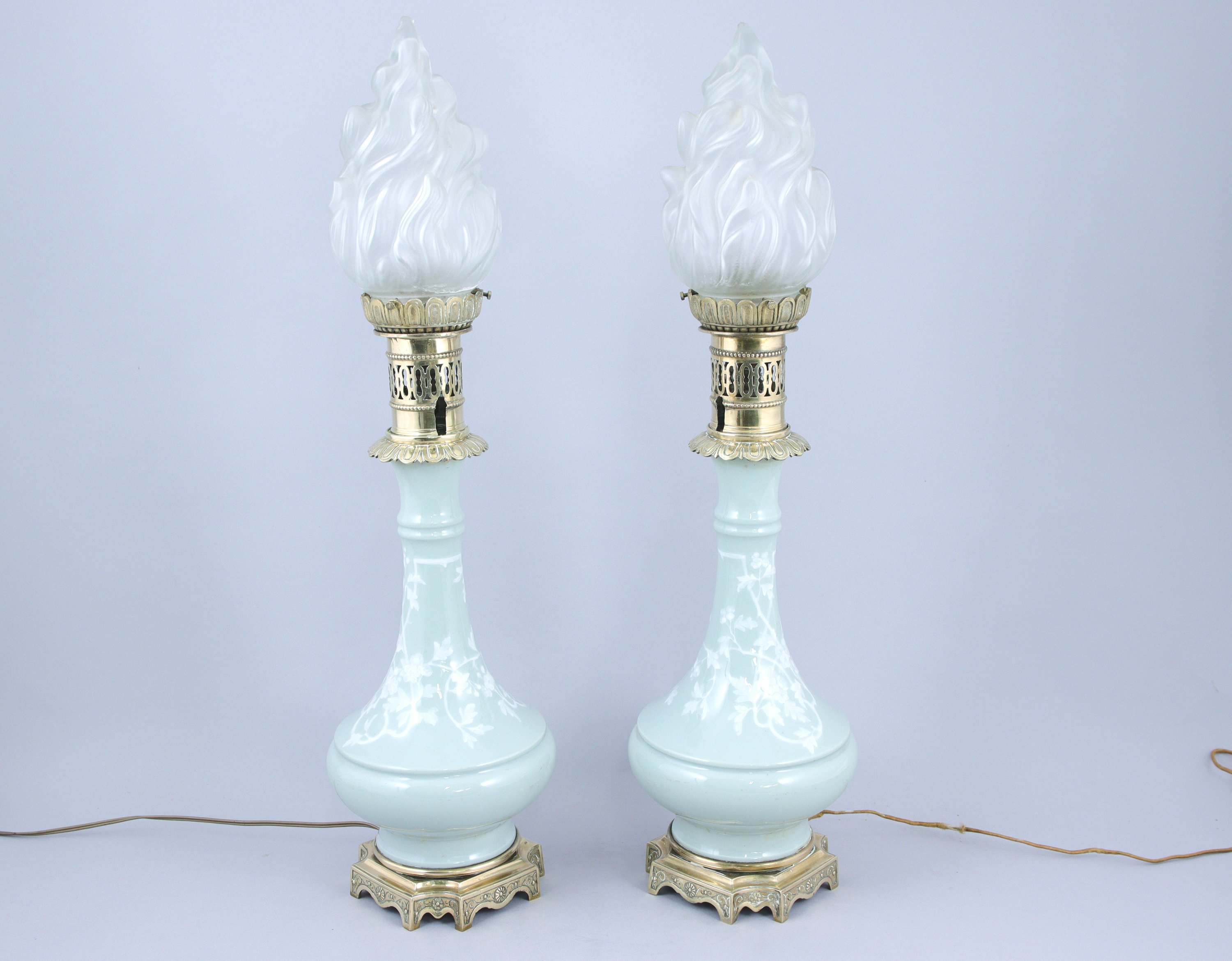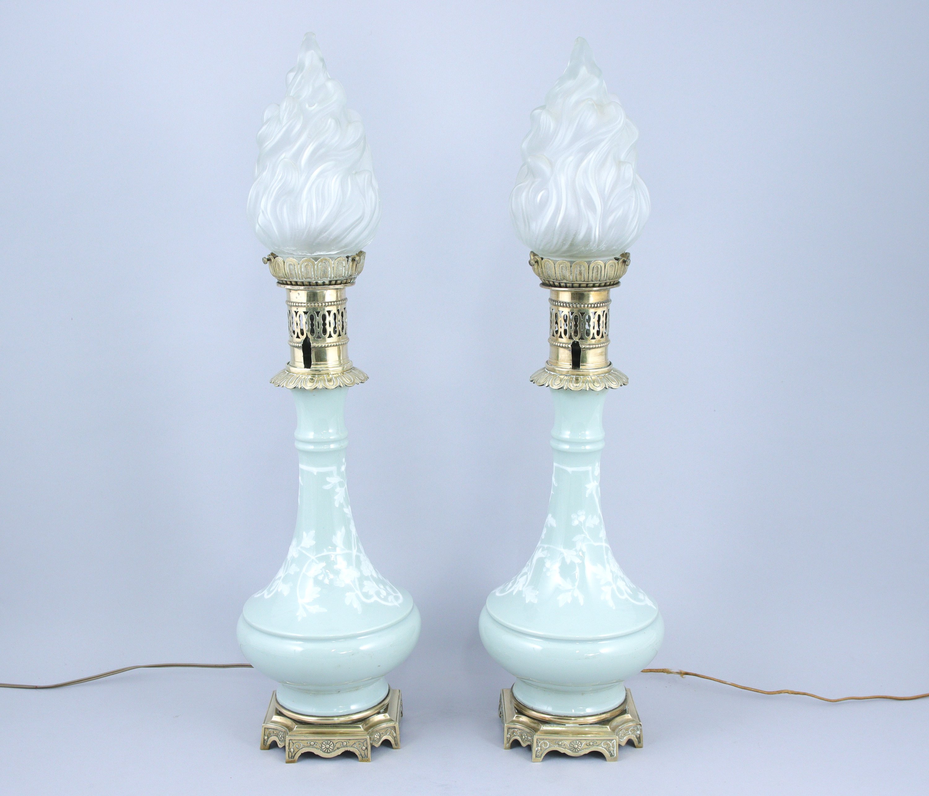 PAIRE DE LAMPES en bronze et céramique bleu céladon. ...