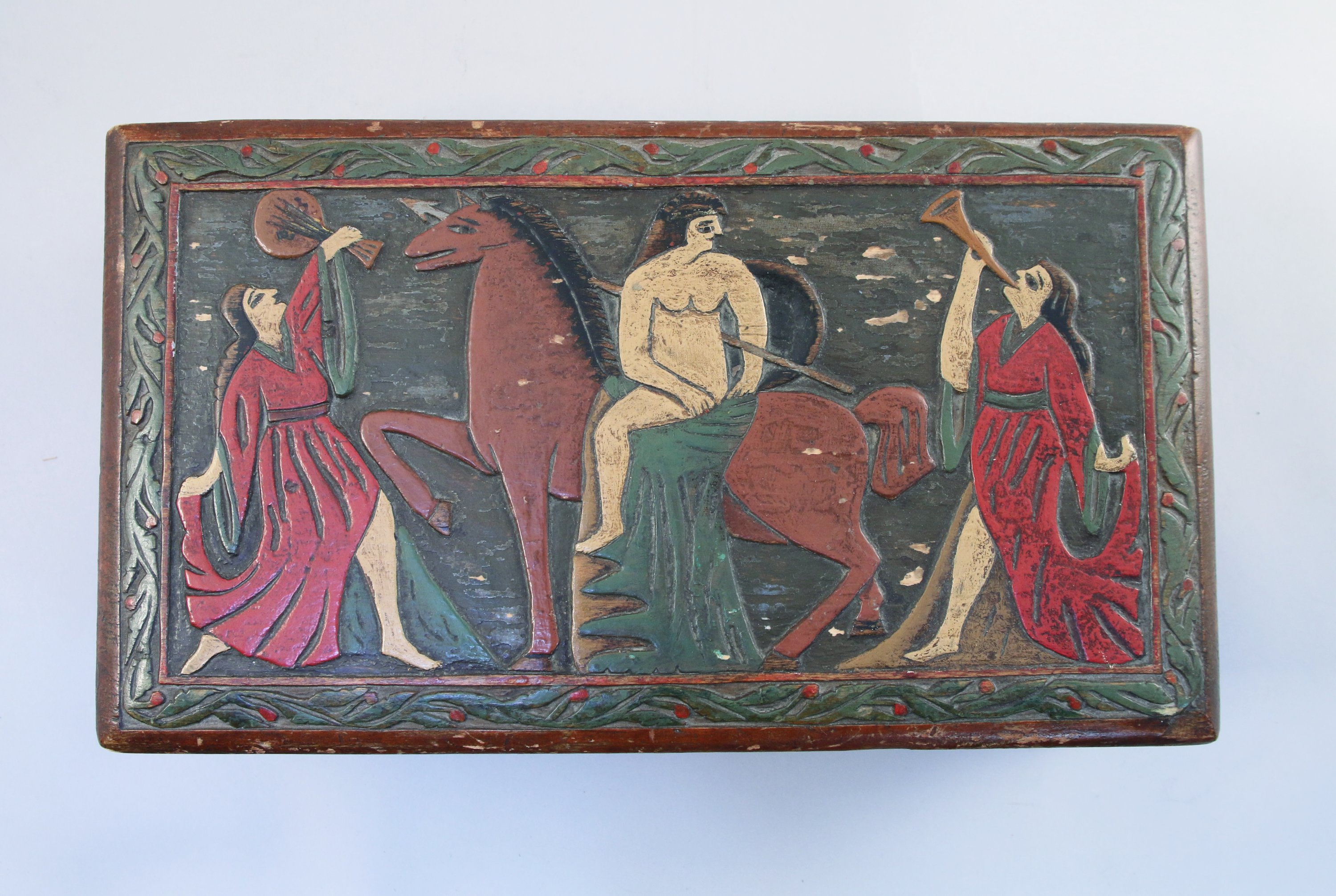 COFFRET AUX LIONS en bois sculpté polychrome de forme quadrangulaire