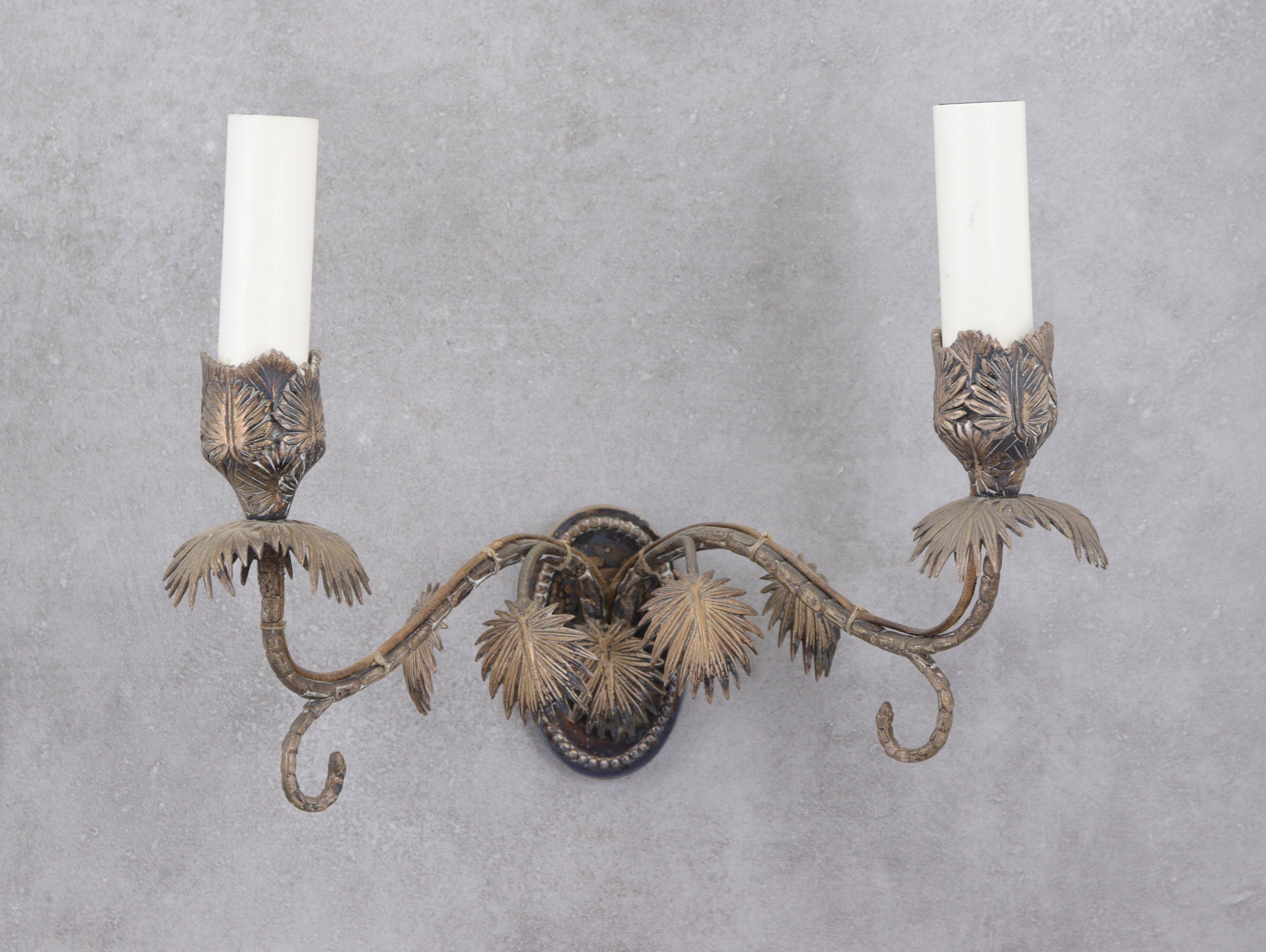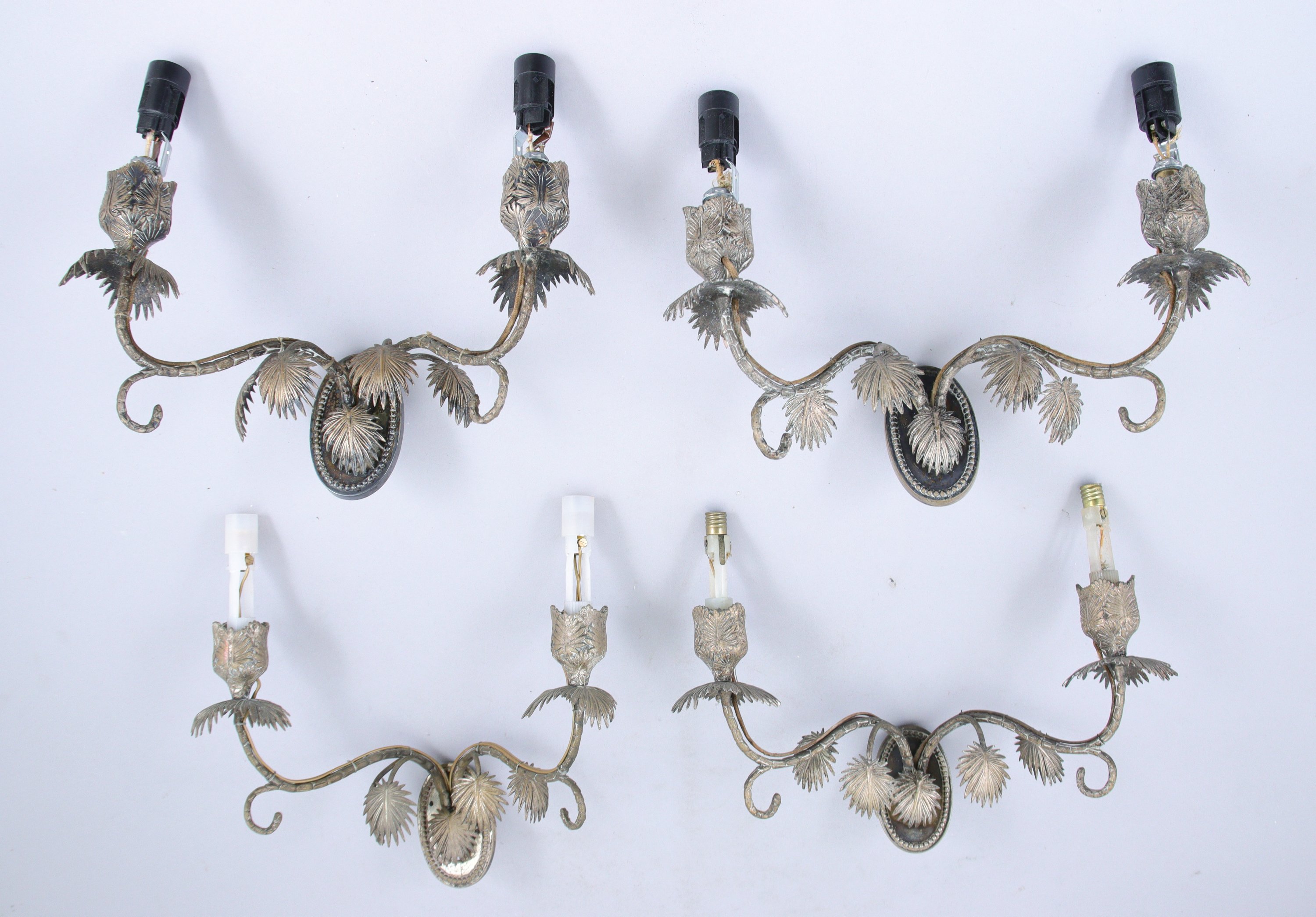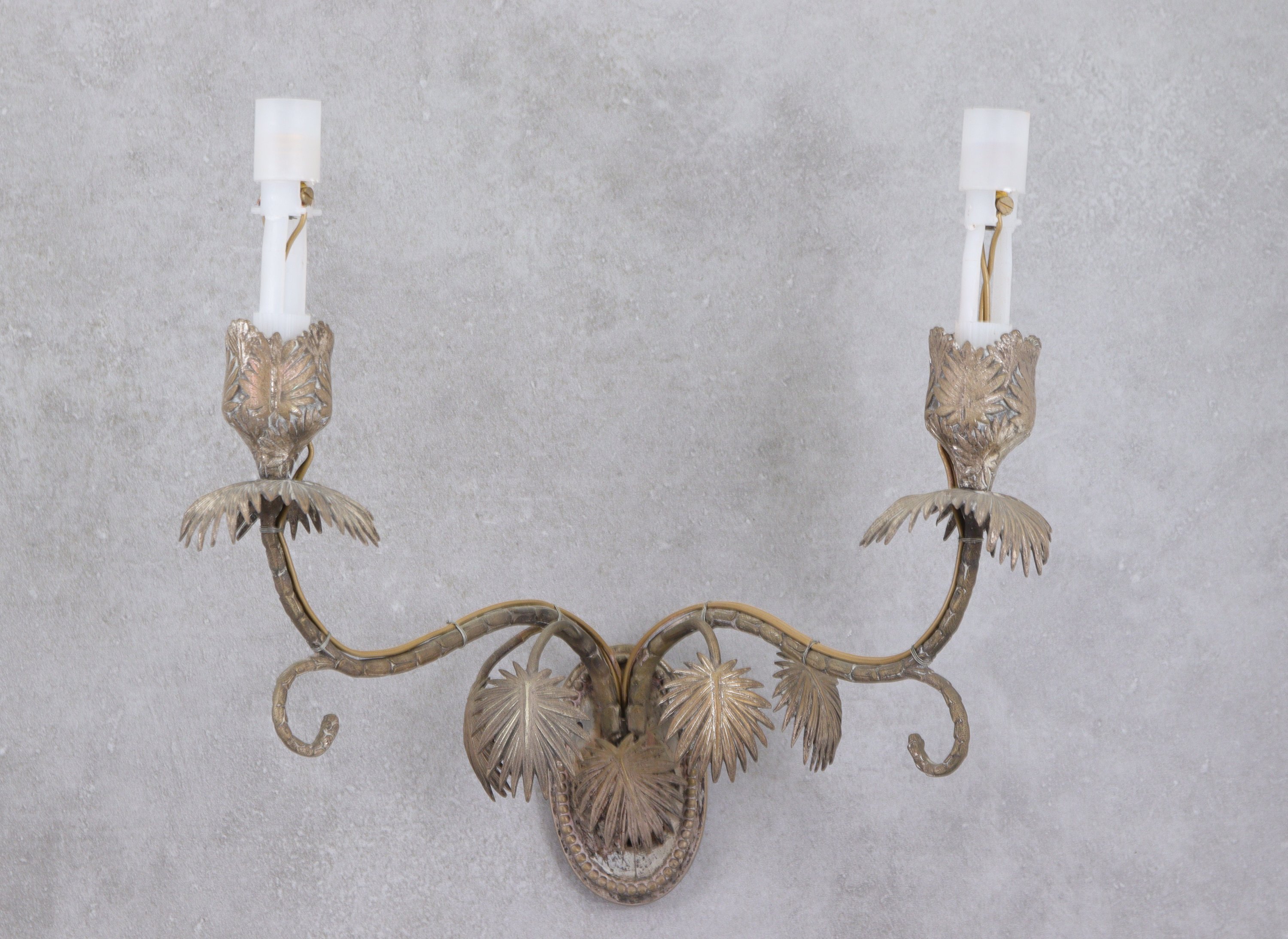 CURIEUSE SUITE DE QUATRE APPLIQUES AUX PALMIERS en métal. Deux bras de lumières en tronc de palmier feuillagés sont réunis sur une entrée de serrure médaillon à frise de perles.