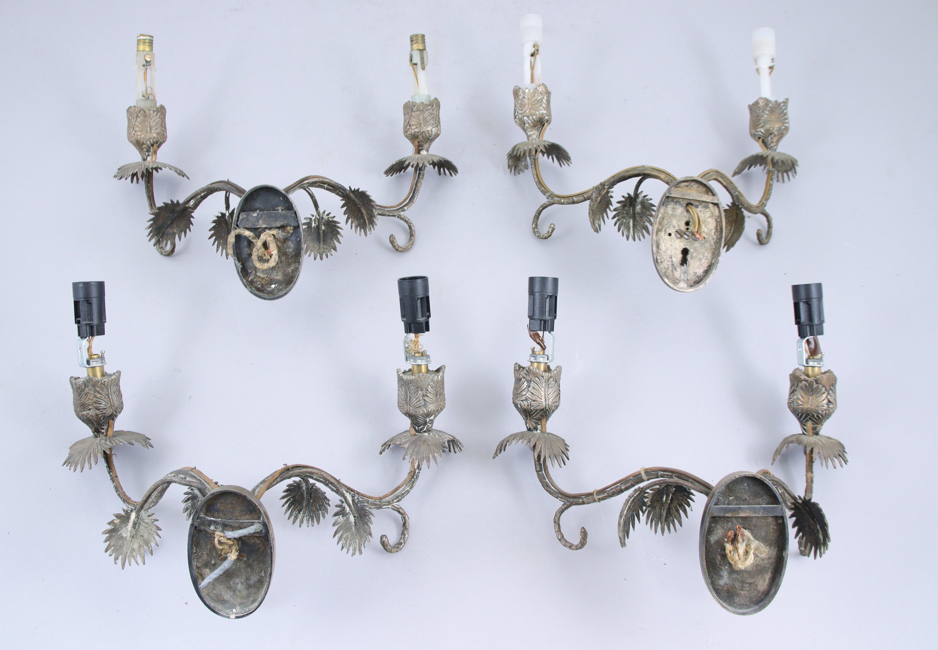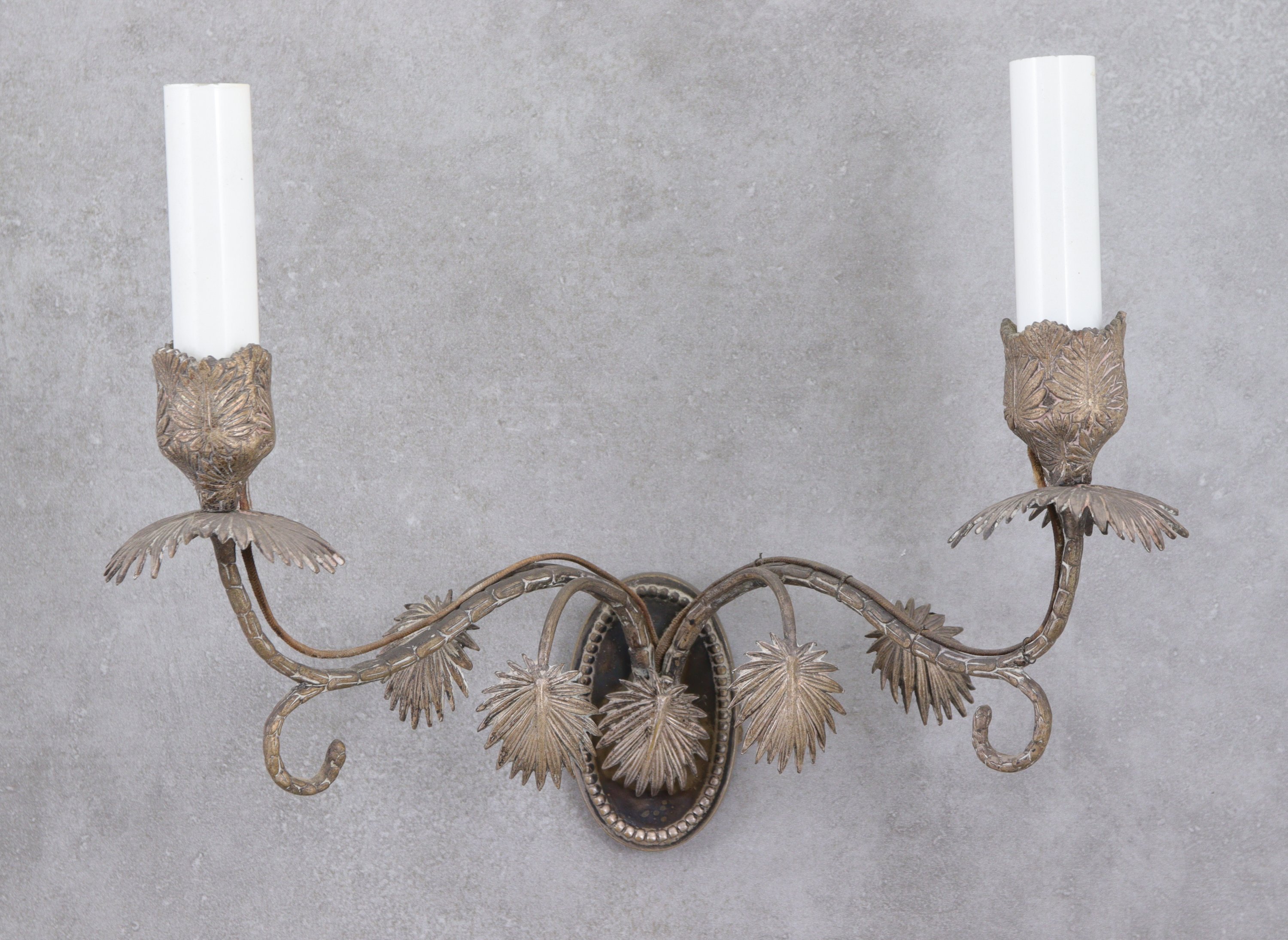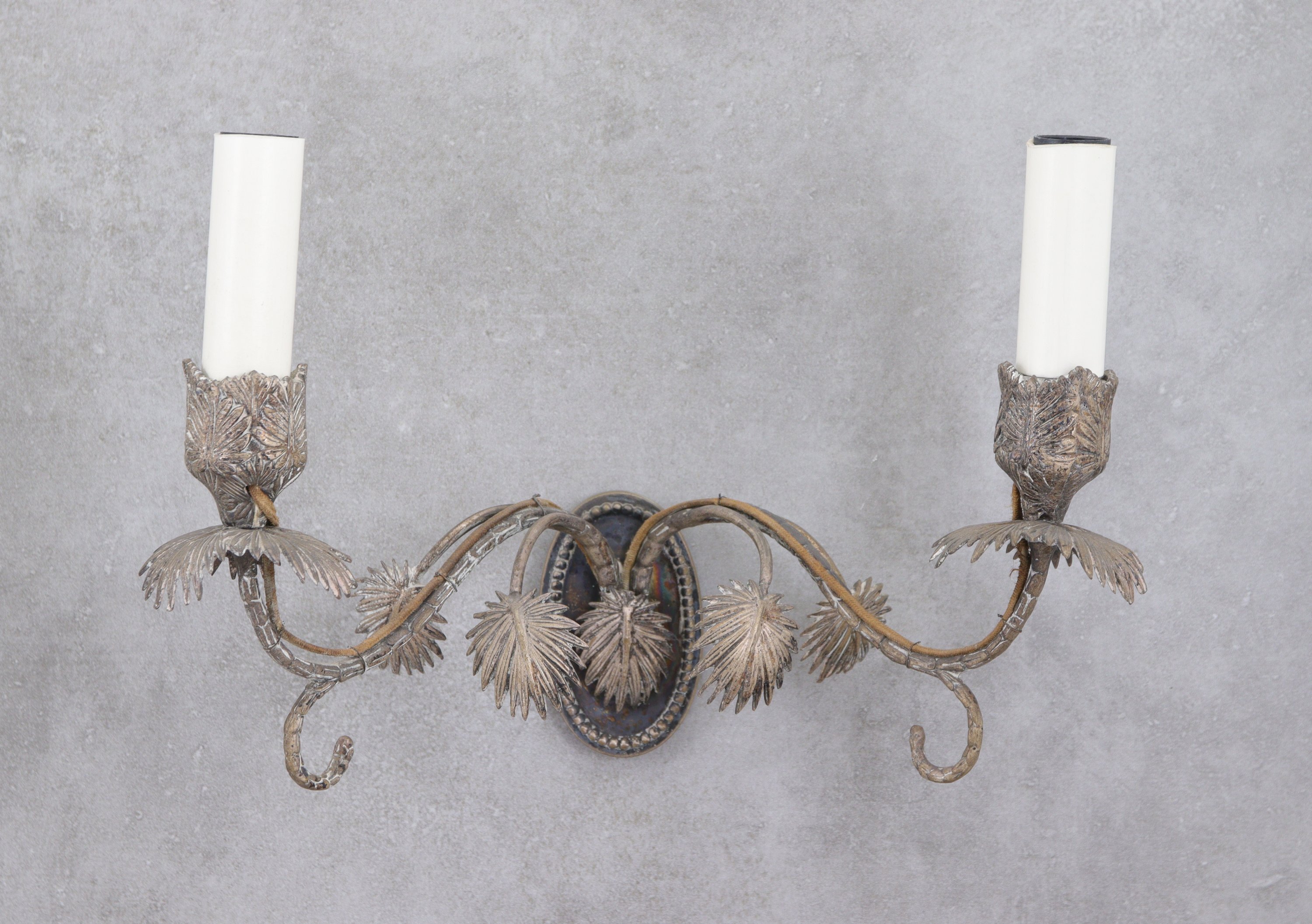 CURIEUSE SUITE DE QUATRE APPLIQUES AUX PALMIERS en métal. Deux bras de lumières en tronc de palmier feuillagés sont réunis sur une entrée de serrure médaillon à frise de perles.