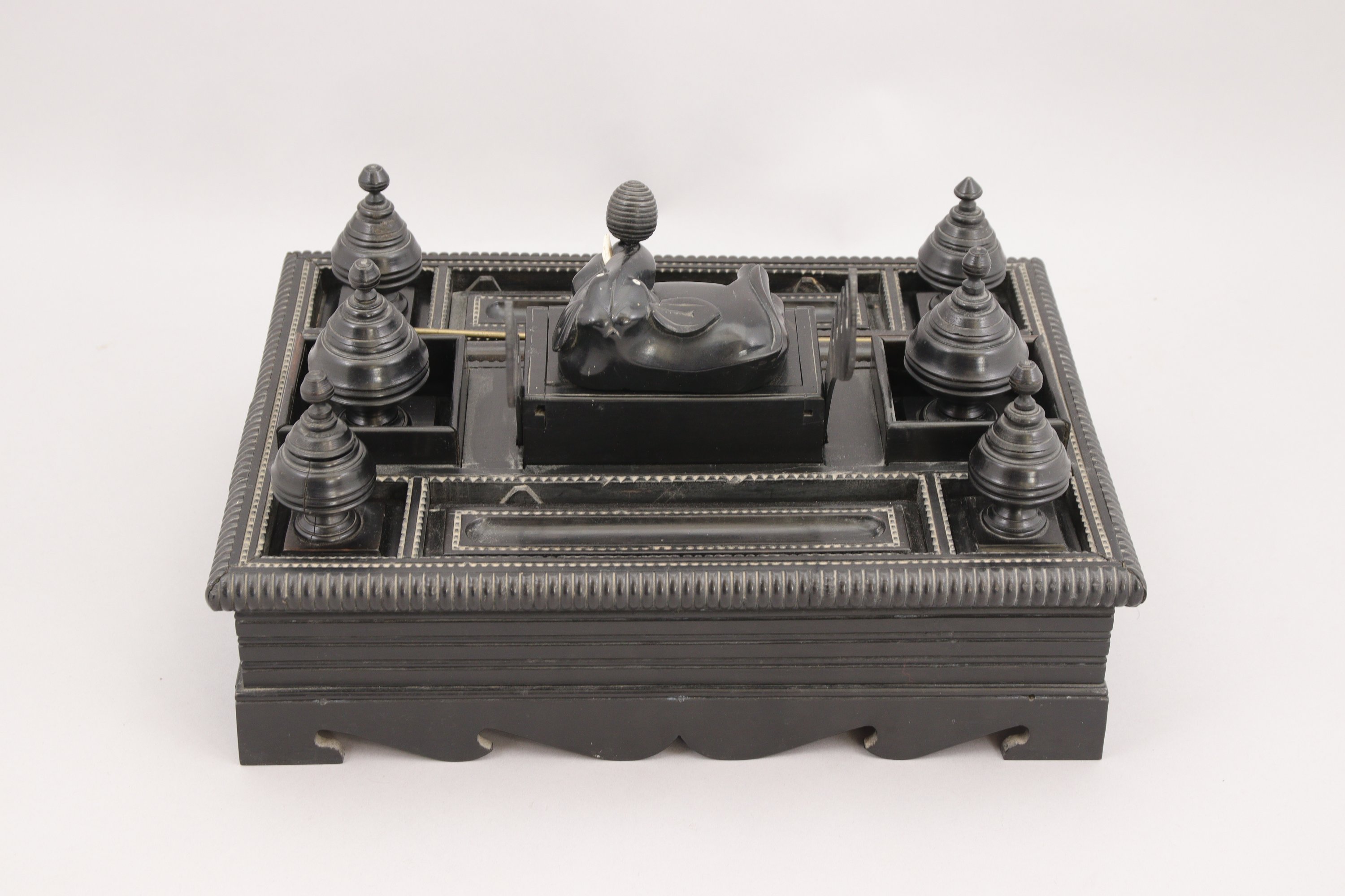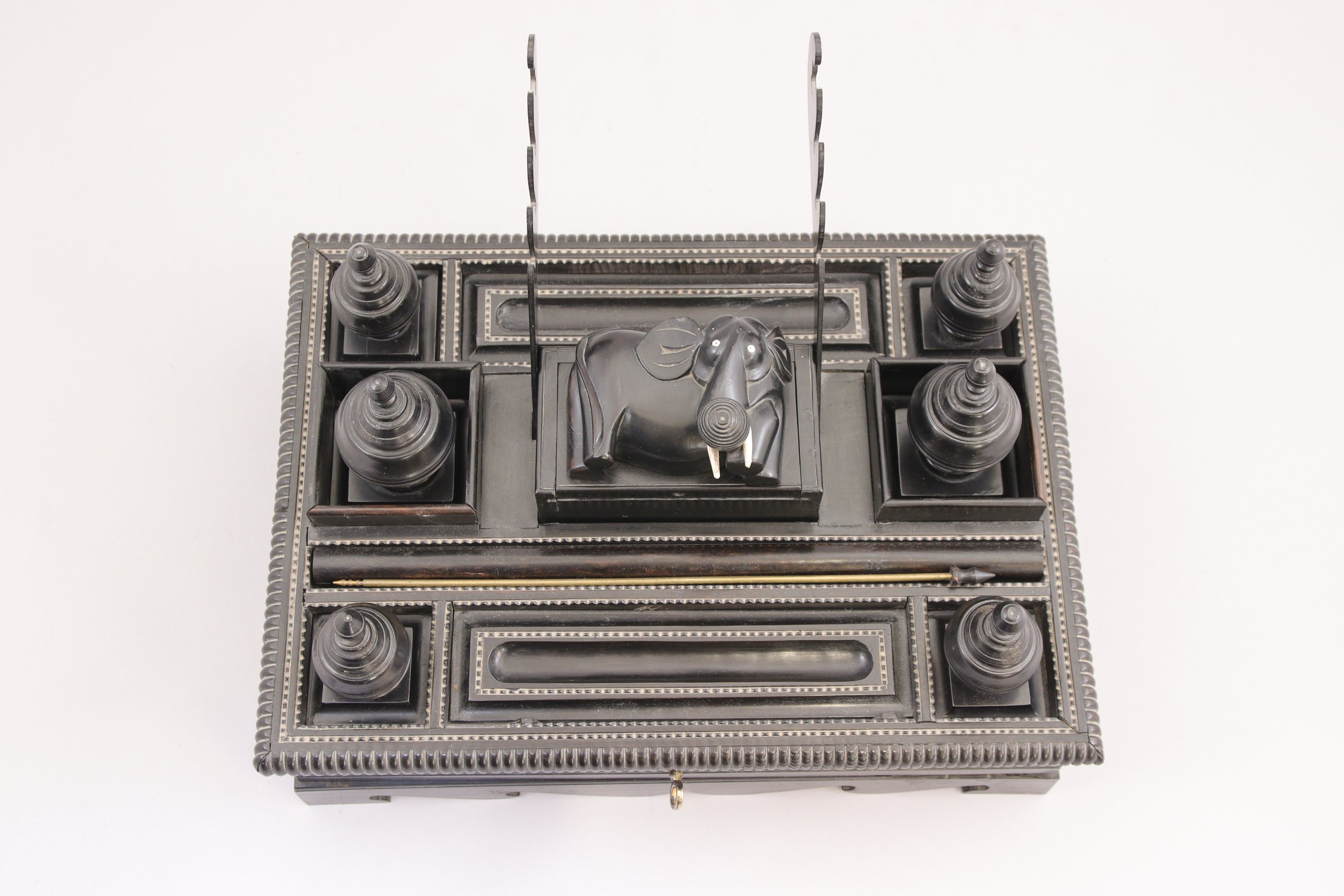 La partie supérieure présente neuf compartiments dans lesquels sont disposés six encriers autour d'une boite centrale ouvrant par un fermoir en forme d'éléphant.