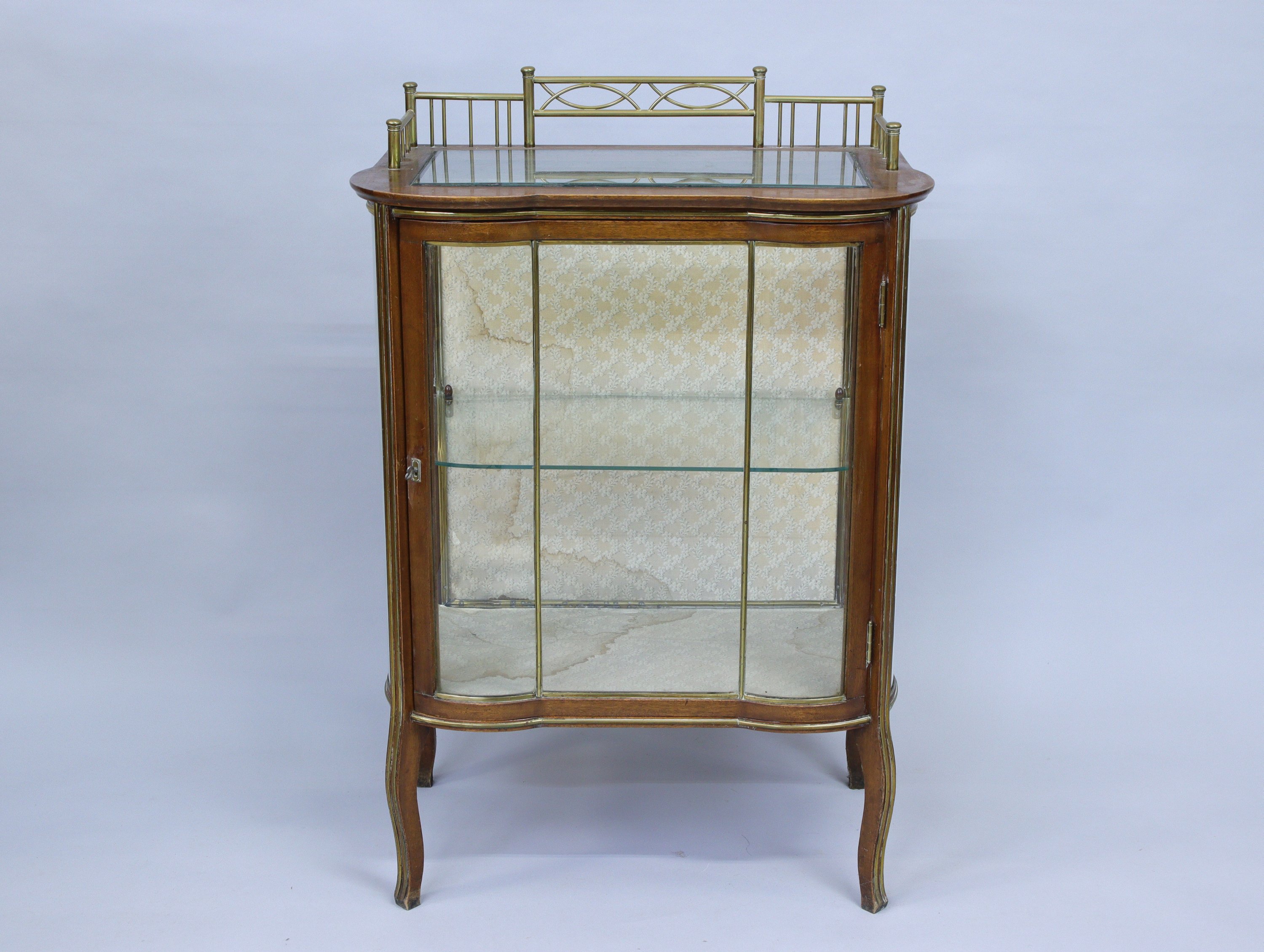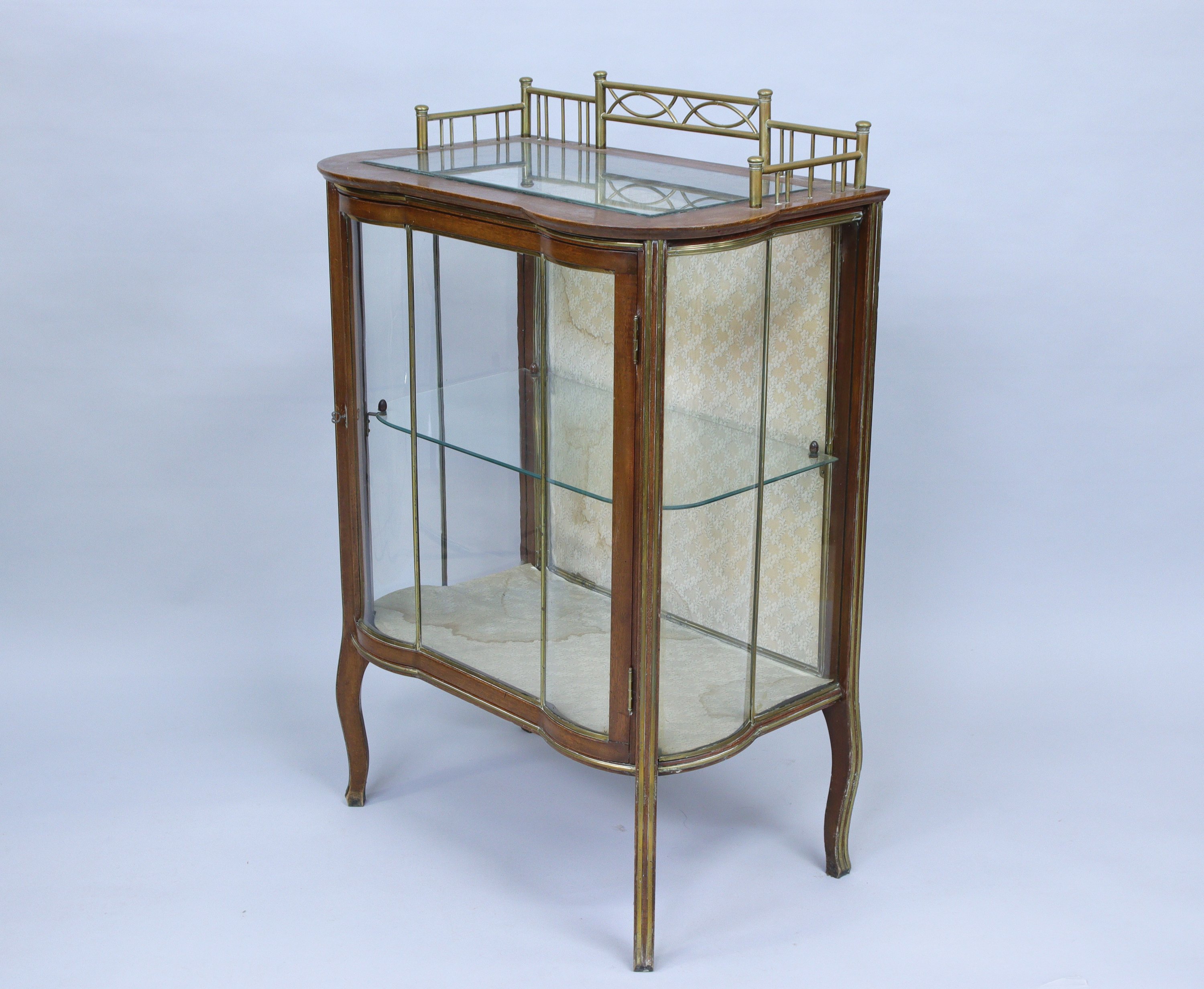 vitrée sur les côtés et le dessus. Elle ouvre par une porte galbée en façade et découvre une étagère en verre. Les côtés pareillement bombés pour partie. La vitrine est sommée d'une galerie en cuivre. Des lingotières en cuivre ornent les montants, les pieds et le contour des vitres. Piètement contourné. L'intérieur tapissé.