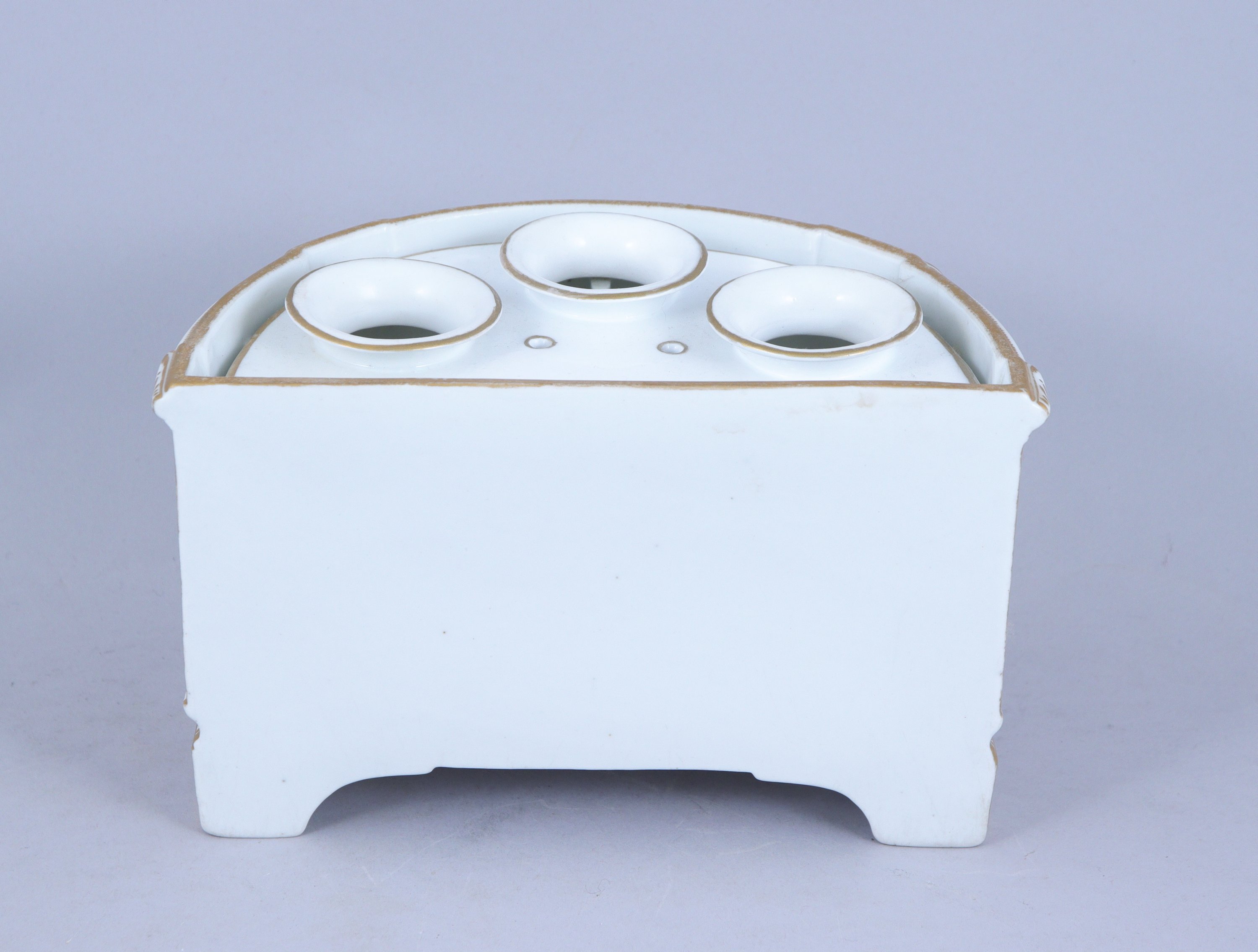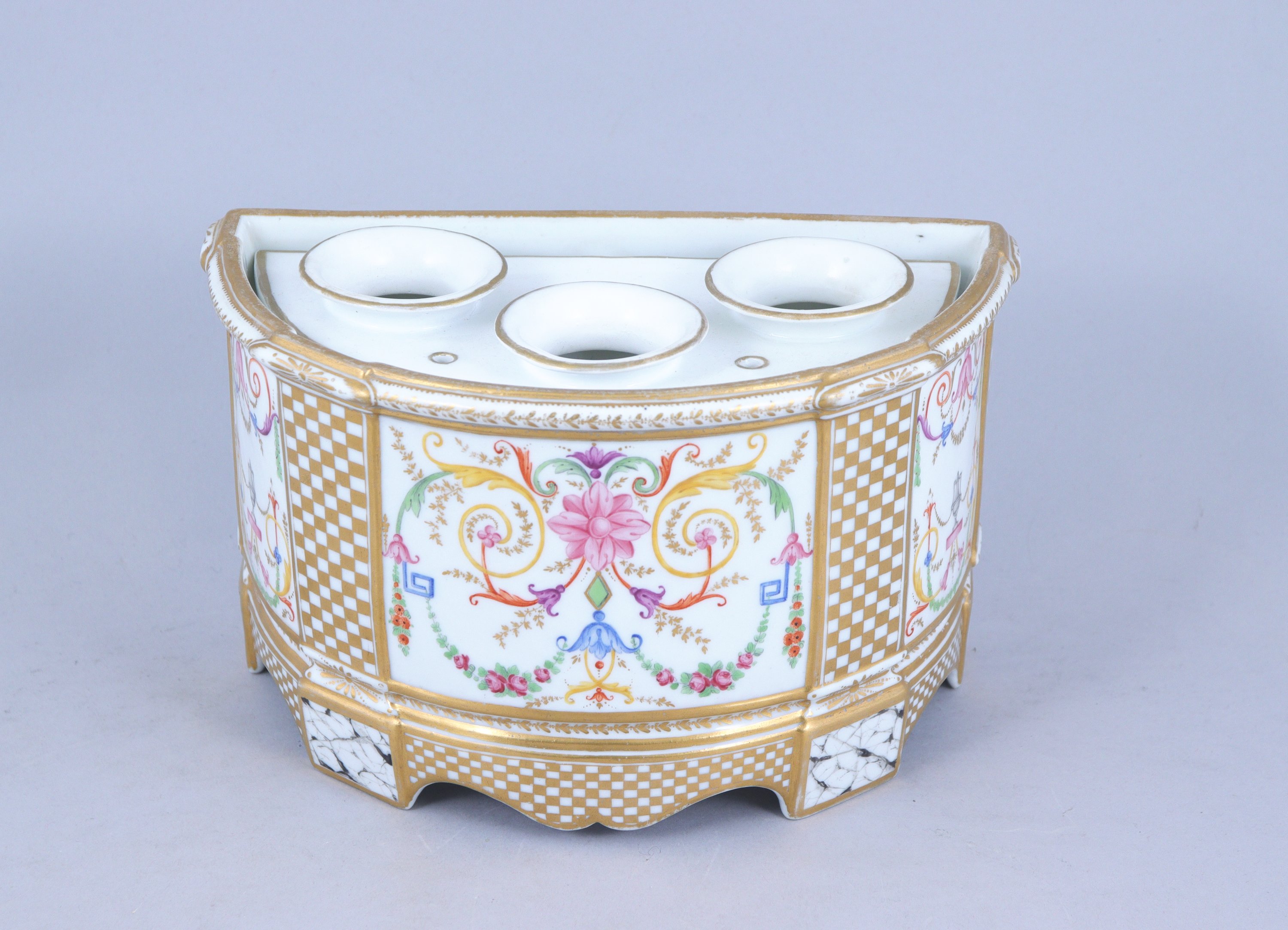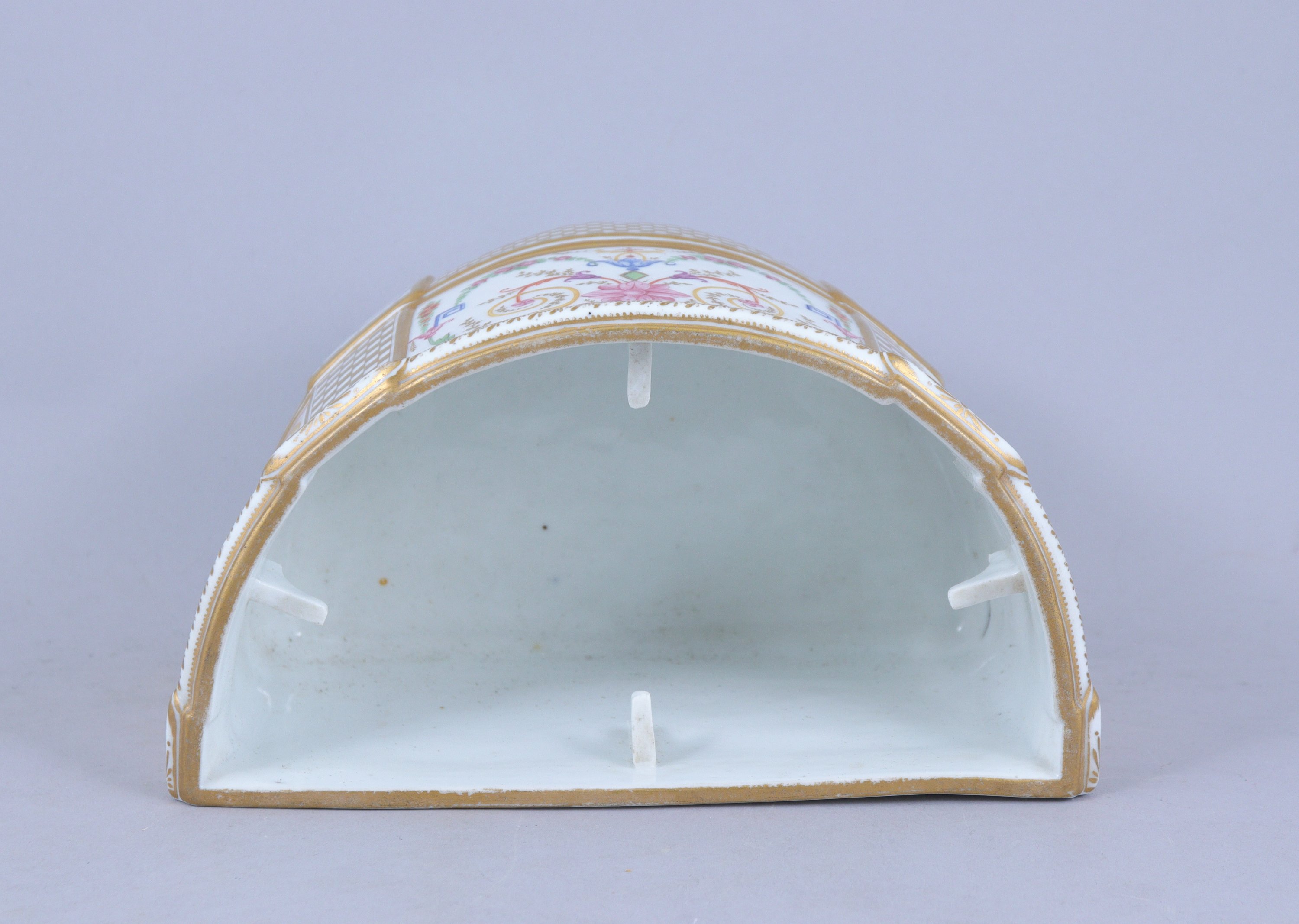 BOUQUETIÈRE DEMI LUNE en porcelaine à décor polychrome dans trois réserves, quadrillage blanc et or et rectangle imitant le marbre. La plaque triplement perforée amovible. Marqué en bleu avec la lettre 'A' couronné.