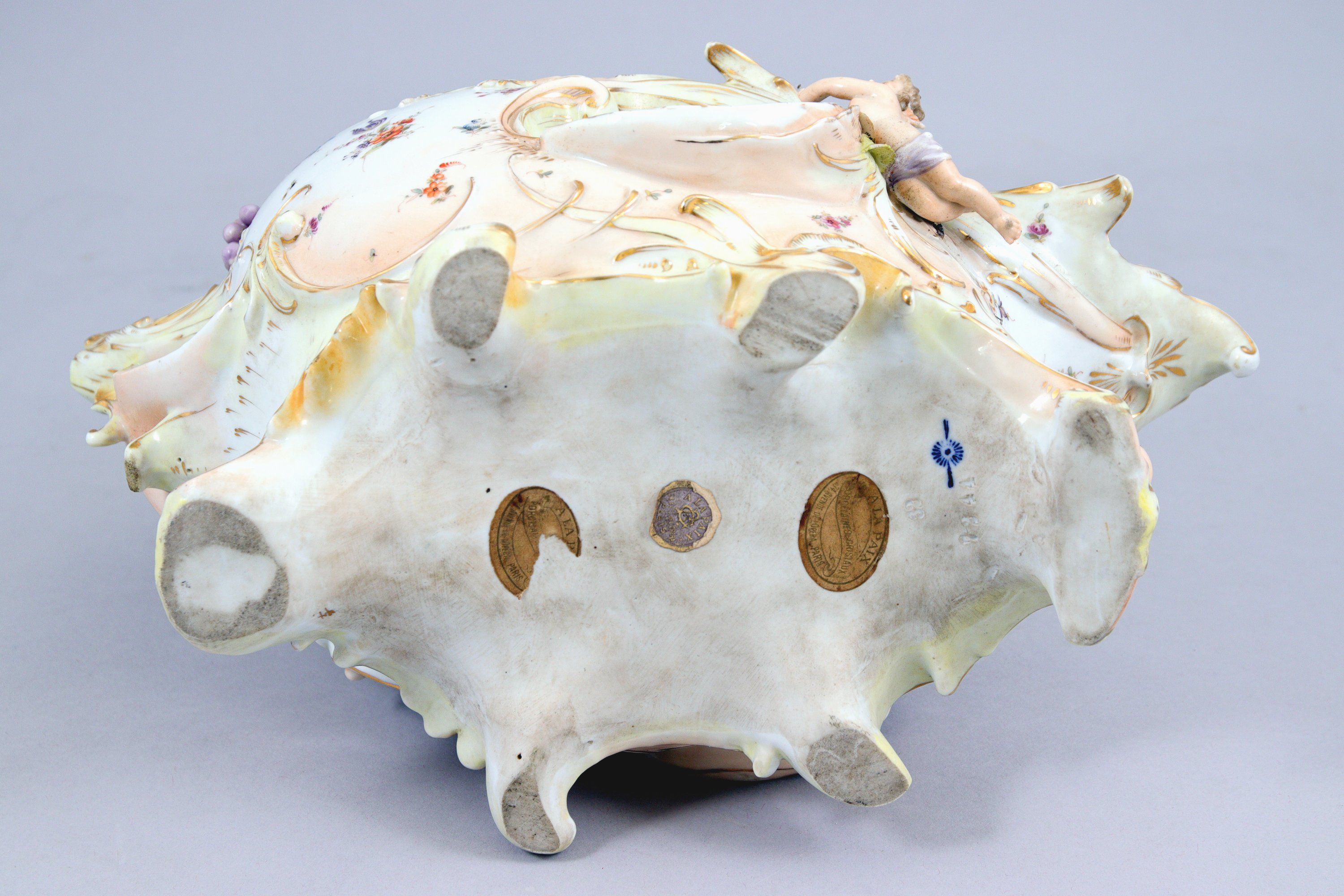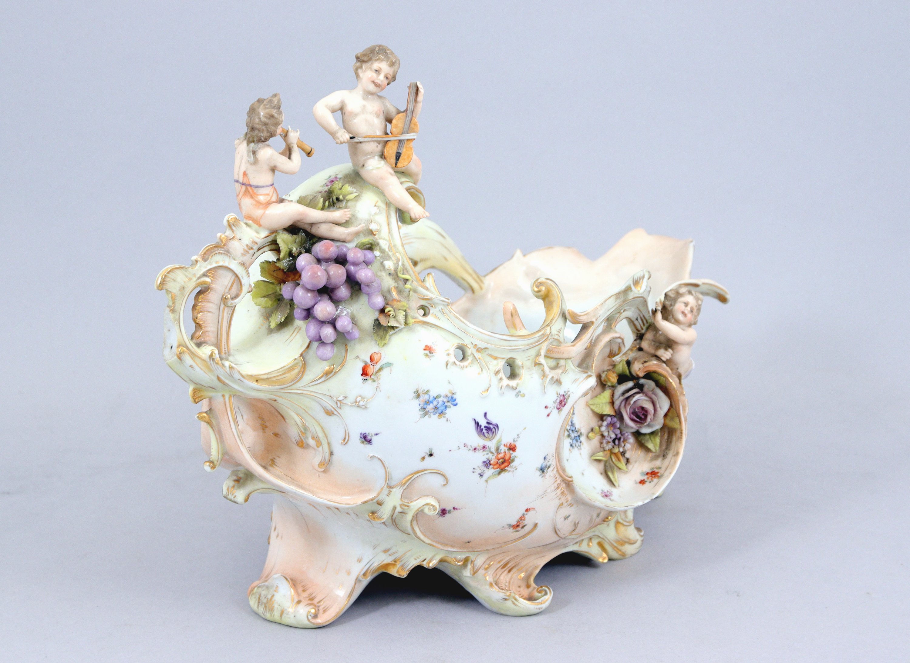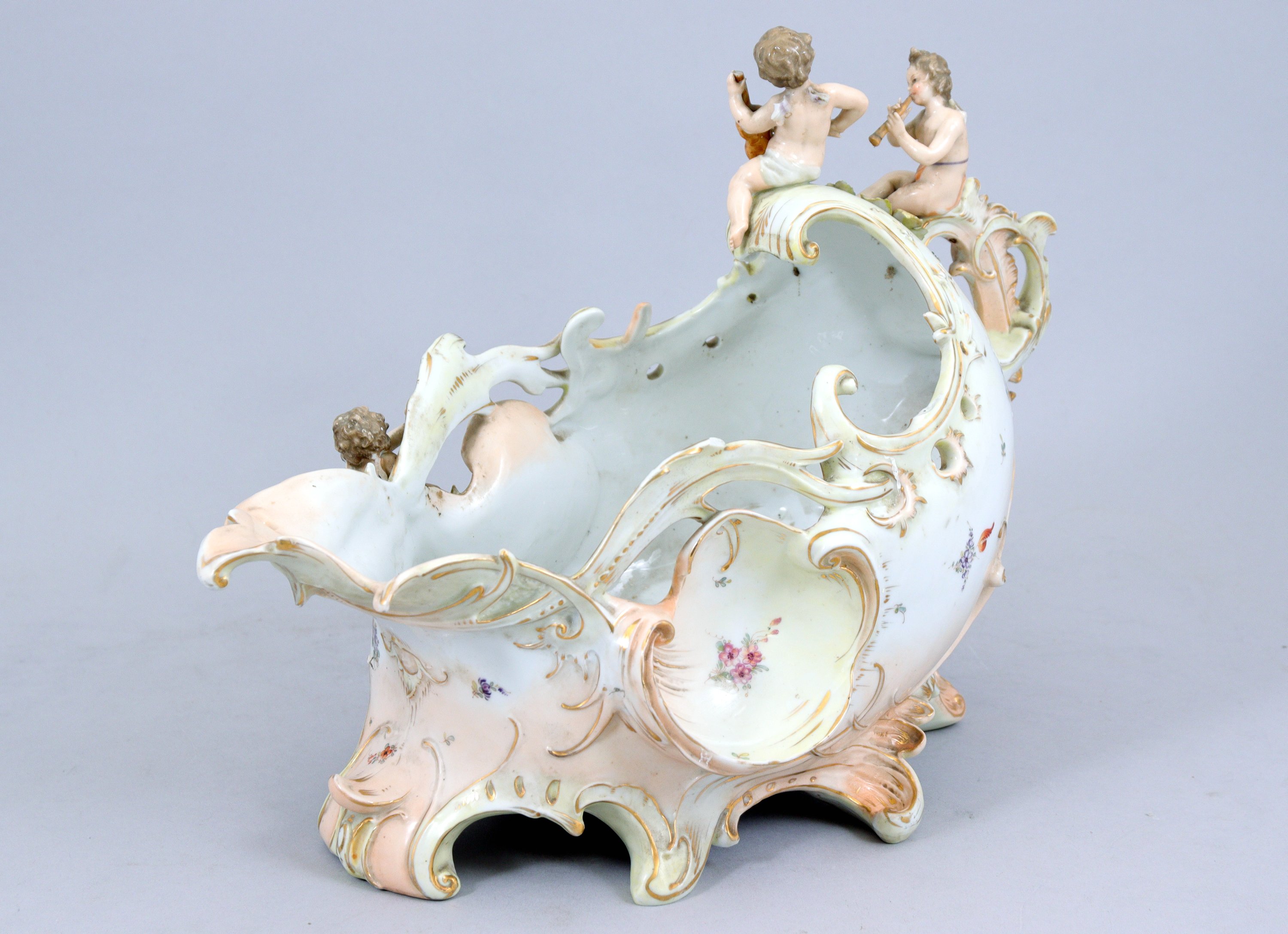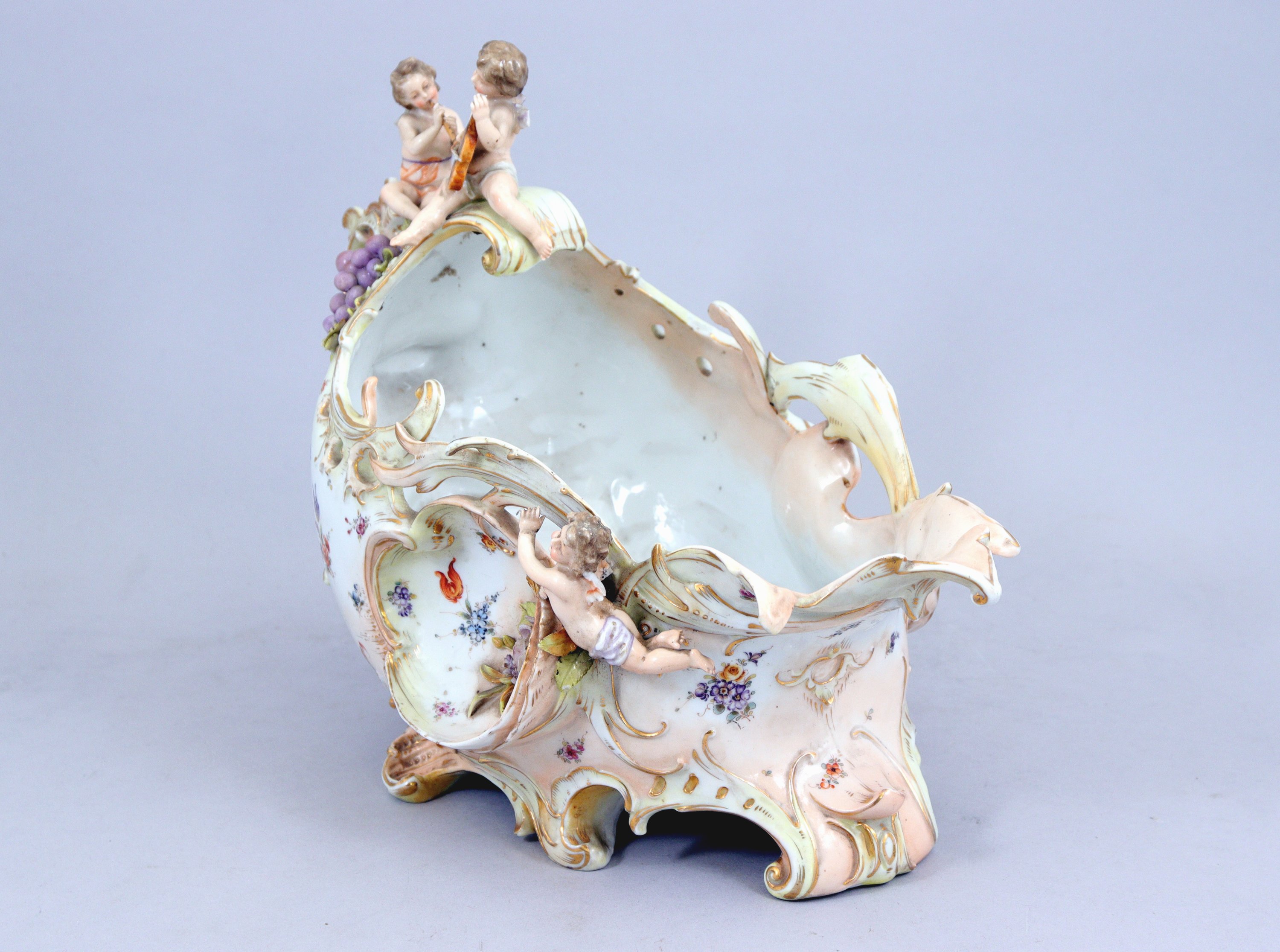 de forme mouvementée à décor ajouré et rehauts polychrome en relief, figurant des putti musiciens, fleurs et fruits.