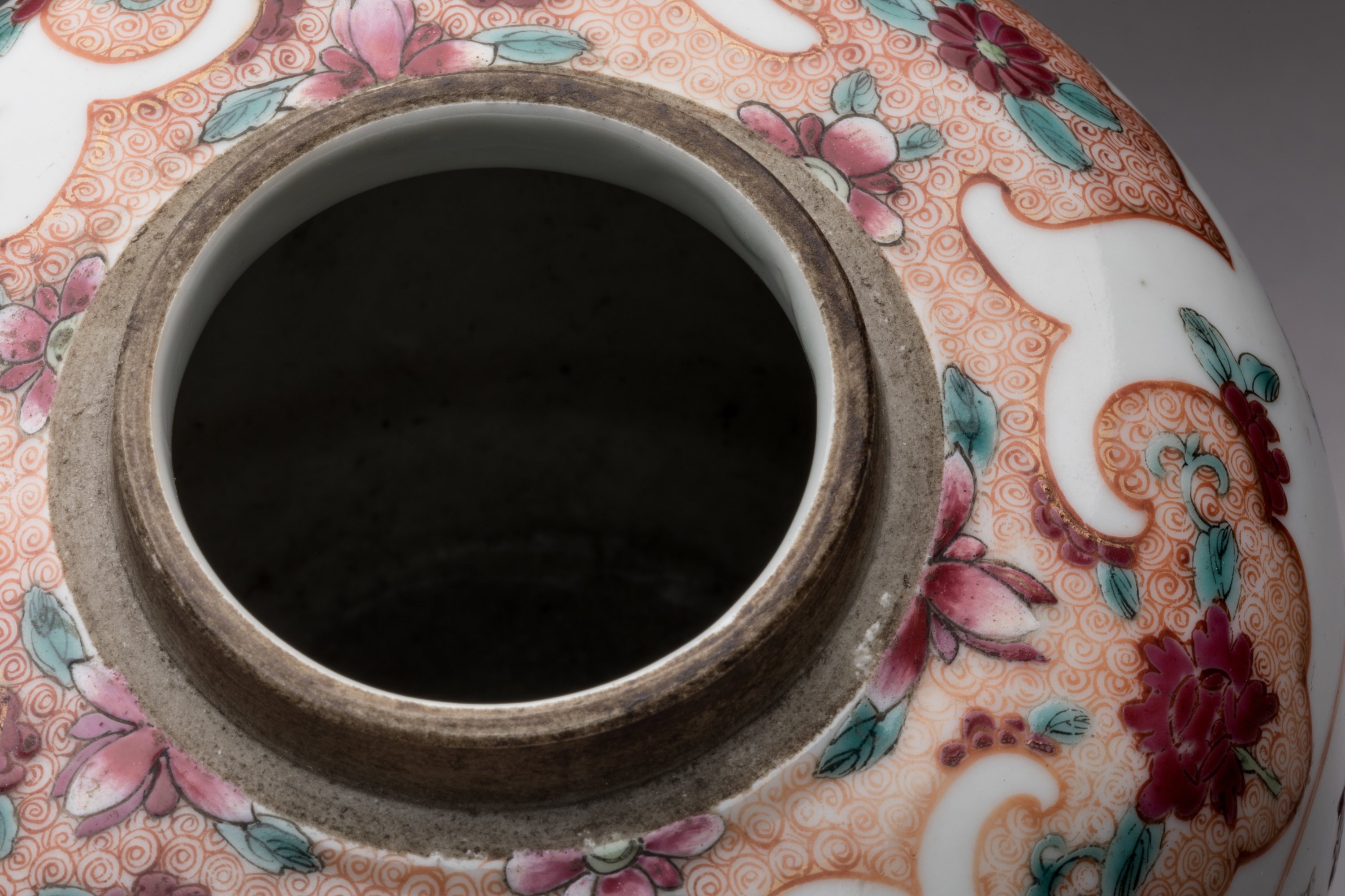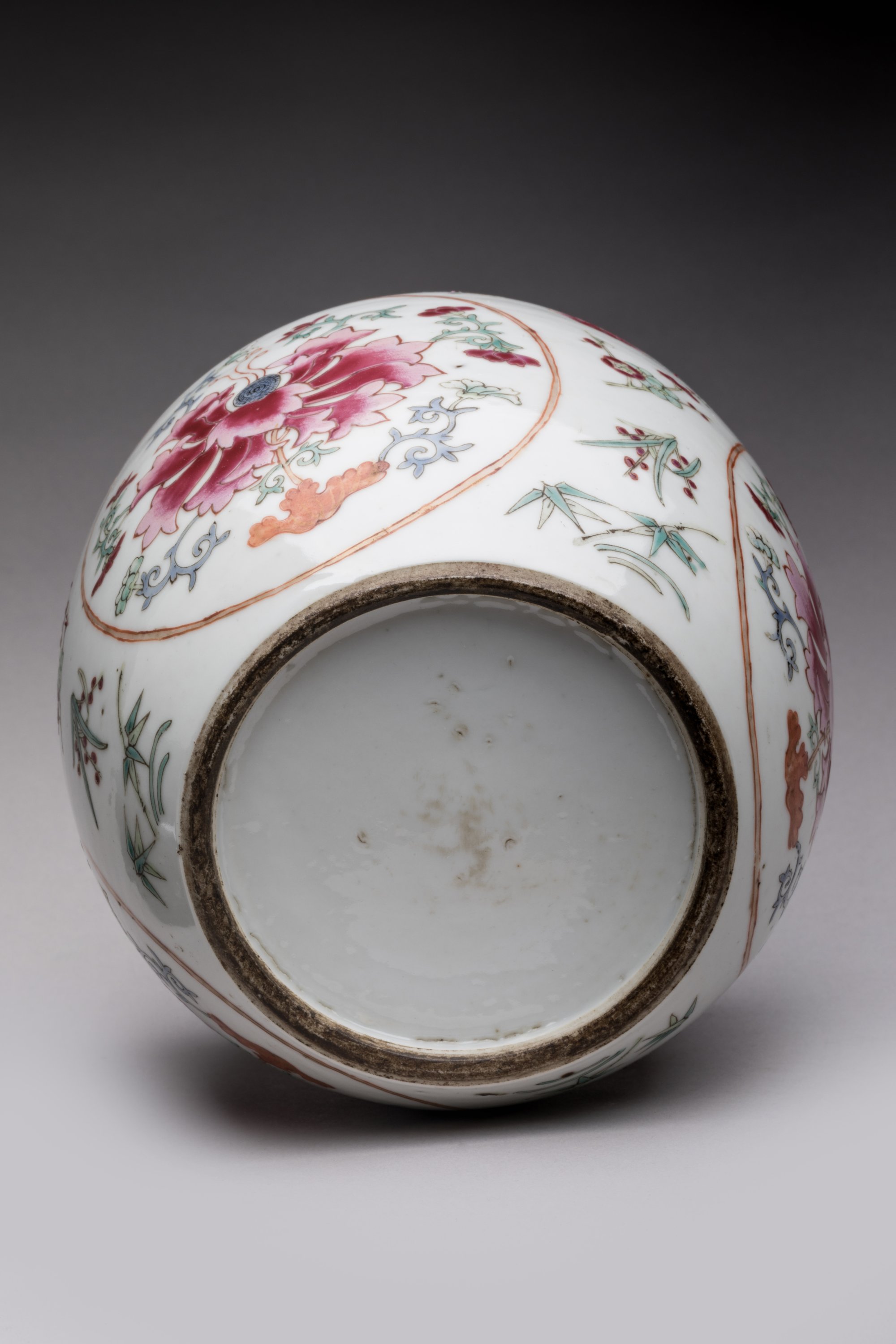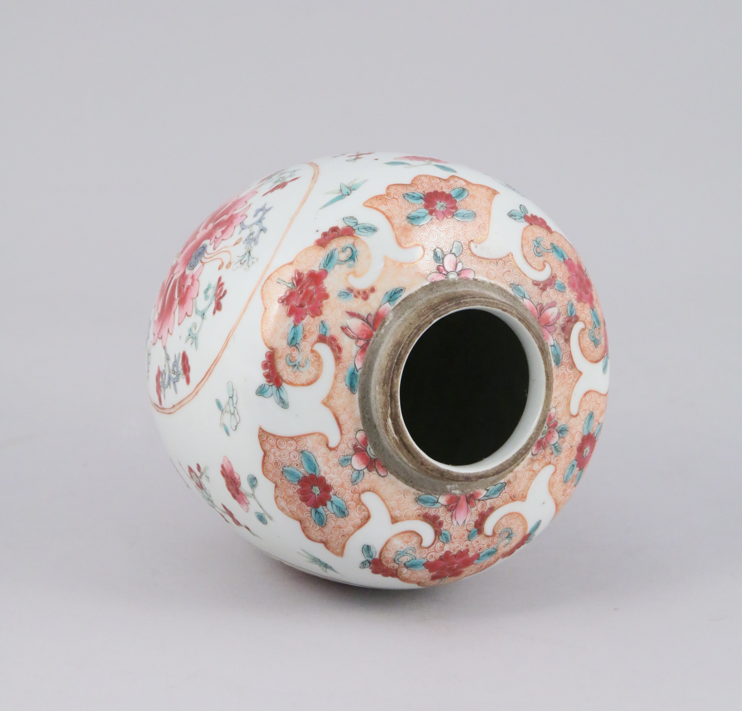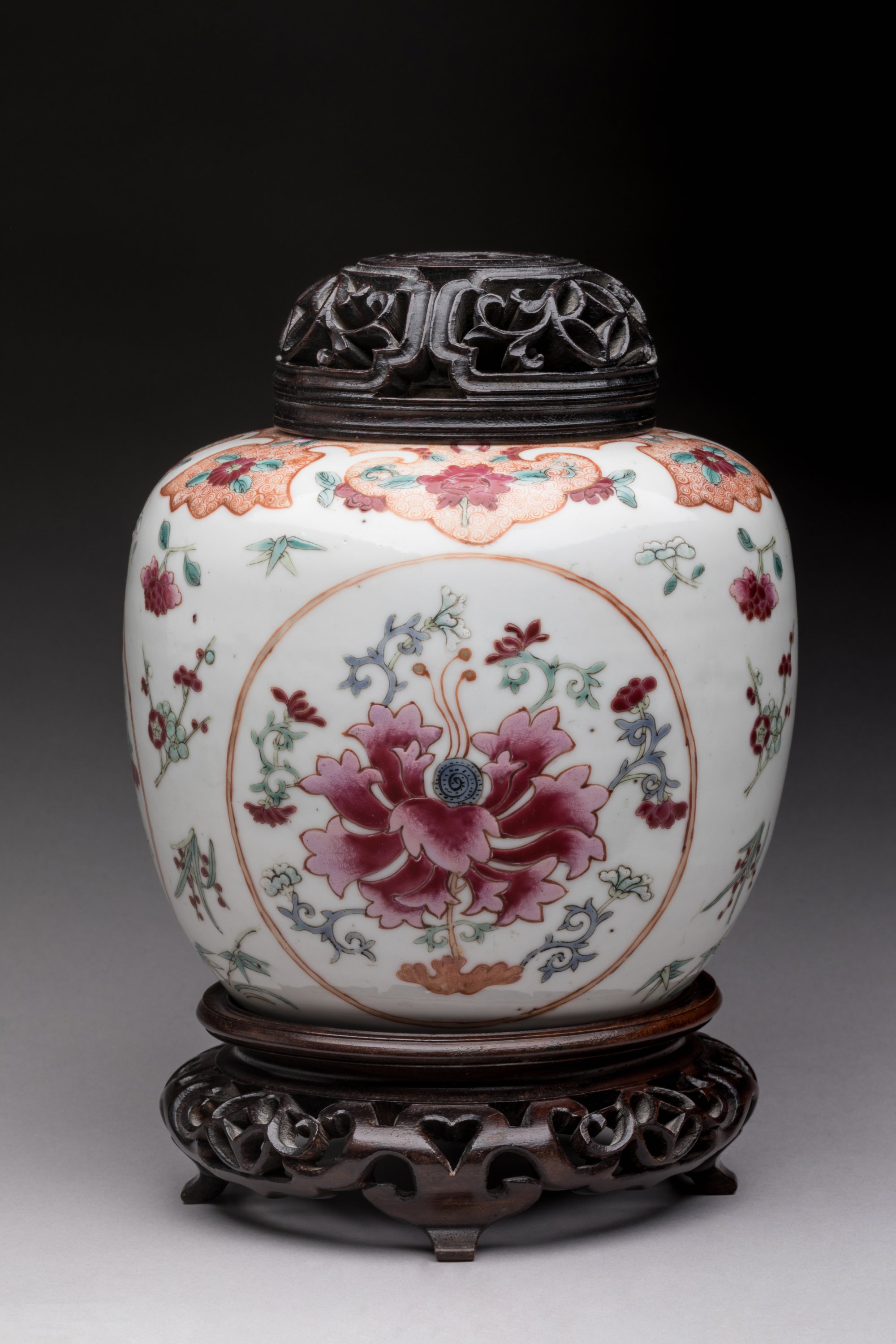 en porcelaine émaillée polychrome dans le style de la famille rose à décor de fleurs dans des médaillons, couvercle et socle en bois reposant sur quatre pieds.