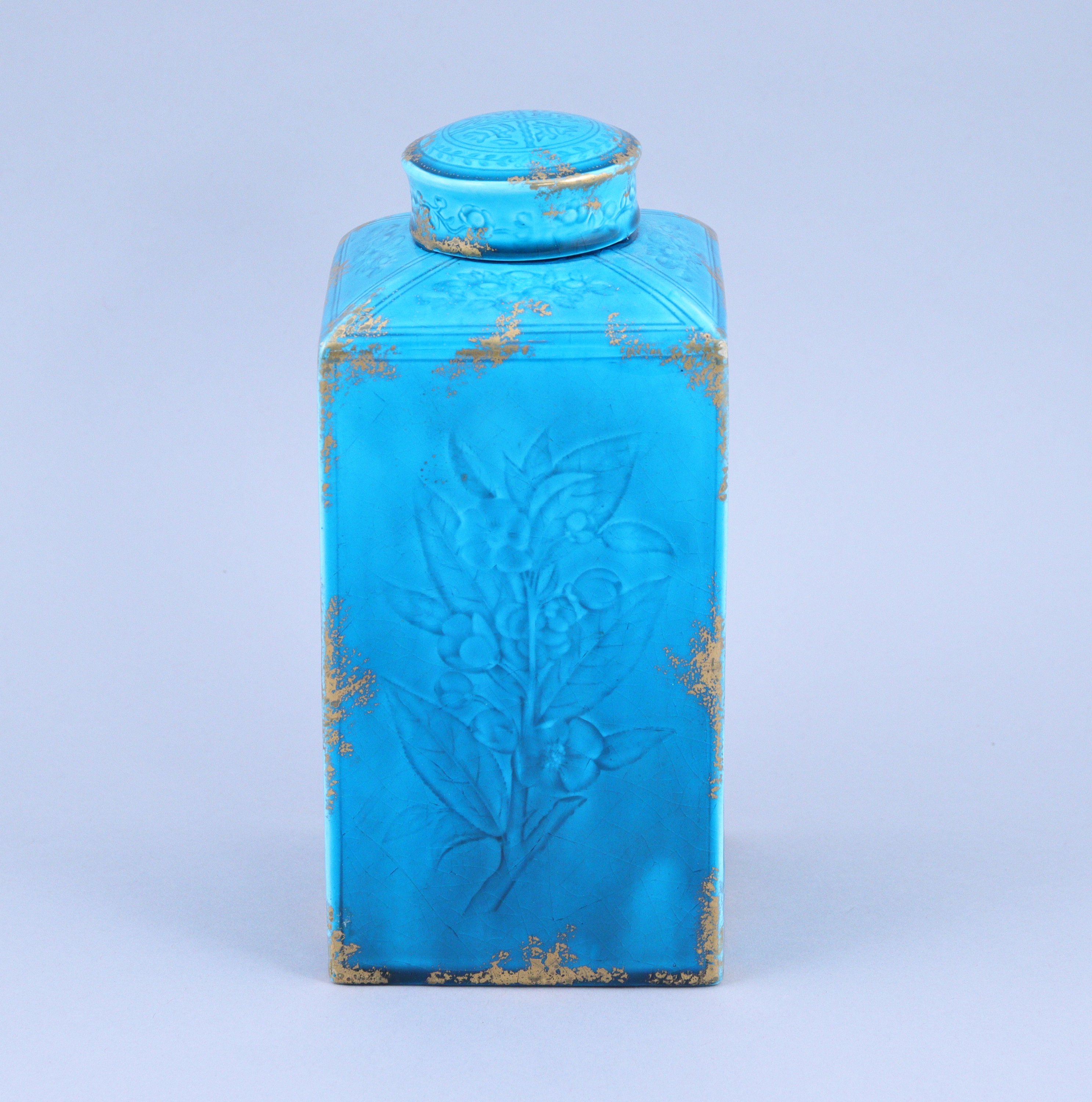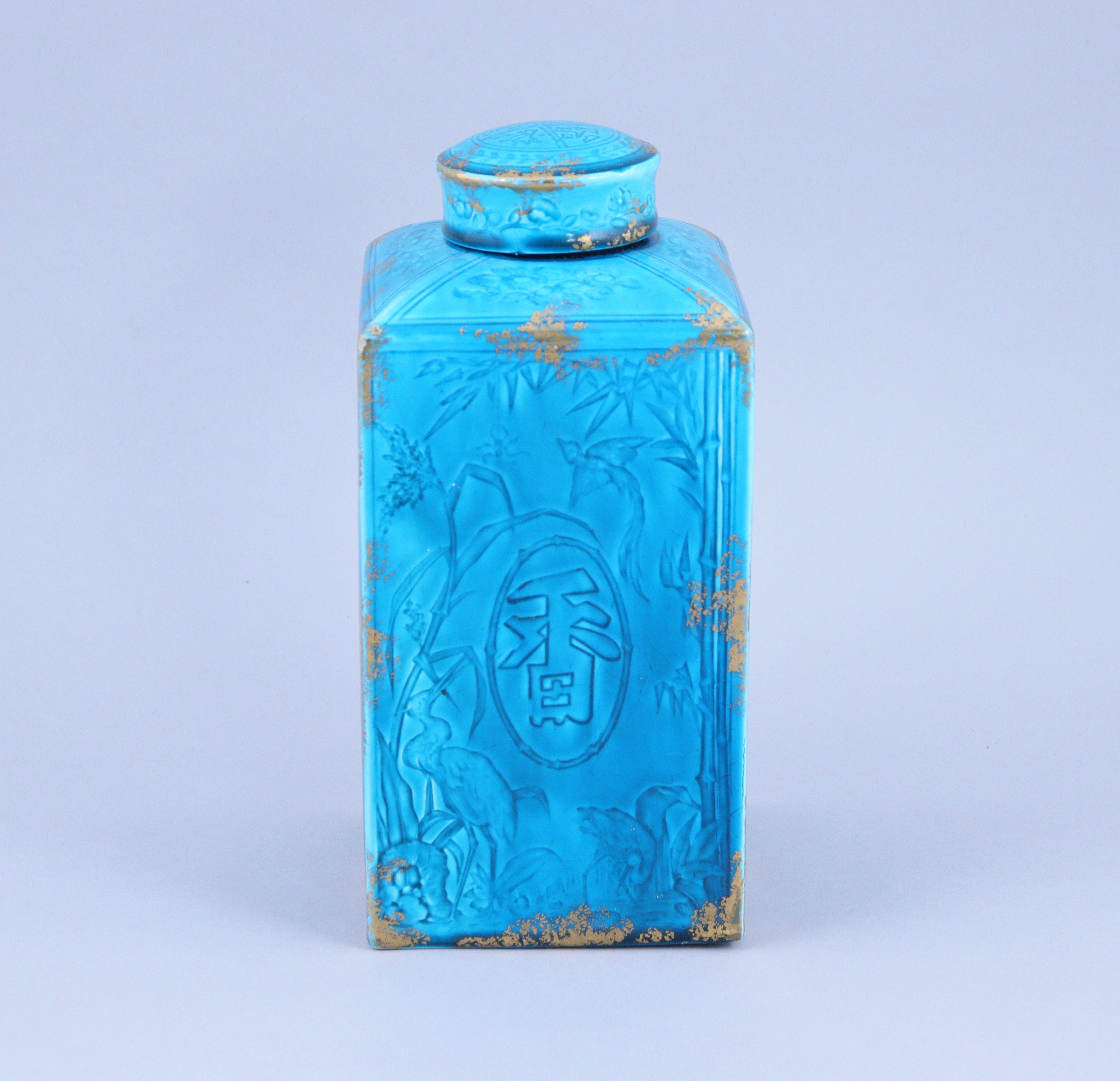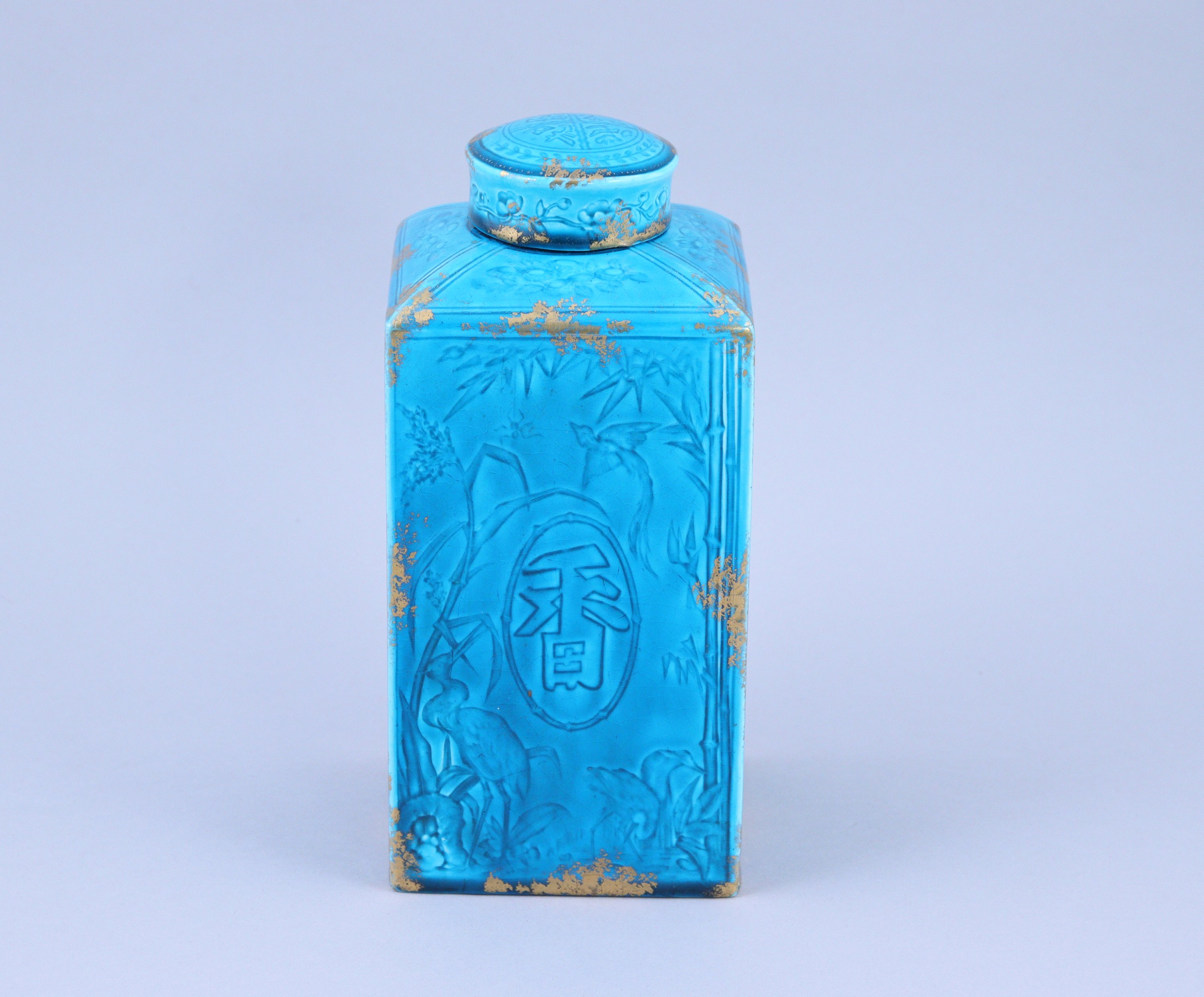 FLACON en faïence emmaillée turquoise avec son bouchon. Décor incisé aux motifs floraux et idéogrammes asiatiques. Traces d'or.