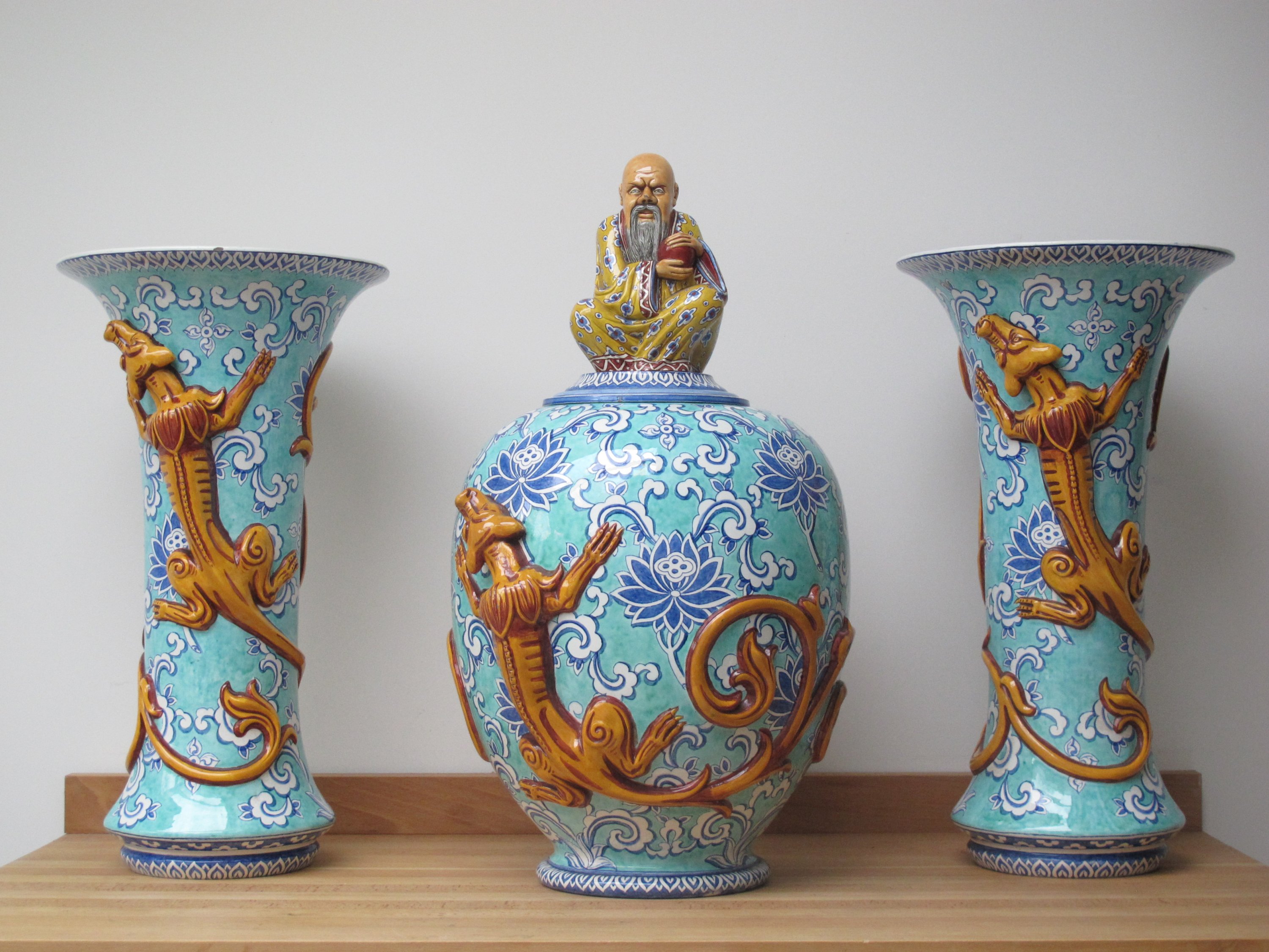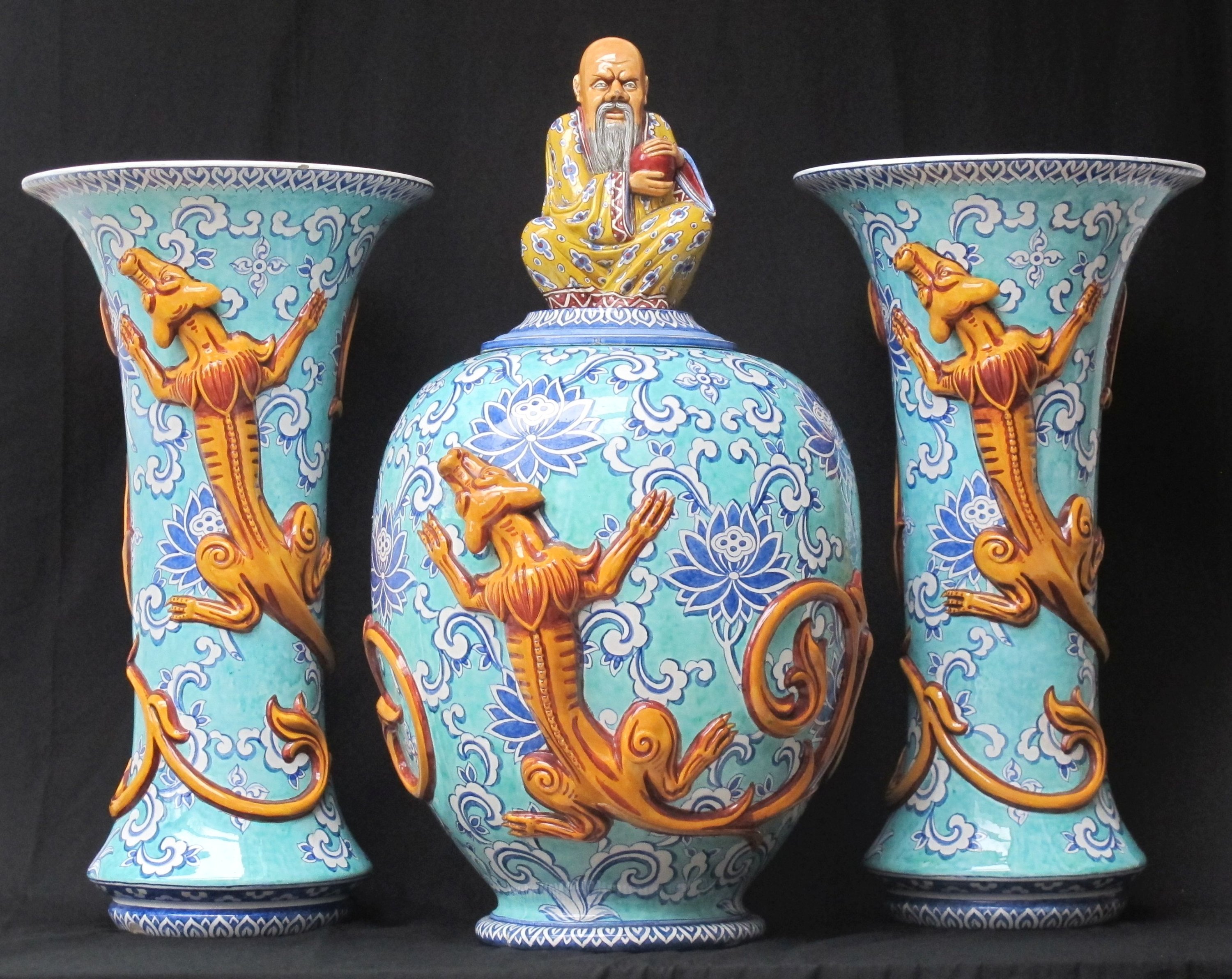 en faïence comprenant une potiche couverte au magot et une paire de vases cornet ornés d'une salamandre en applique de couleur ocre et rouge sur fond de fleurs de lotus en camaïeu émeraude, bleu, et blanc, le Magot vêtu d'une orbe jaune vif.