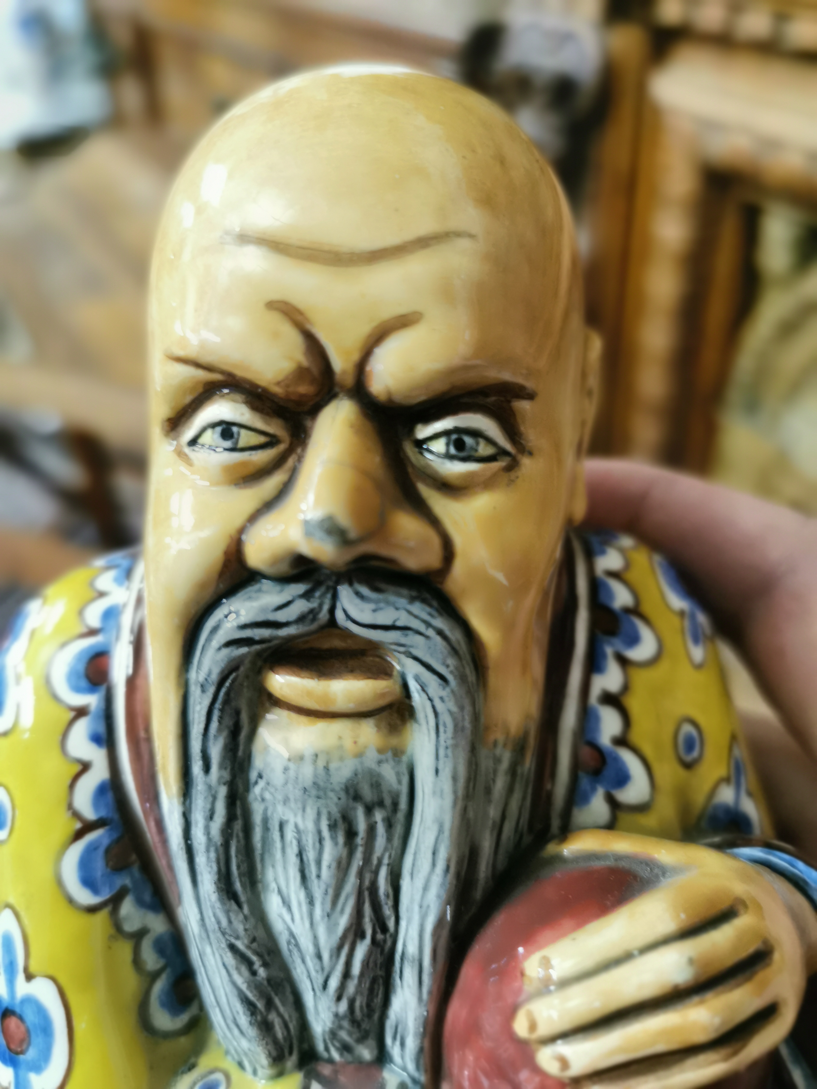 (Un éclat au pied d'un vase dont le col est restauré, accidentent et restauration au nez du magot. En l'état.)