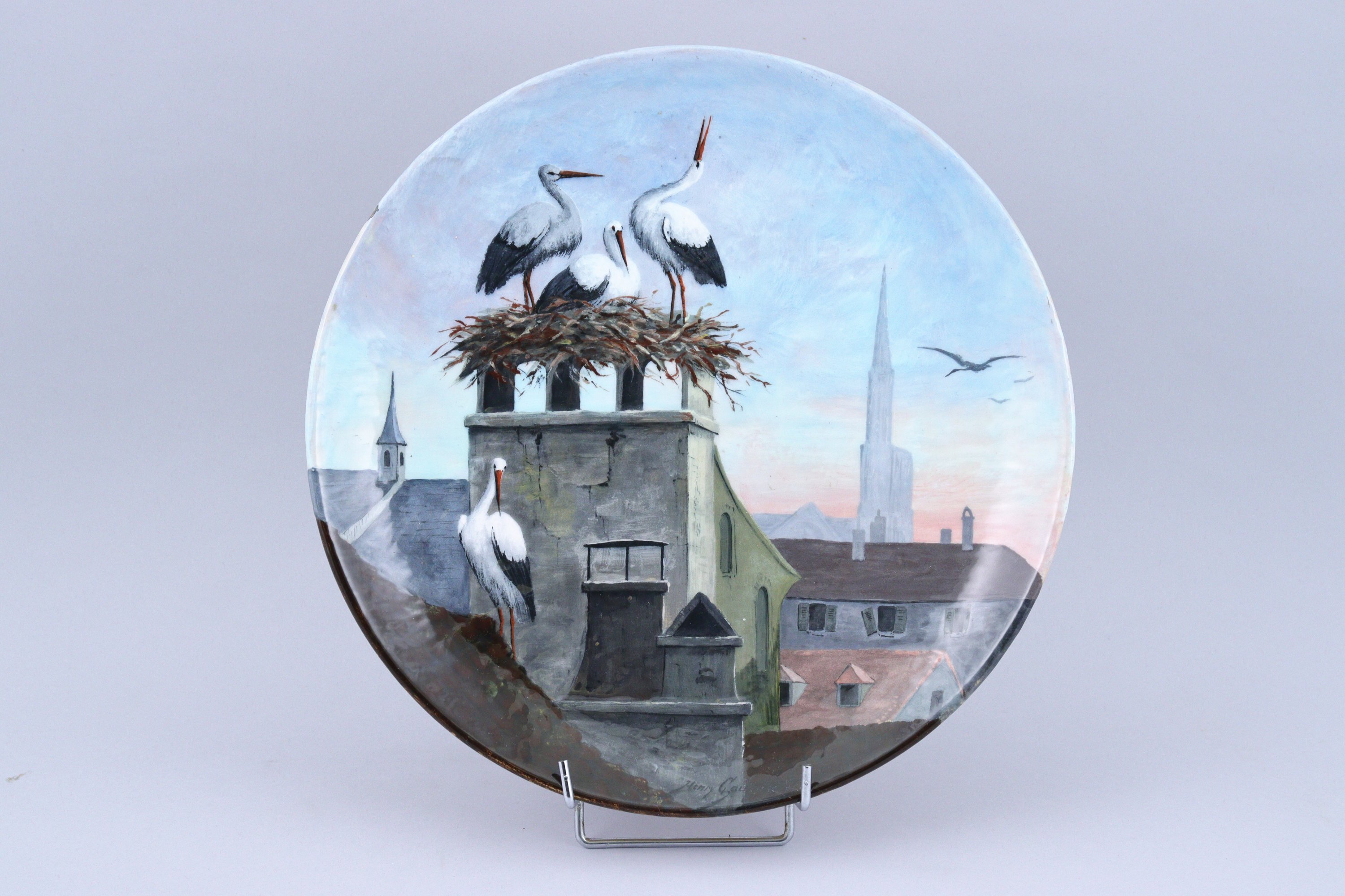 Plat rond en faïence émaillée. Signé en bas à droite.