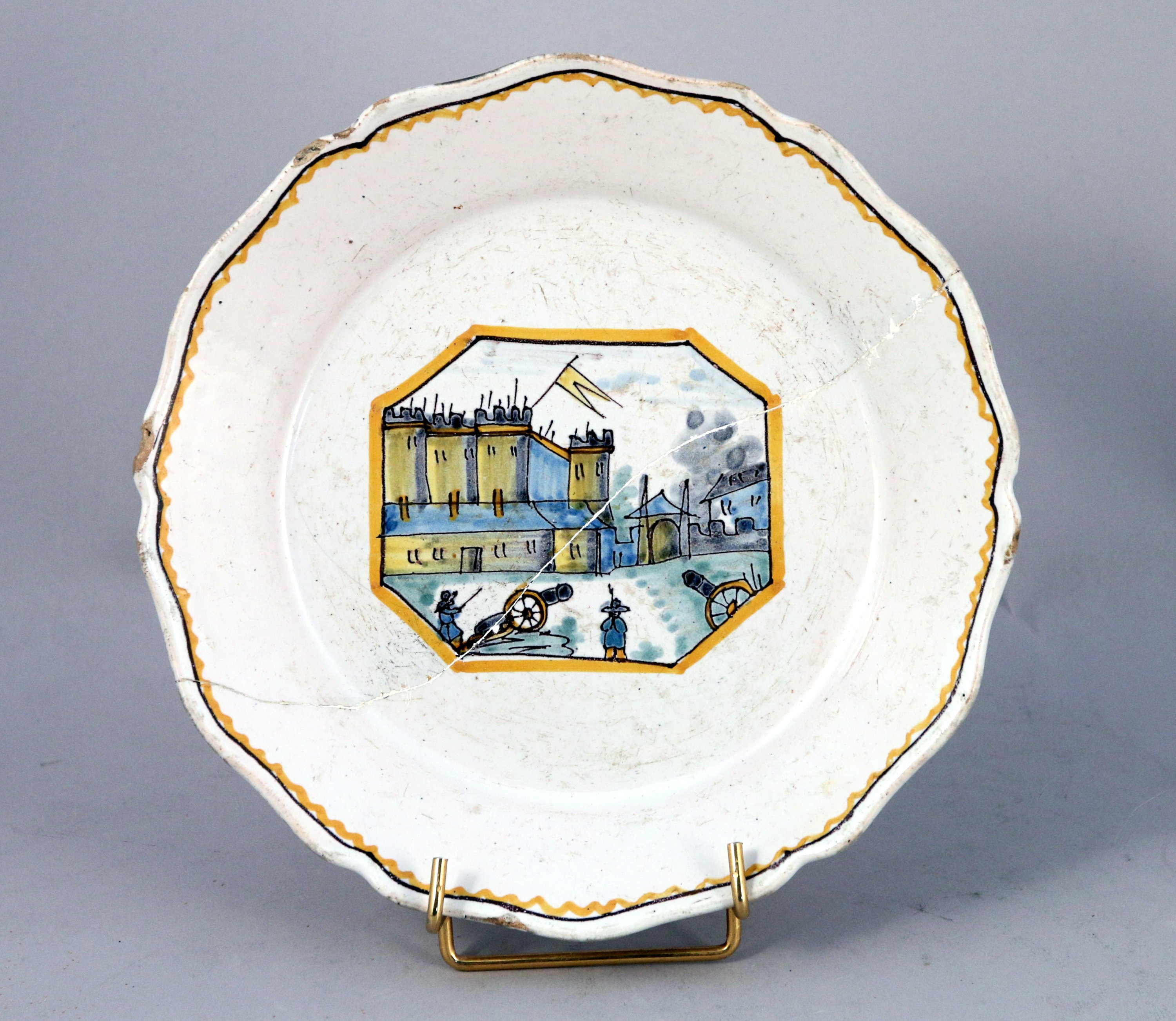 NEVERS, fin XVIIIe. ASSIETTE RÉVOLUTIONNAIRE à bord chantourné en faïence. Décor représentant la prise de la Bastille dans un encadrement rectangulaire à pans coupés, au premier plan, deux canons et deux personnages ; à droite, la maison du gouverneur de Launay en feu. Au revers, inscription postérieure manuscrite "Ripault".