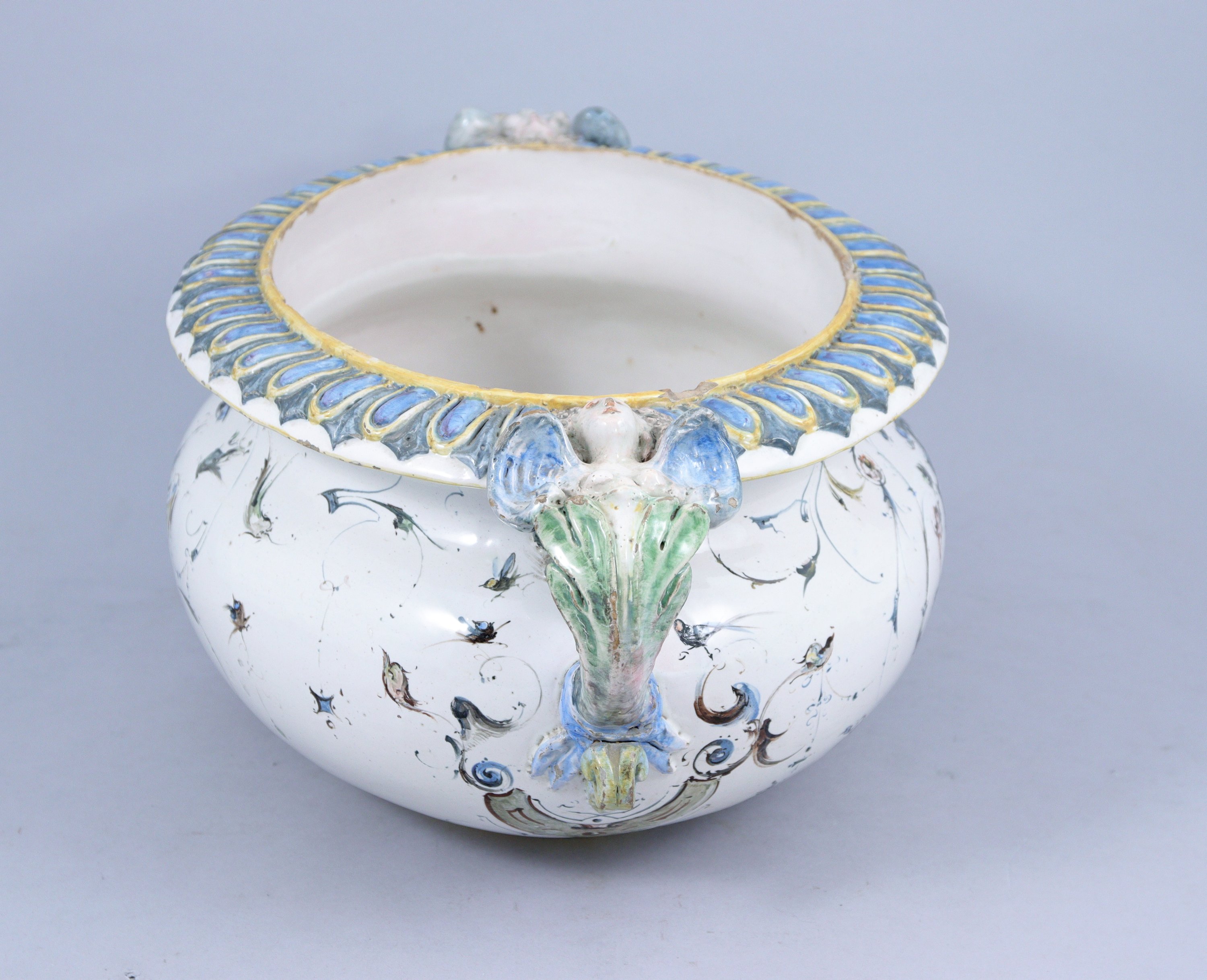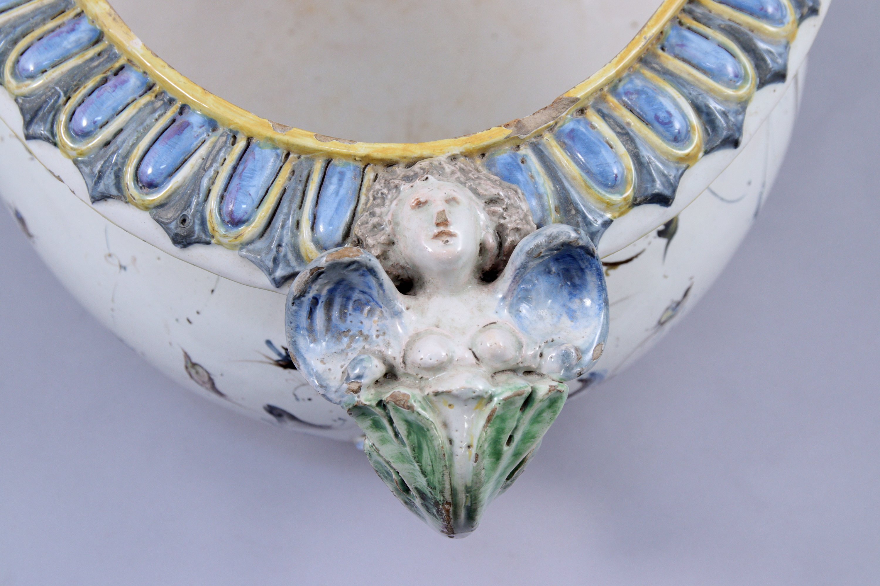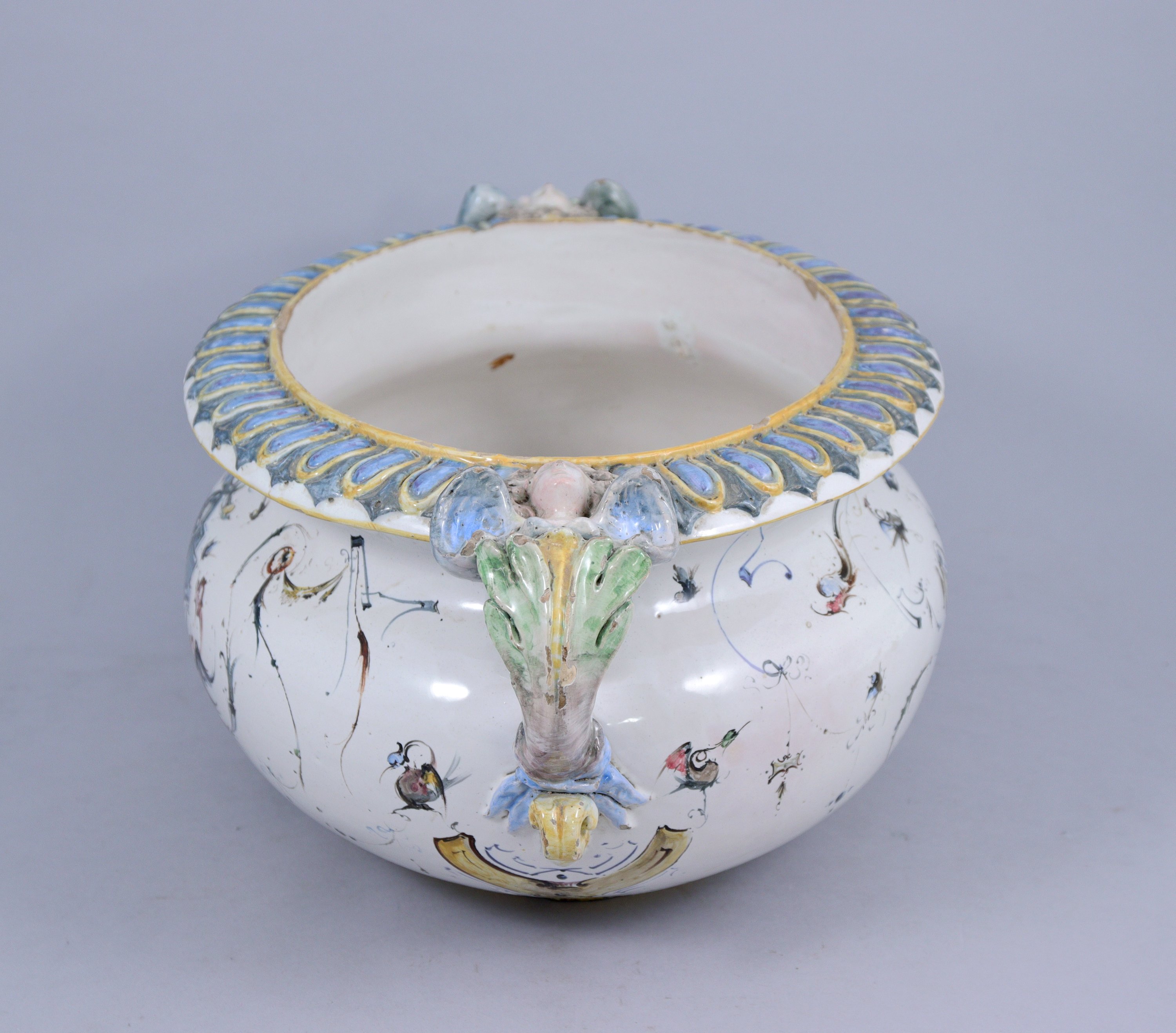 ITALIE. JARDINIÈRE en faïence de forme ovale à fond blanc et décor de grotesques. Les anses polychromes figurent deux anges.