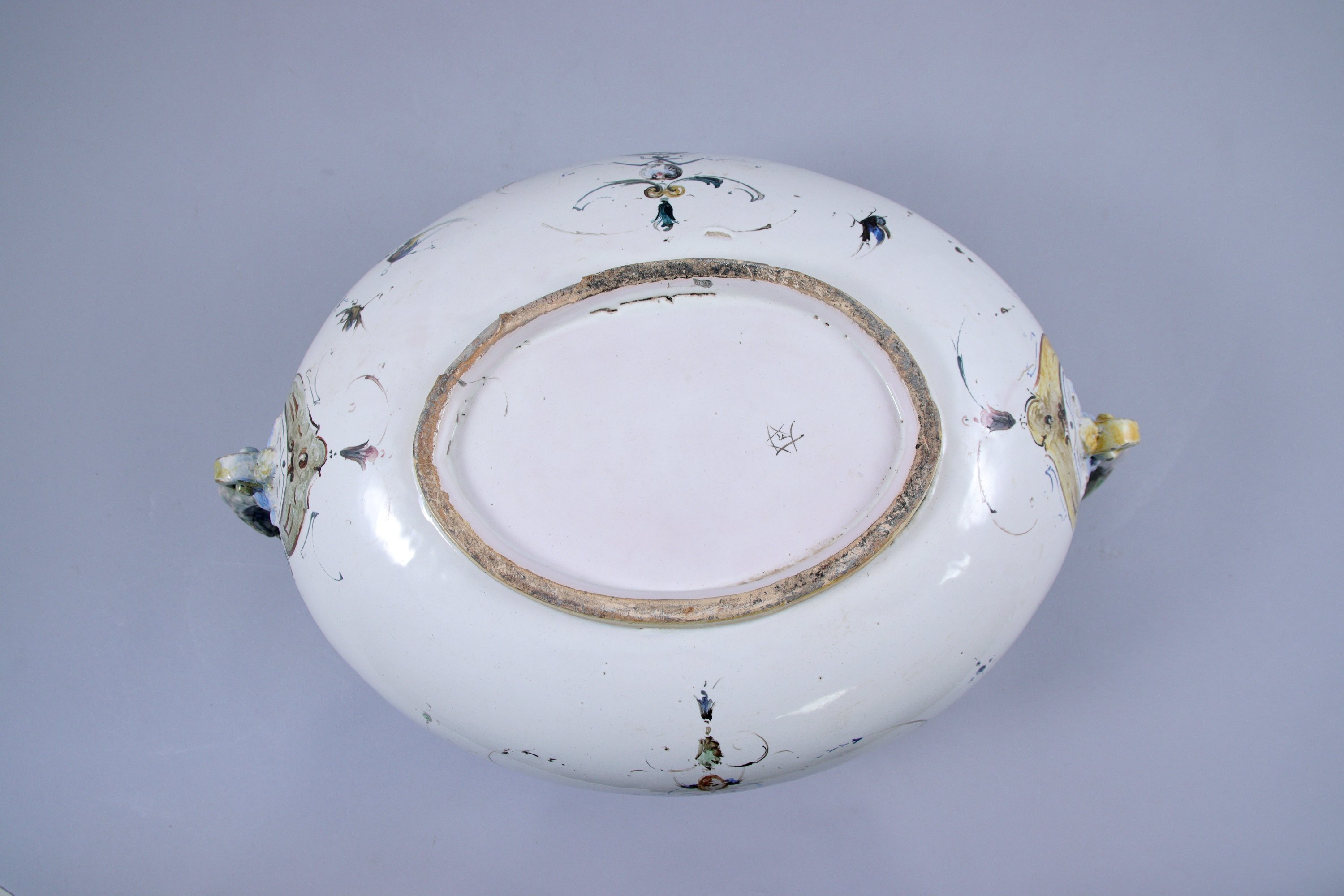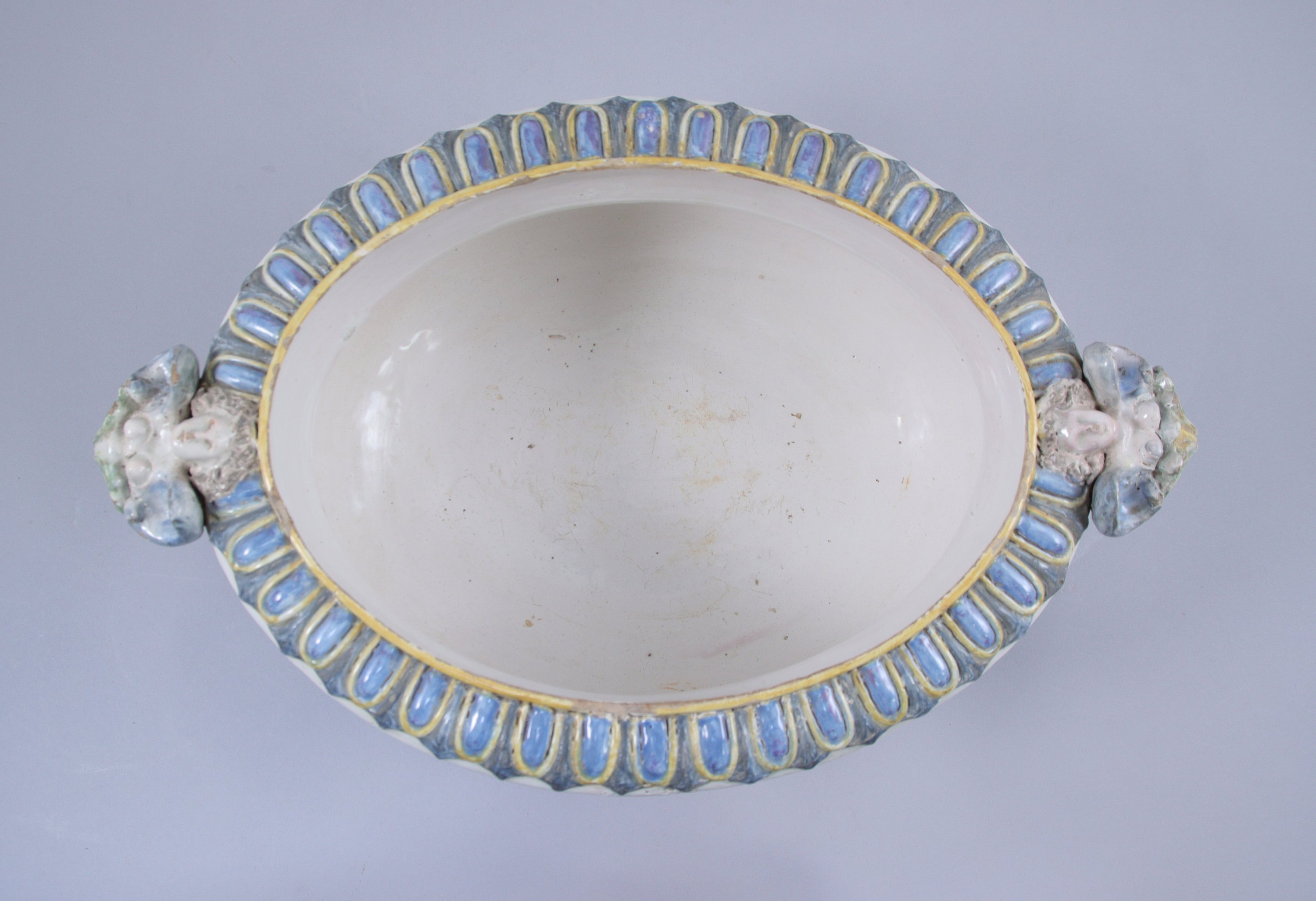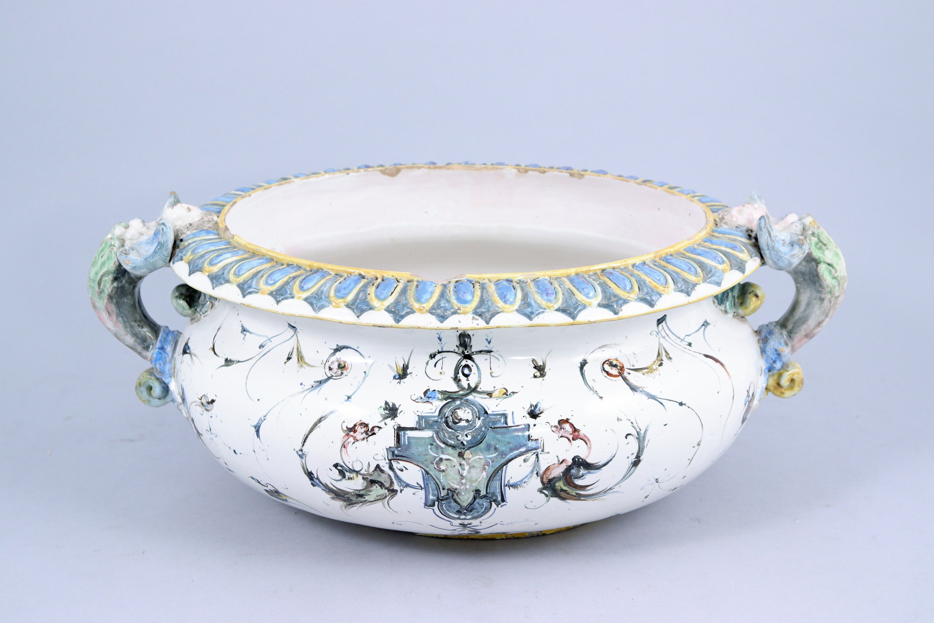 ITALIE. JARDINIÈRE en faïence de forme ovale à fond blanc et décor de grotesques. Les anses polychromes figurent deux anges.