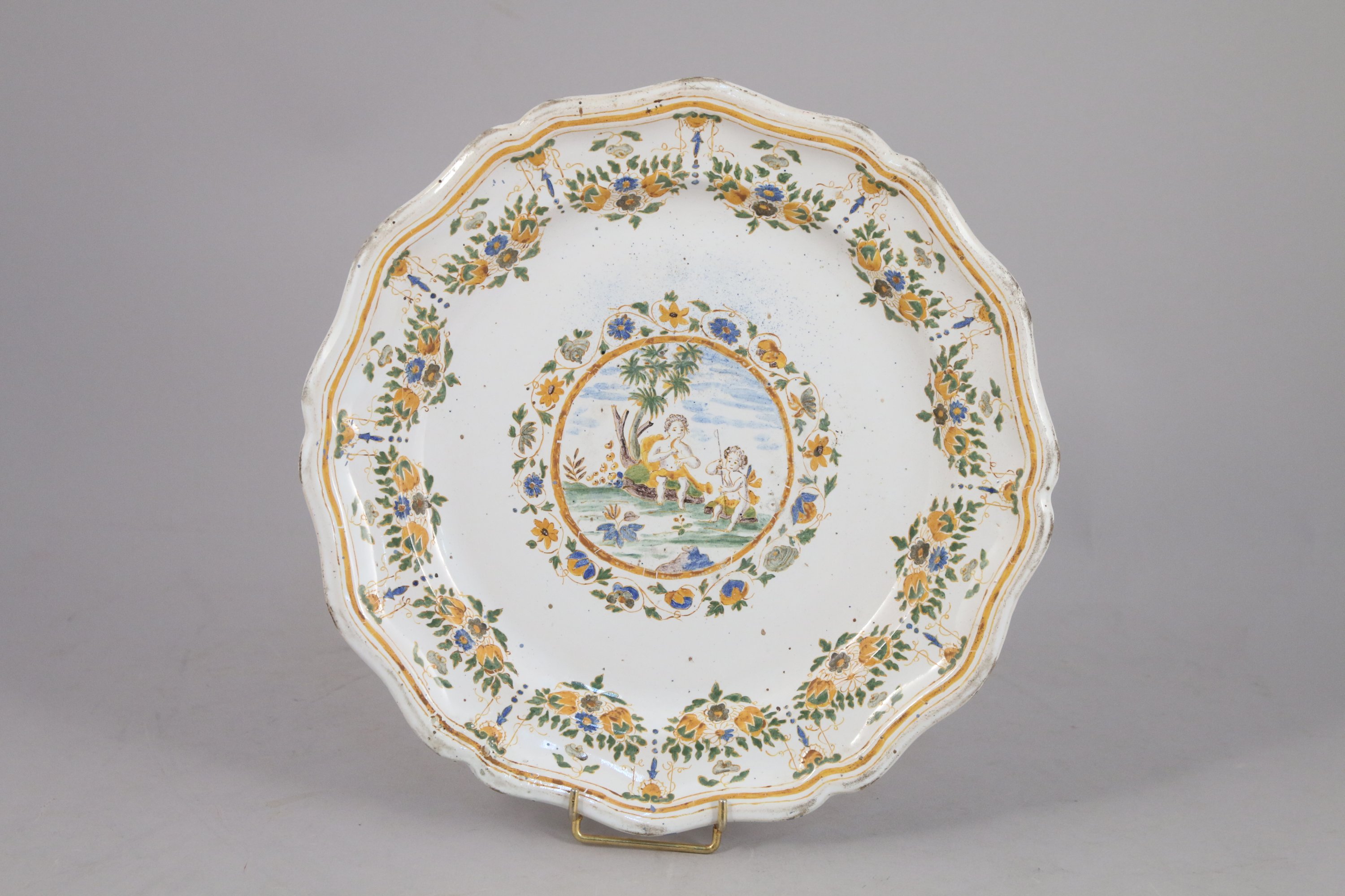 ASSIETTE à bord contourné en faïence à décor polychrome, elle figure dans un médaillon un musicien jouant de la trompe au pied d'un arbre, accosté d'un enfant berger. L'aile ornée des motifs floraux rayonnants.