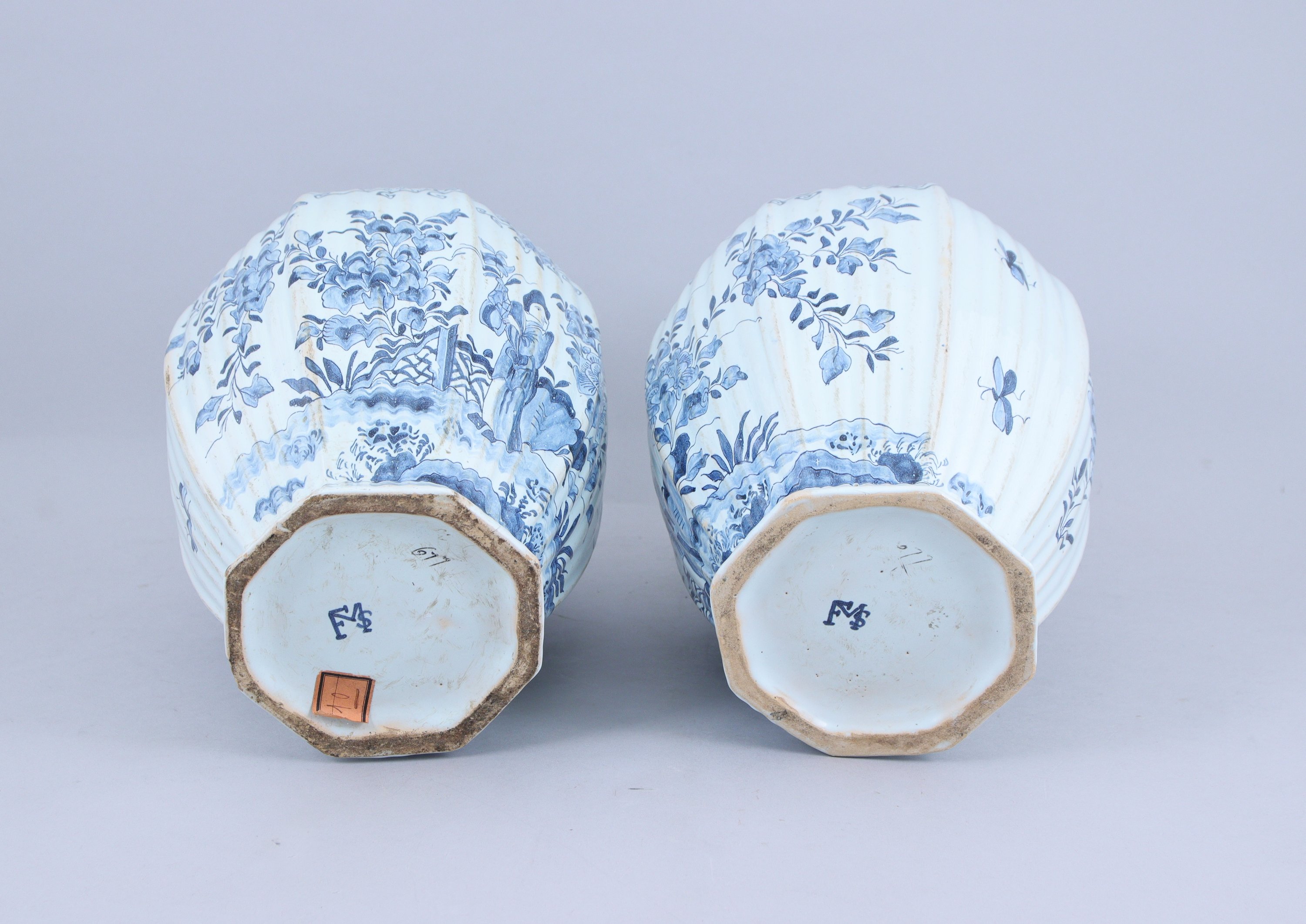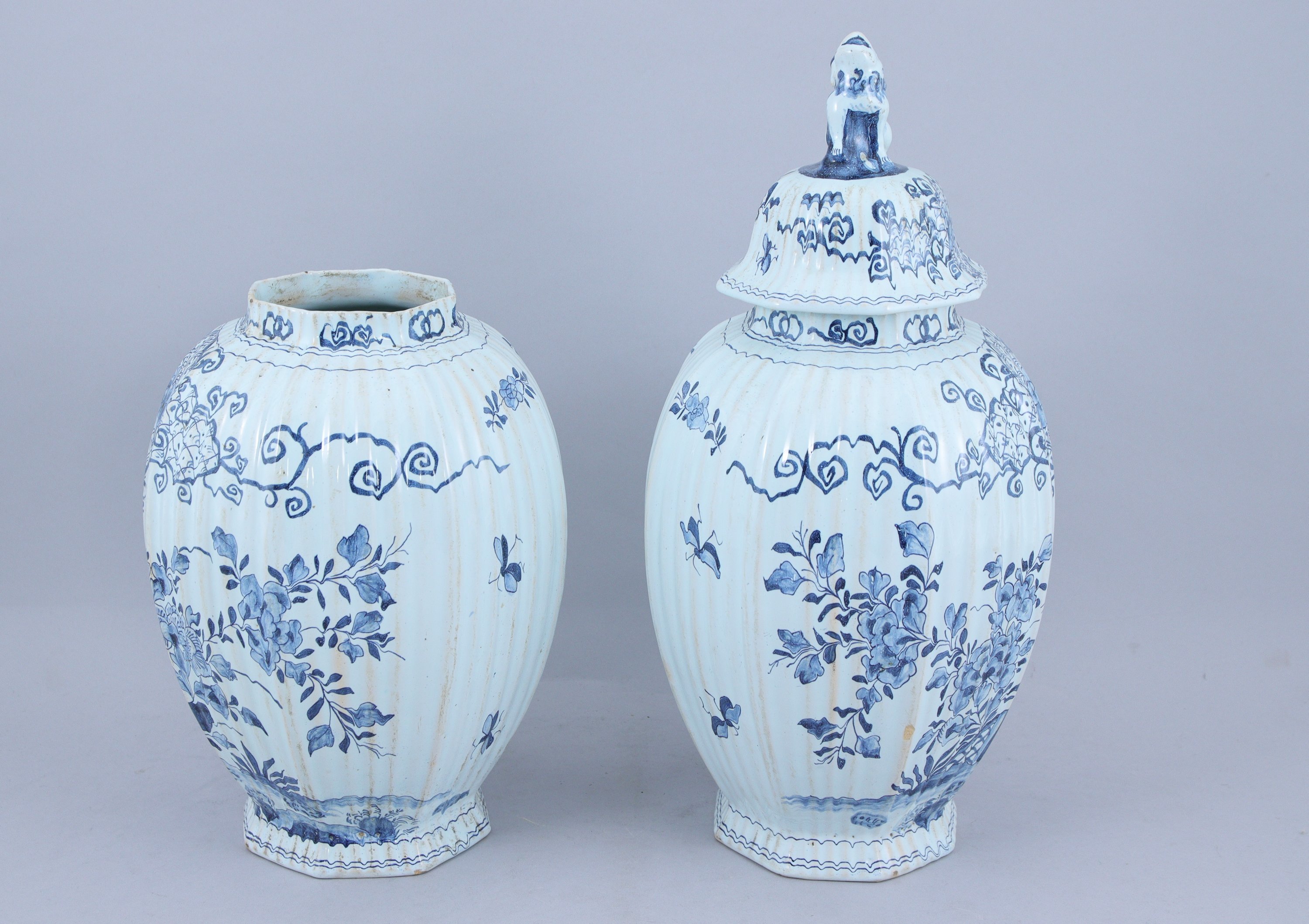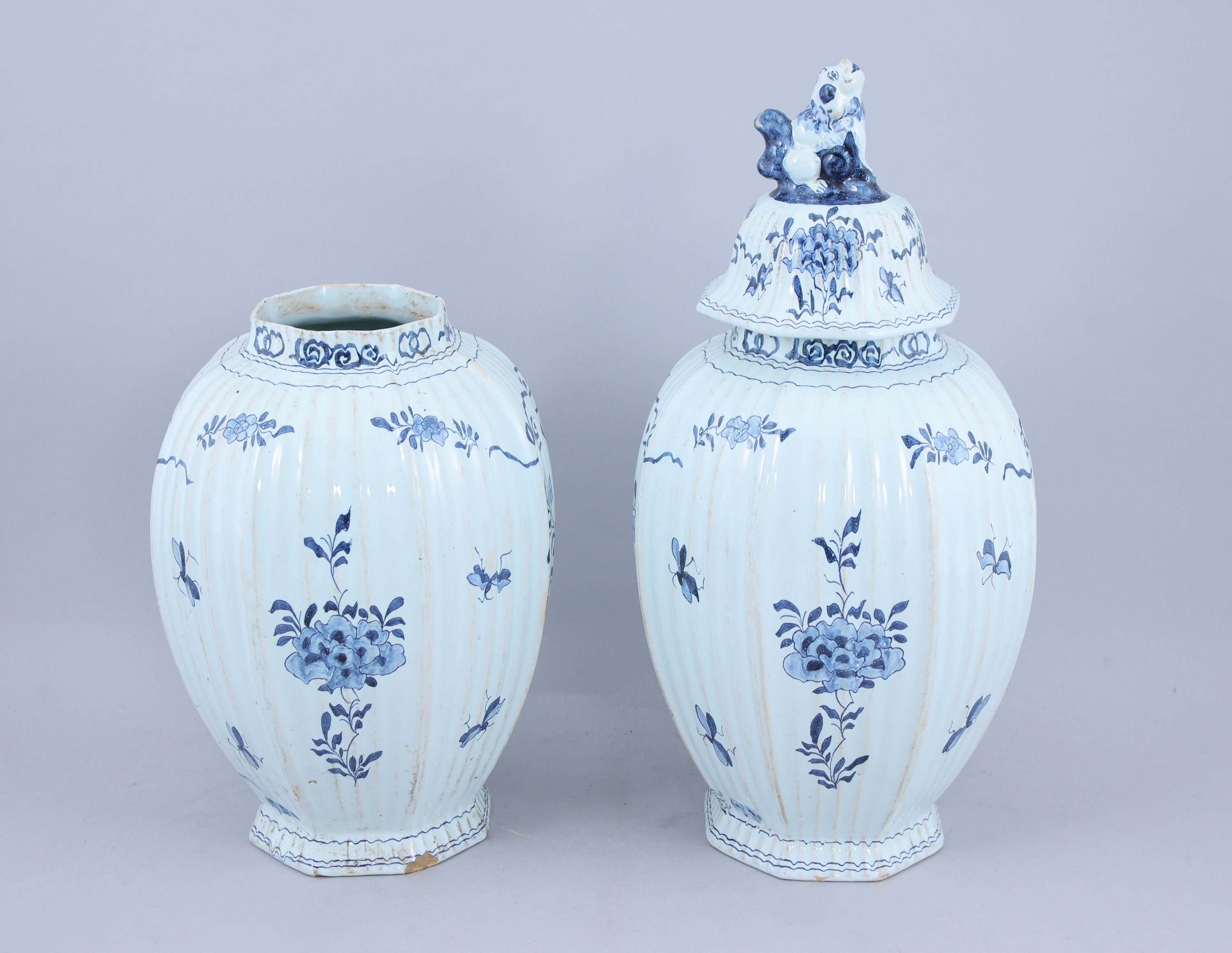 DELFT. Paire de VASES BALUSTRE COUVERTS à pans coupés en faïence blanc-bleu. Le couvercle coiffé d'un chien surmontant un décor de fleurs et insectes. La panse présentant un cartouche à croisillons sur lesquels sont figurées des fleurs. En dessous est représenté un homme dans un jardin tenant dans ses mains un vase fleuri.