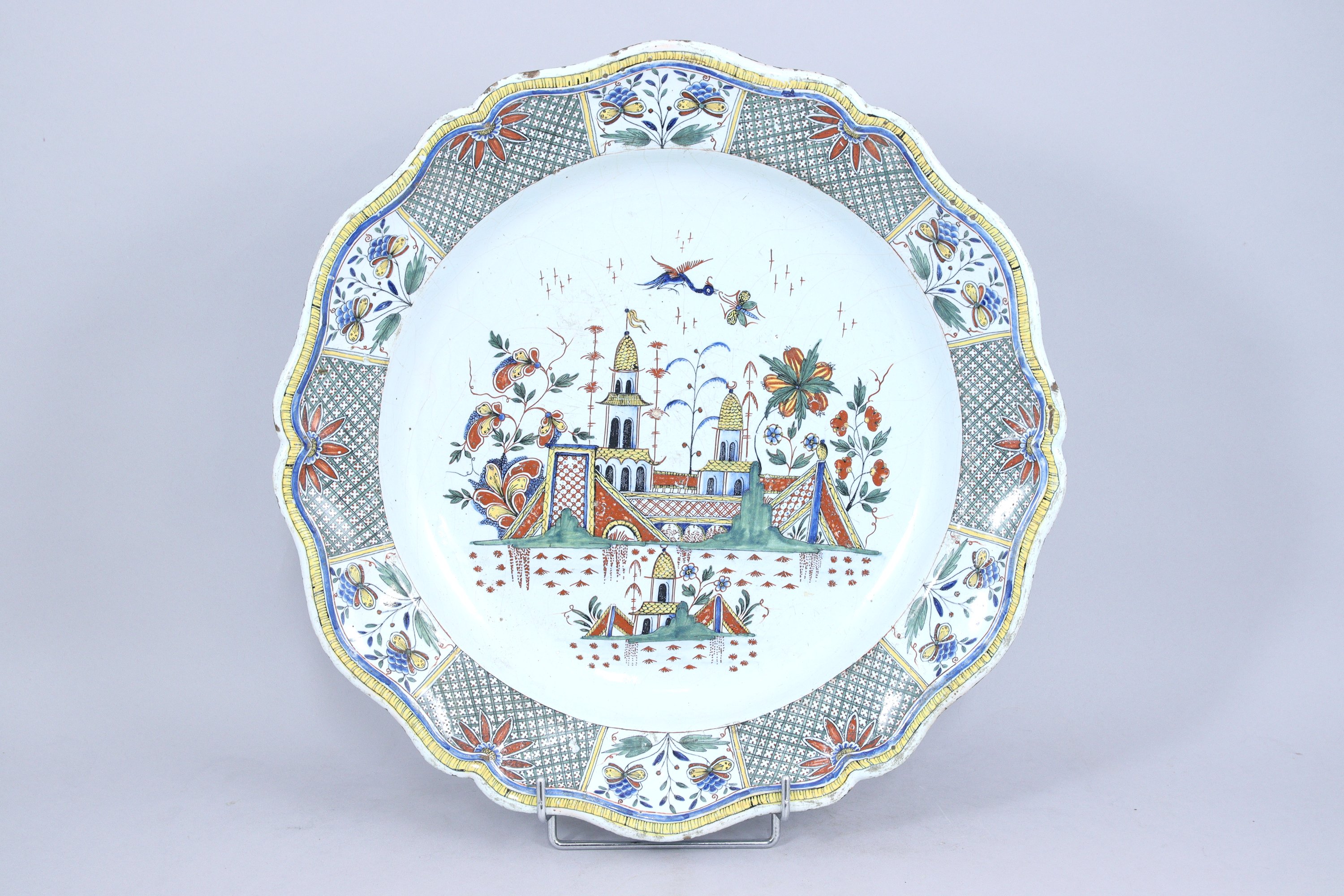 à décor polychrome dans le style des porcelaines chinoises de la famille verte de l'époque Khang-Hi. L'aile est bordée de filets jaune, bleu vif et d'une frise de croisillons verts. Le bassin présente un décor dit "à la pagode", inspiré par les décors figurants sur les porcelaines japonaises expédiées en Europe pendant la période de transition chinoise.