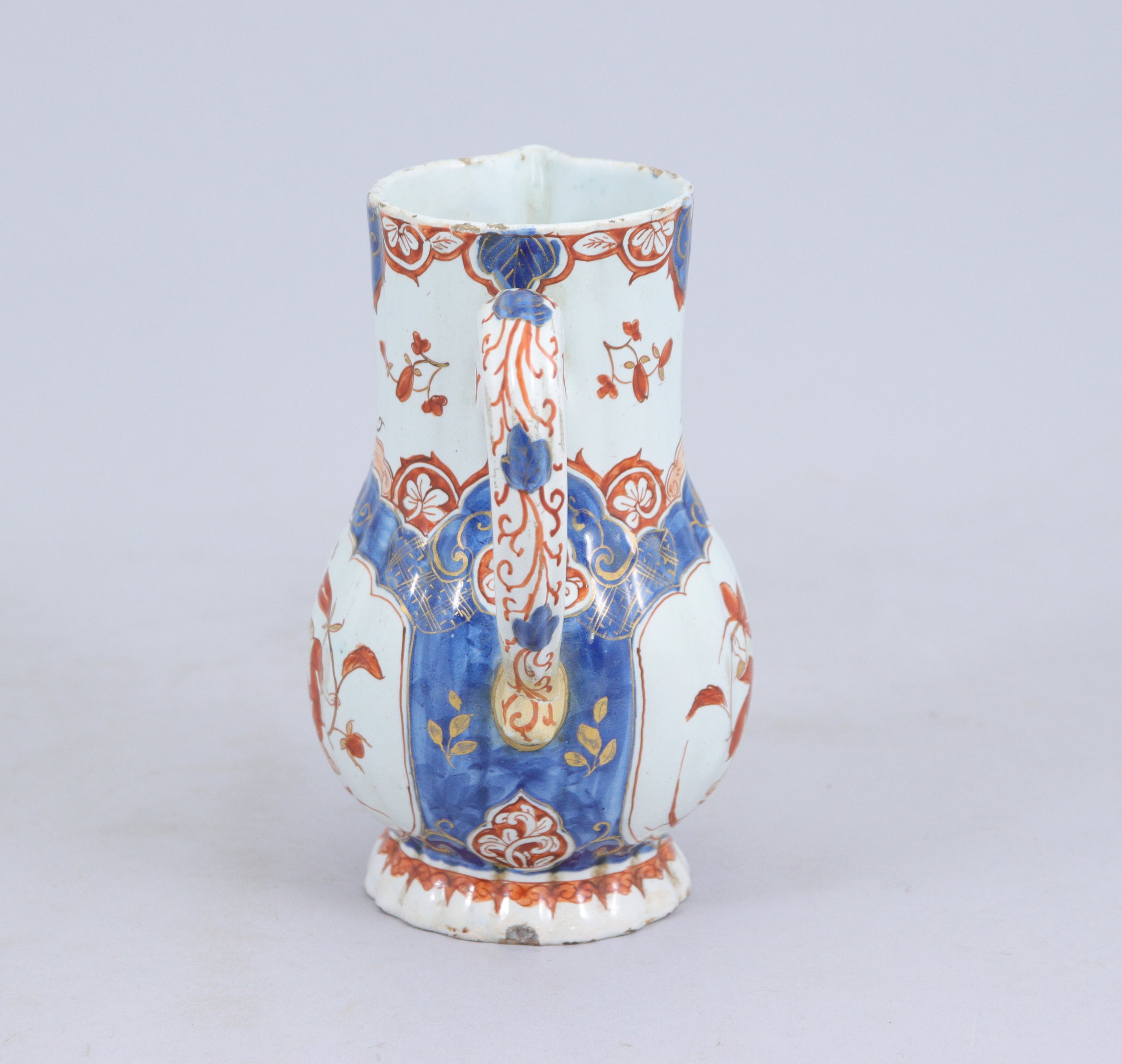 DELFT. VERSEUSE en faïence à décor bleu, rouge et or figurant un personnage et un oiseau perché.