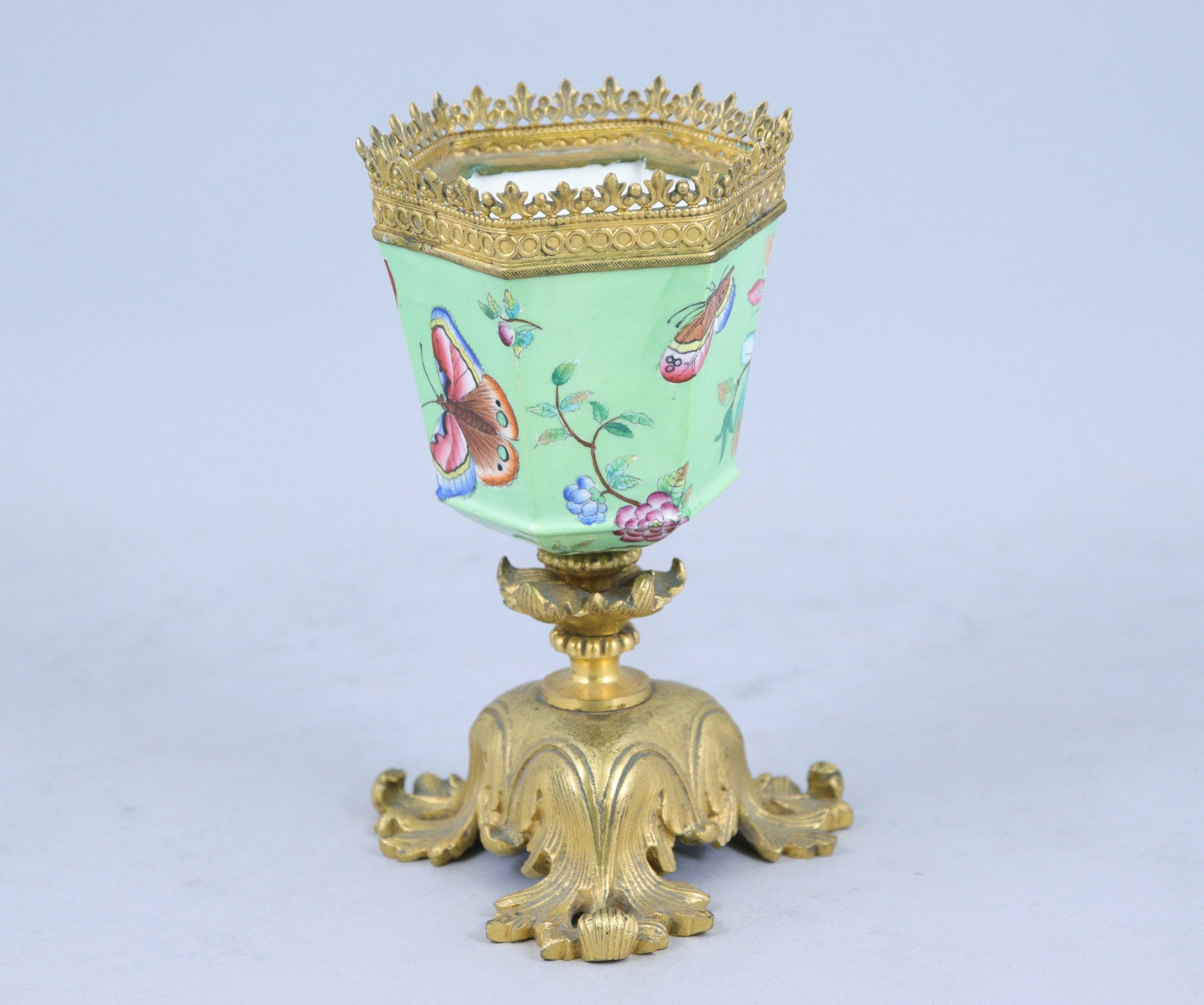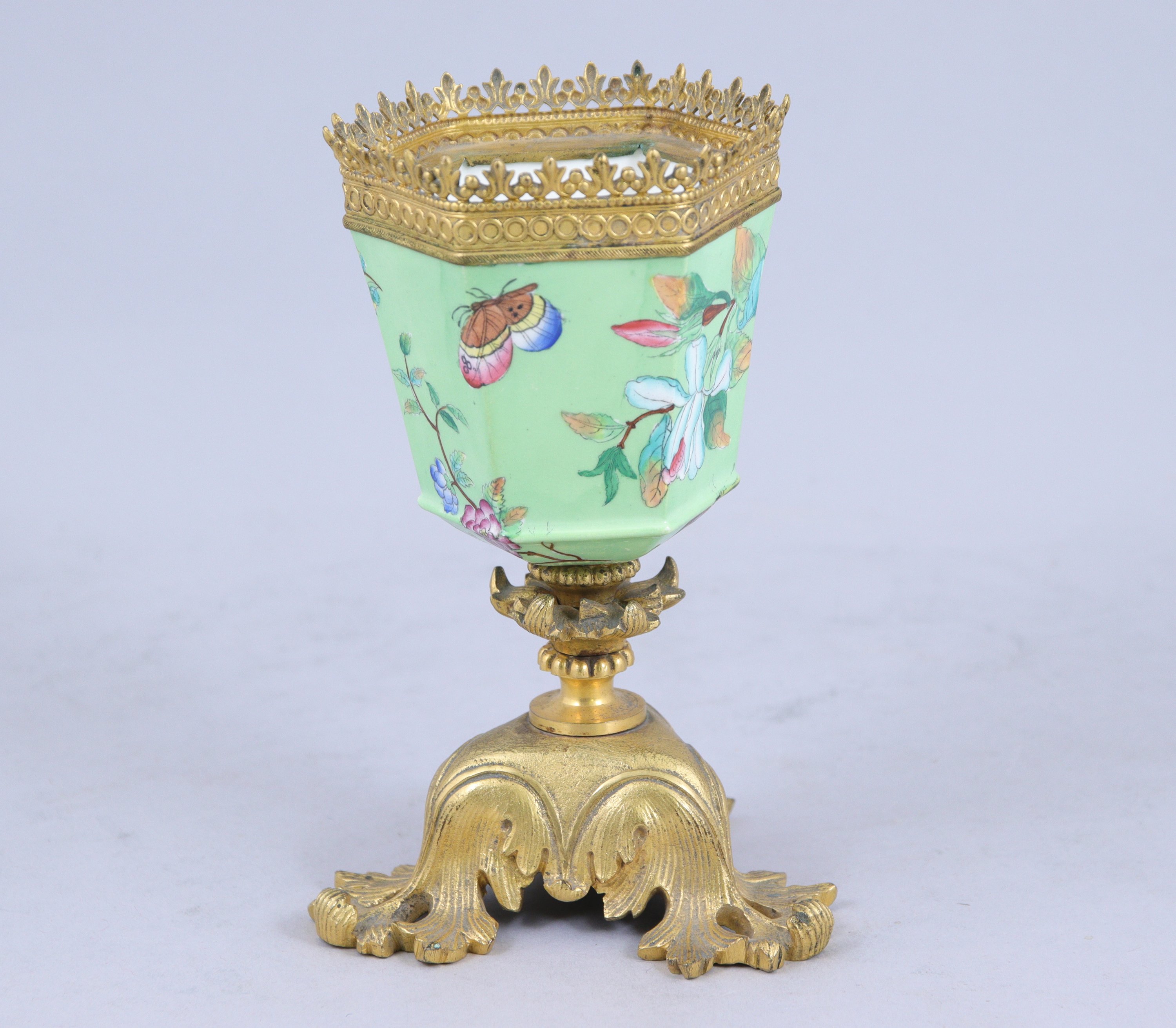 Monture en bronze doré de style rocaille pour le piétement tripode, avec frise sur le pourtour.