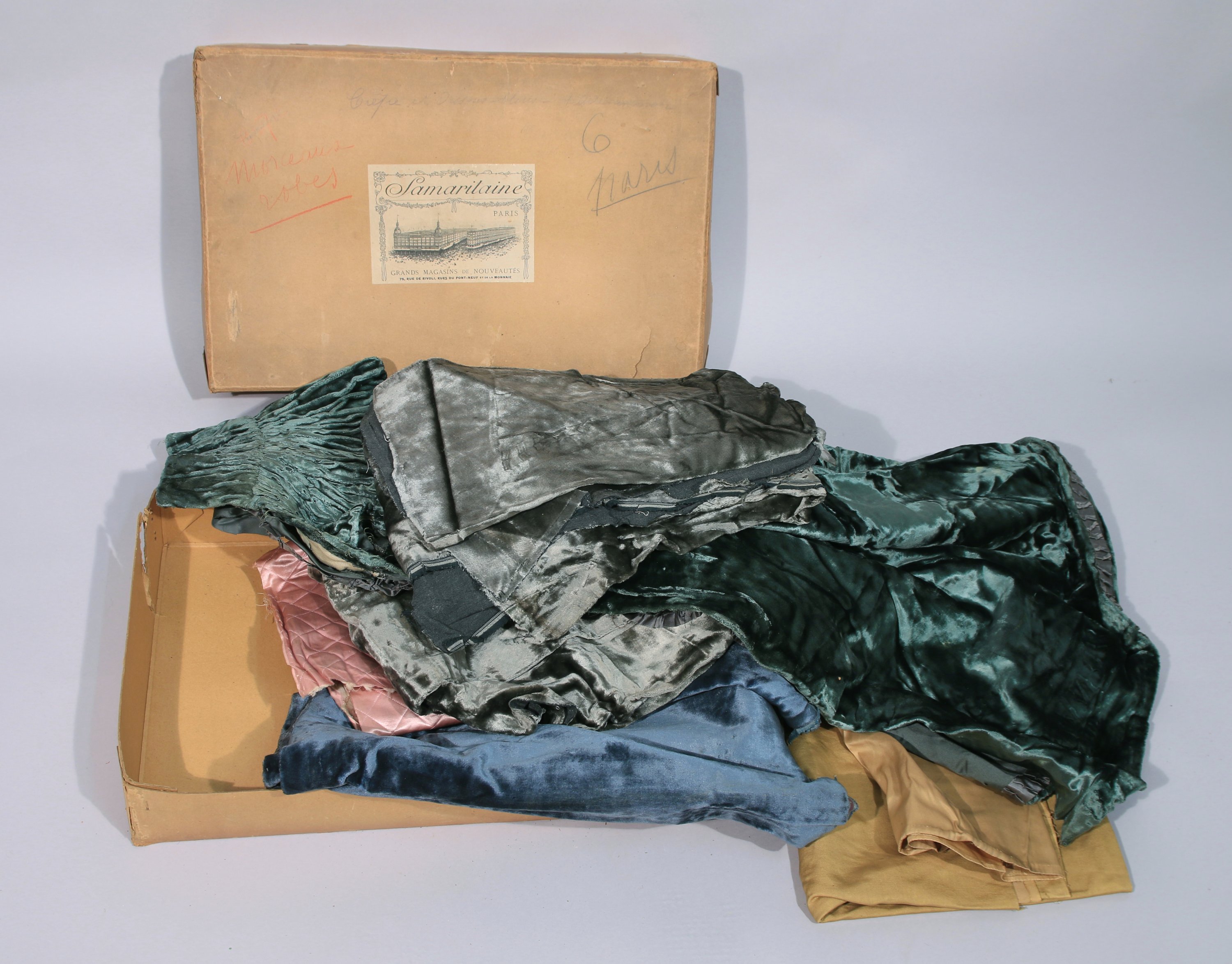 SIX MORCEAUX D'ÉTOFFE dont des velours. Dans une boîte cartonné de la Samaritaine, 75 rue de Rivoli, rues du Pont-Neuf et de la monnaie.