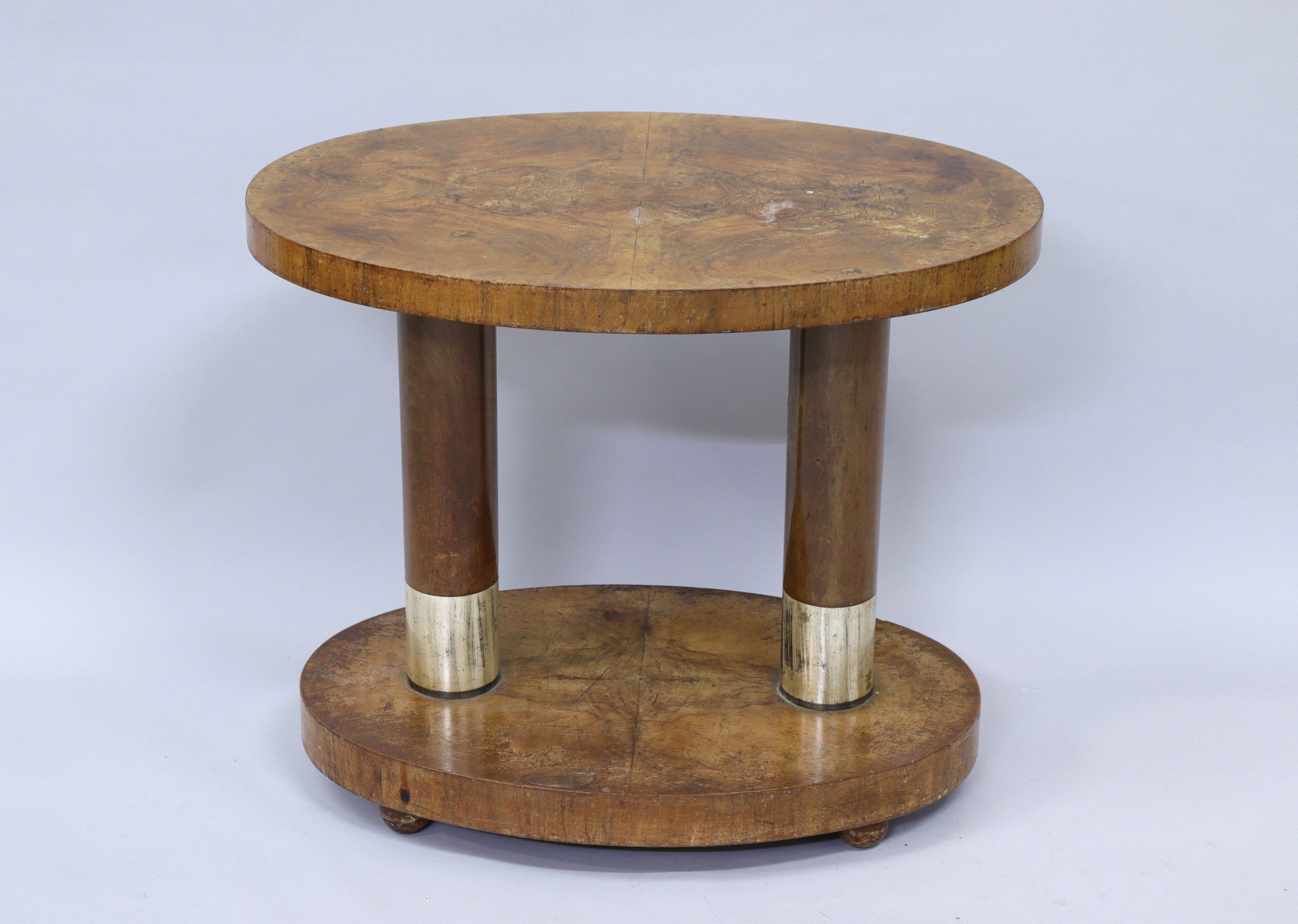 TABLE D'APPOINT de forme ovale en bois exotique, à double plateau en placage de loupe, réuni par deux colonnes lisses à bagues métalliques. Il repose sur quatre pieds boules.