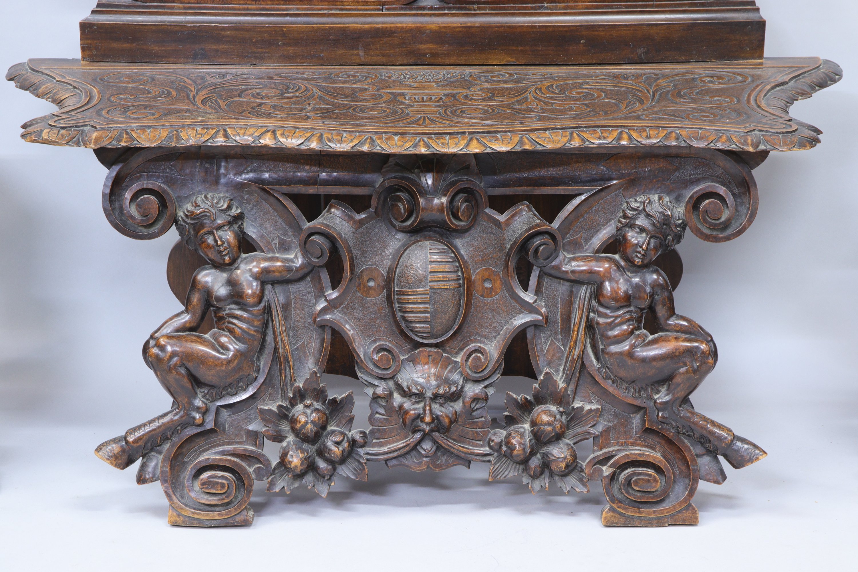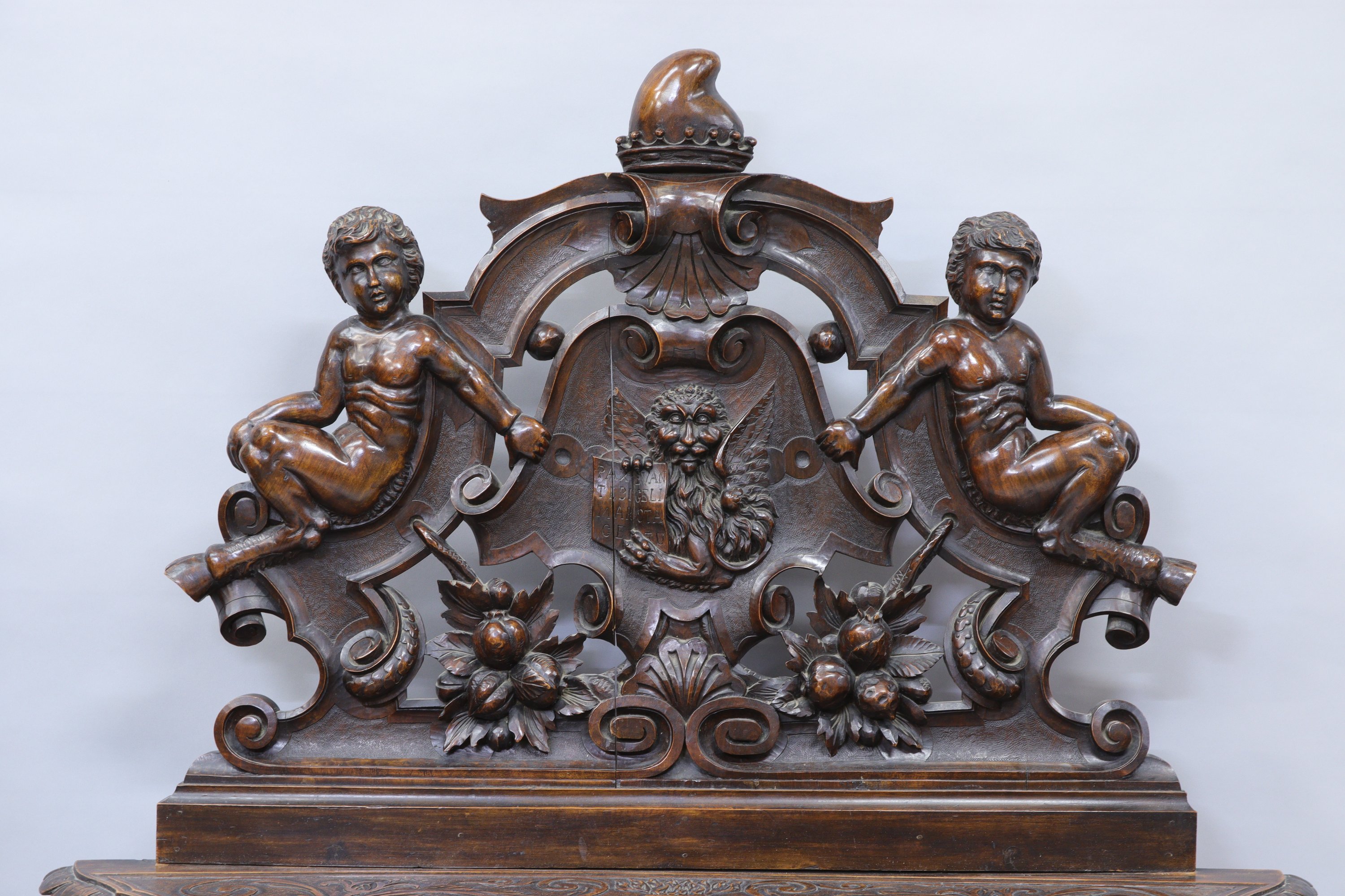 Le dossier du banc orné de deux putti bachiques entourant le lion de Saint Marc surmonté du bonnet des doges de Venise. L'assise gravée d'un vase et d'entrelacs, le piétement avec aux mêmes putti tenant des armoiries dans un enroulement de cuir.