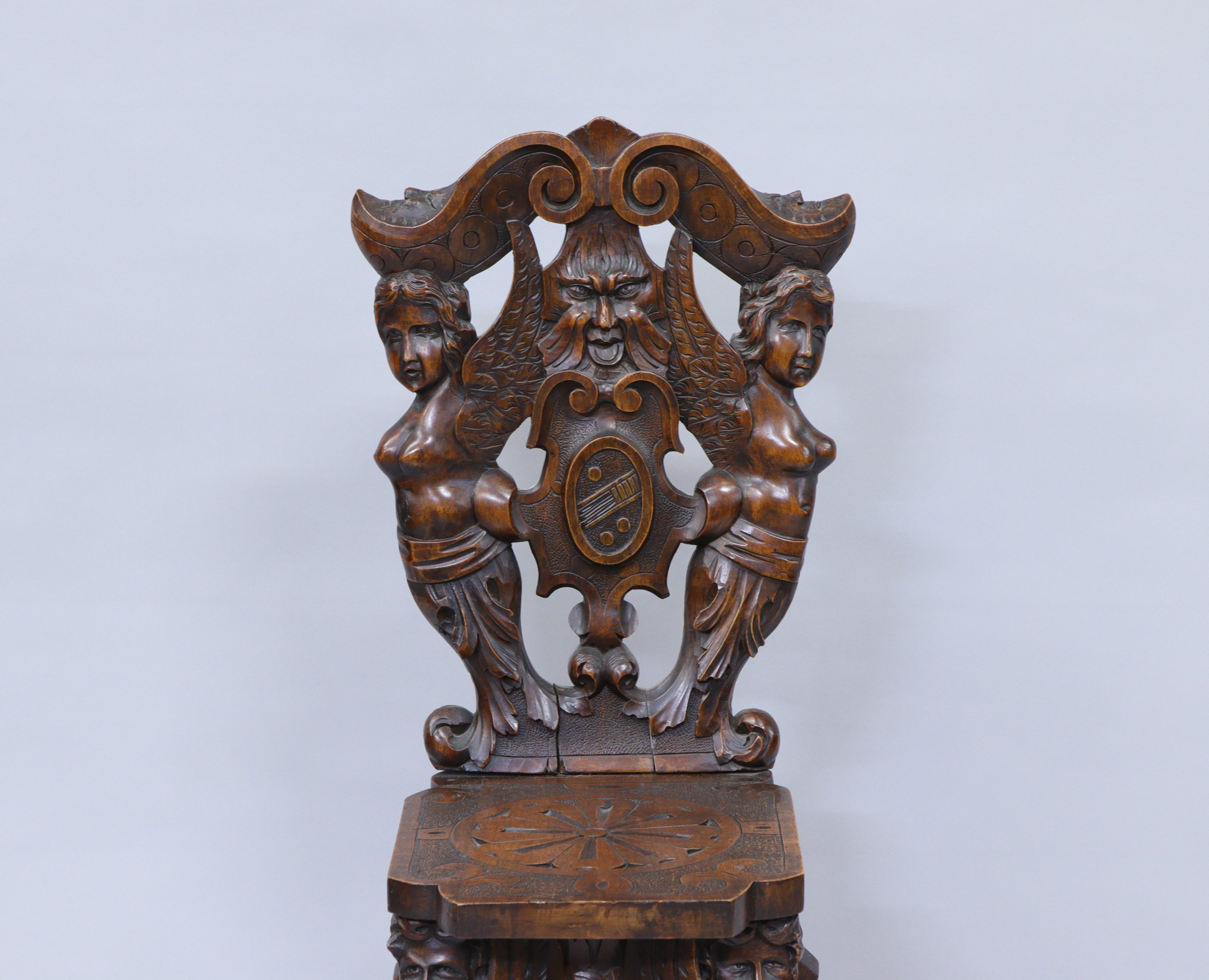 Les chaises à dossiers droits surmontés de visages lunaires présentent des chimères adossées à un blason armorié, le piètement du même motif.