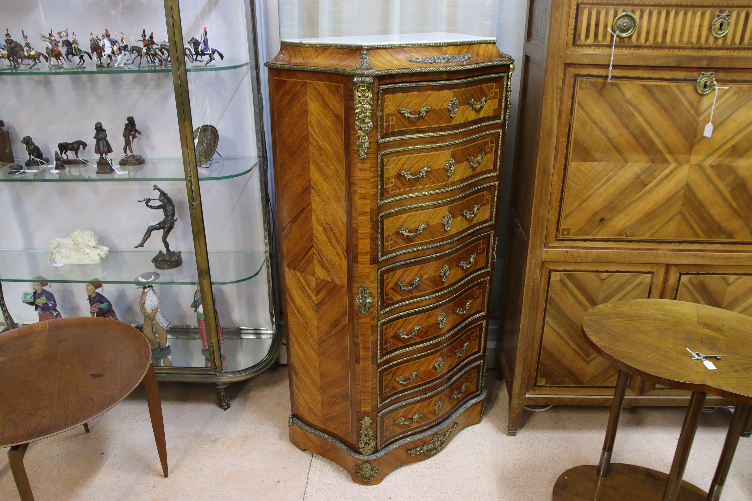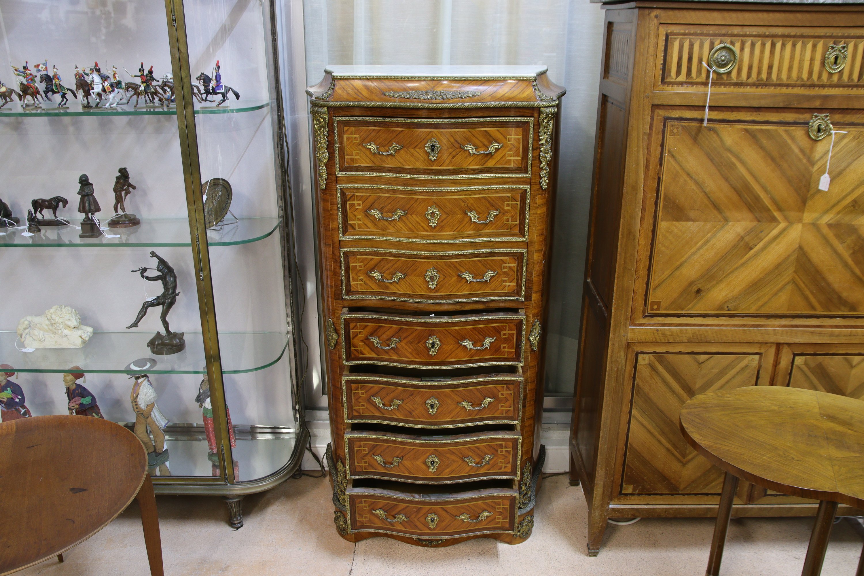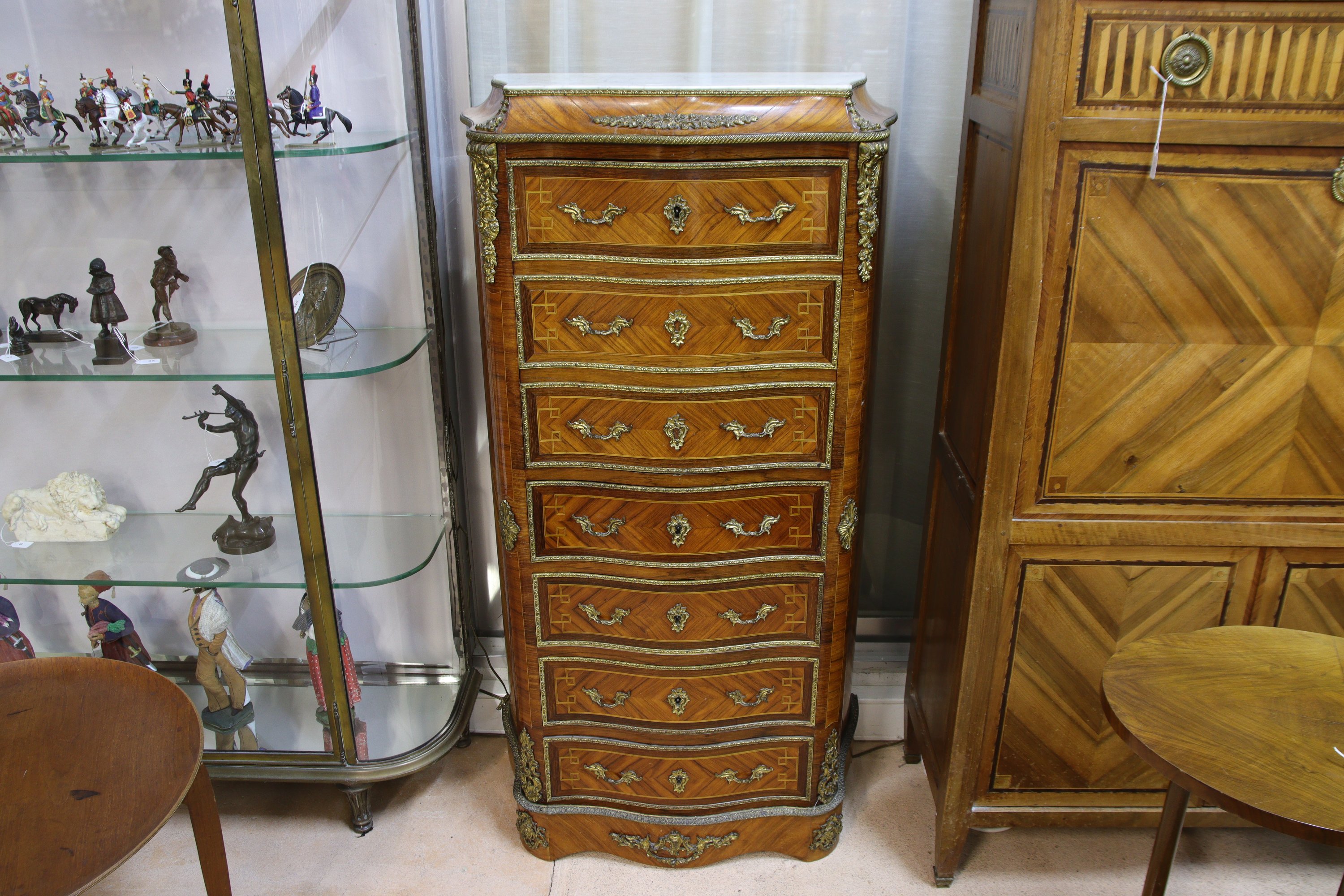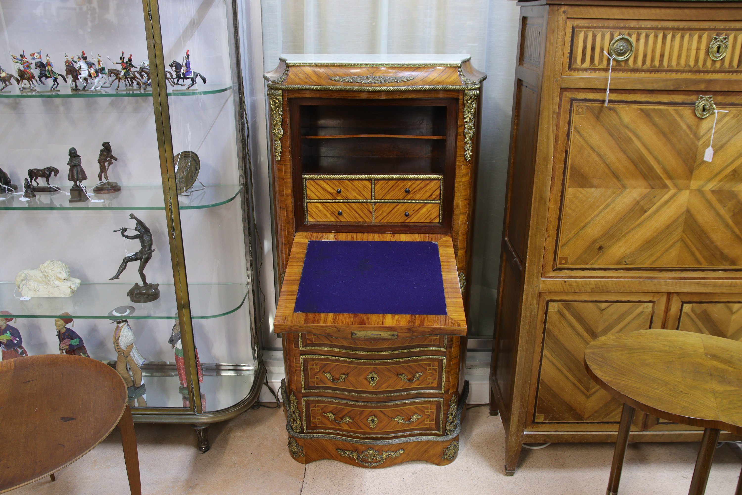 SECRÉTAIRE DROIT en forme de SEMAINIER en bois de placage à la façade ouvrant par un abatant et quatre tiroirs dissimulé par une façade de sept tiroir. Dessus de marbre blanc et ornementation de bronze doré.