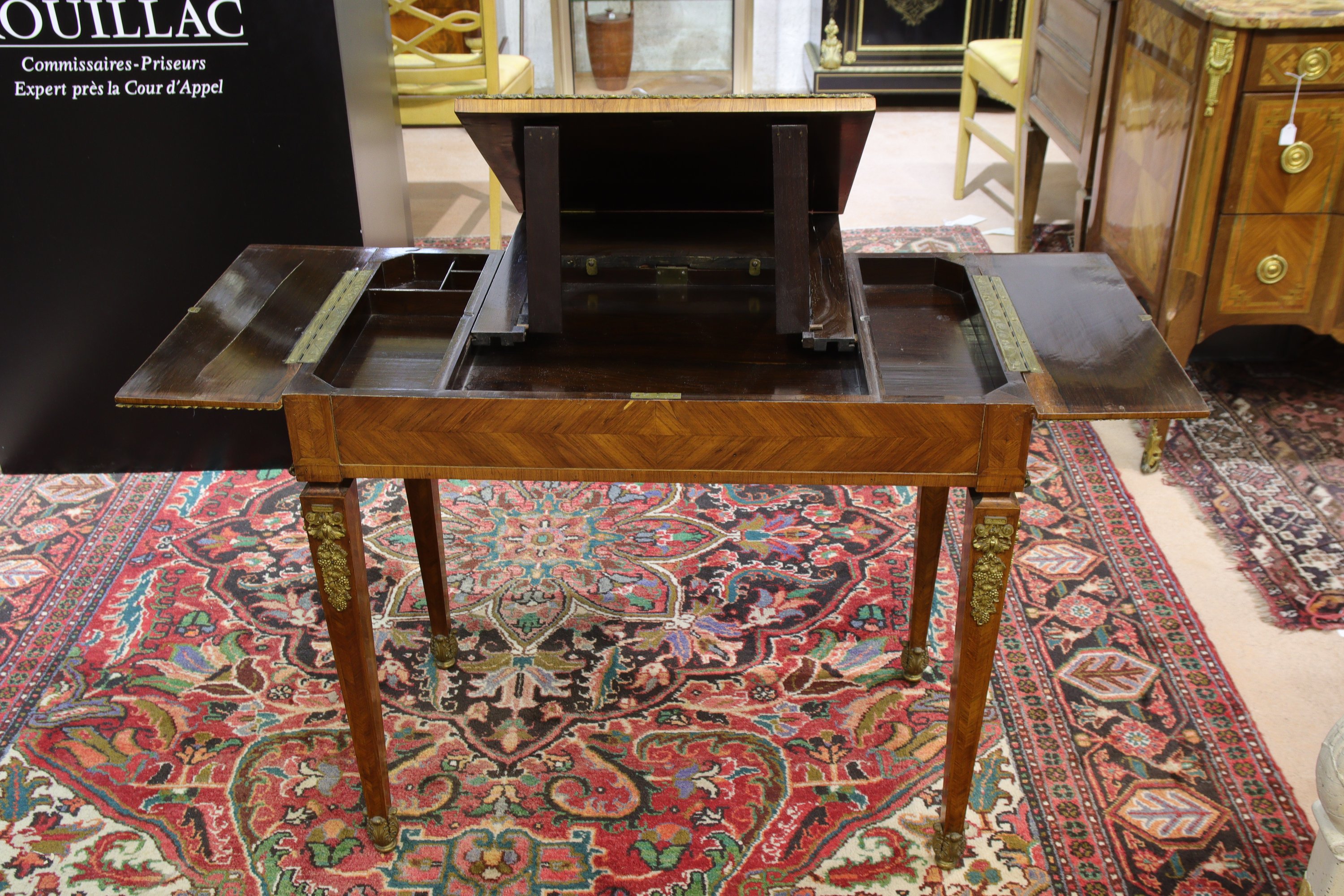 Petit BUREAU formant PUPITRE en bois de placage de forme rectangulaire reposant sur quatre pieds gaine au plateau ouvrant par un pupitre gainé de cuir bordeaux et deux casiers. Riche ornementation en bronze doré.