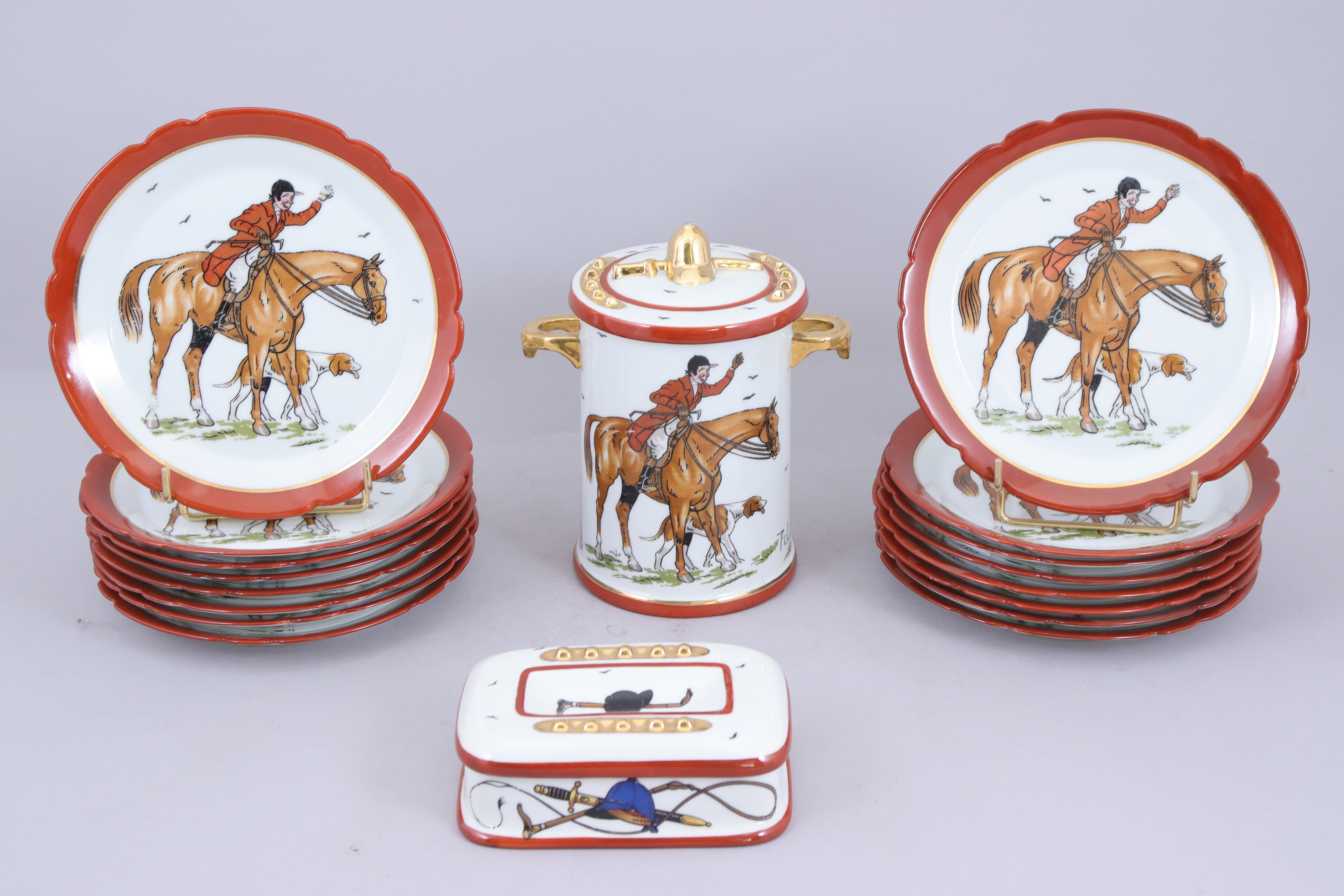 COULEUVRE. SERVICE à DESSERT en porcelaine à décor polychrome, modèle "VÈNERIE". Comprenant 16 assiettes, beurrier et pot à crème. Bordure ocre, prises dorées, décor de scènes de vènerie et trophées.
