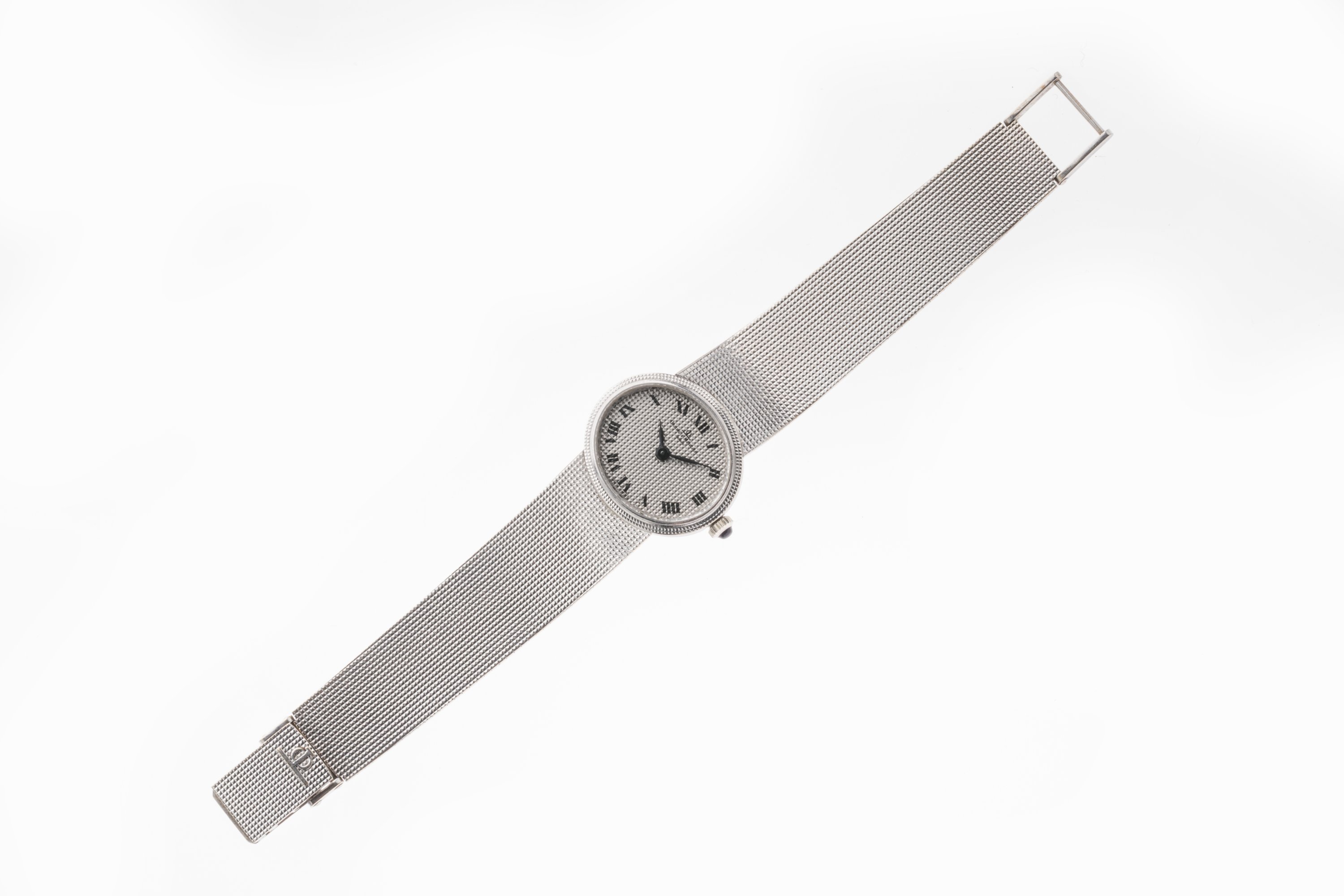BAUME ET MERCIER. MONTRE BRACELET DE DAME en platine et or blanc. Cadran ovale avec les heures en chiffres romains et remontoir orné d'une pierre bleue à trois heures. Mouvement mécanique.