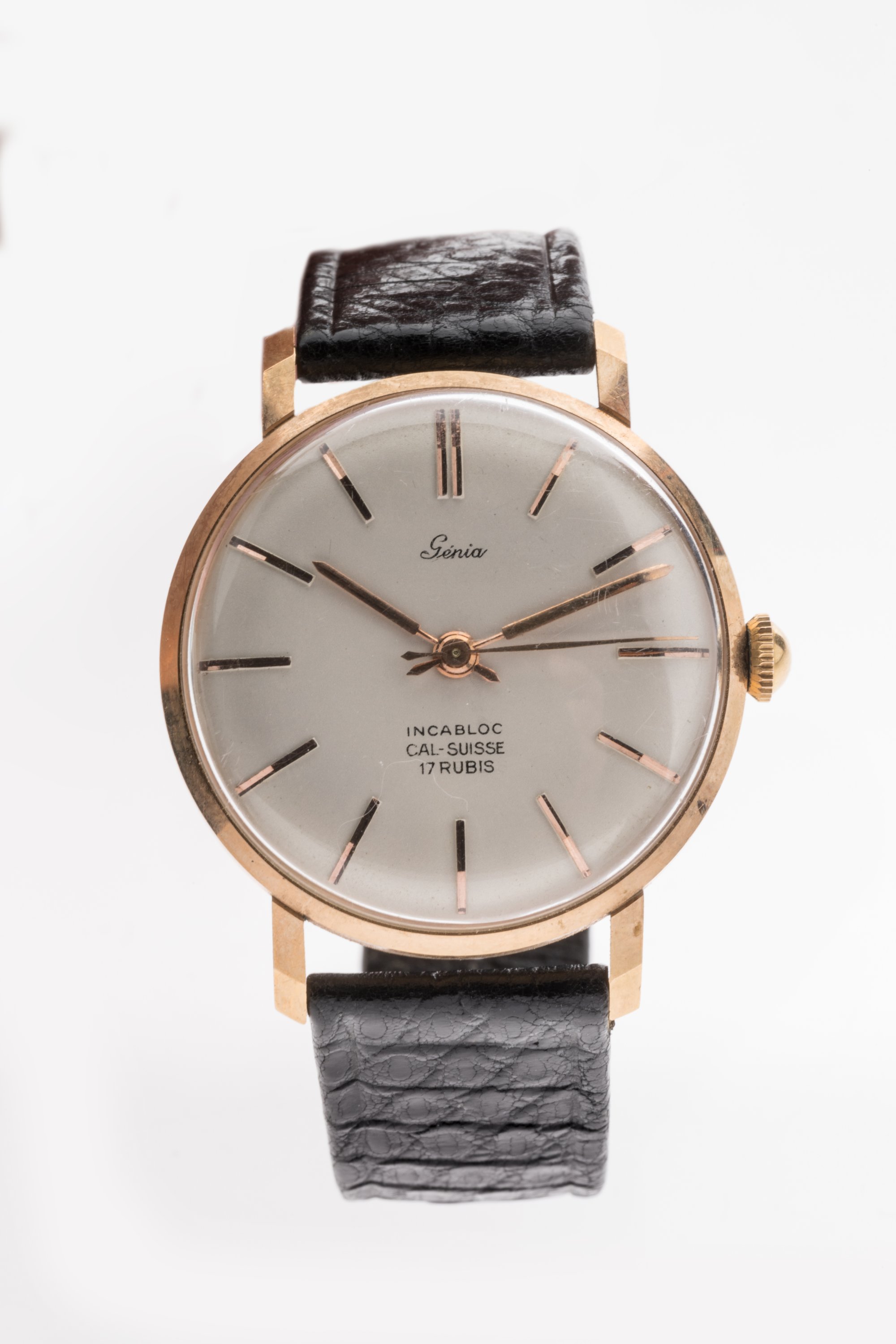 GÉNIA. MONTRE BRACELET en or jaune 750 millièmes figurant les heures par des index. Mouvement à remontage manuel 17 RUBIS. Ardillon en métal doré.