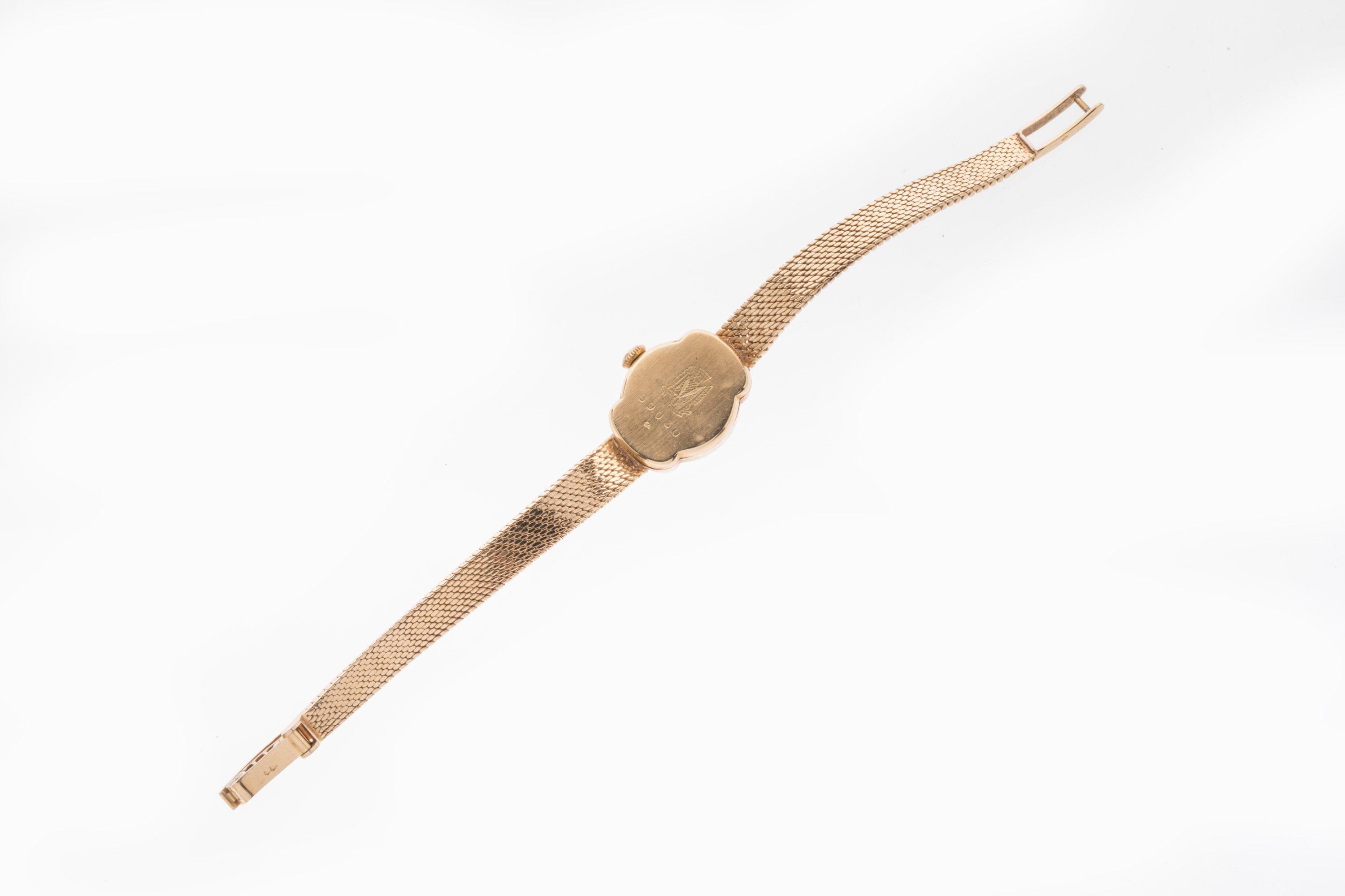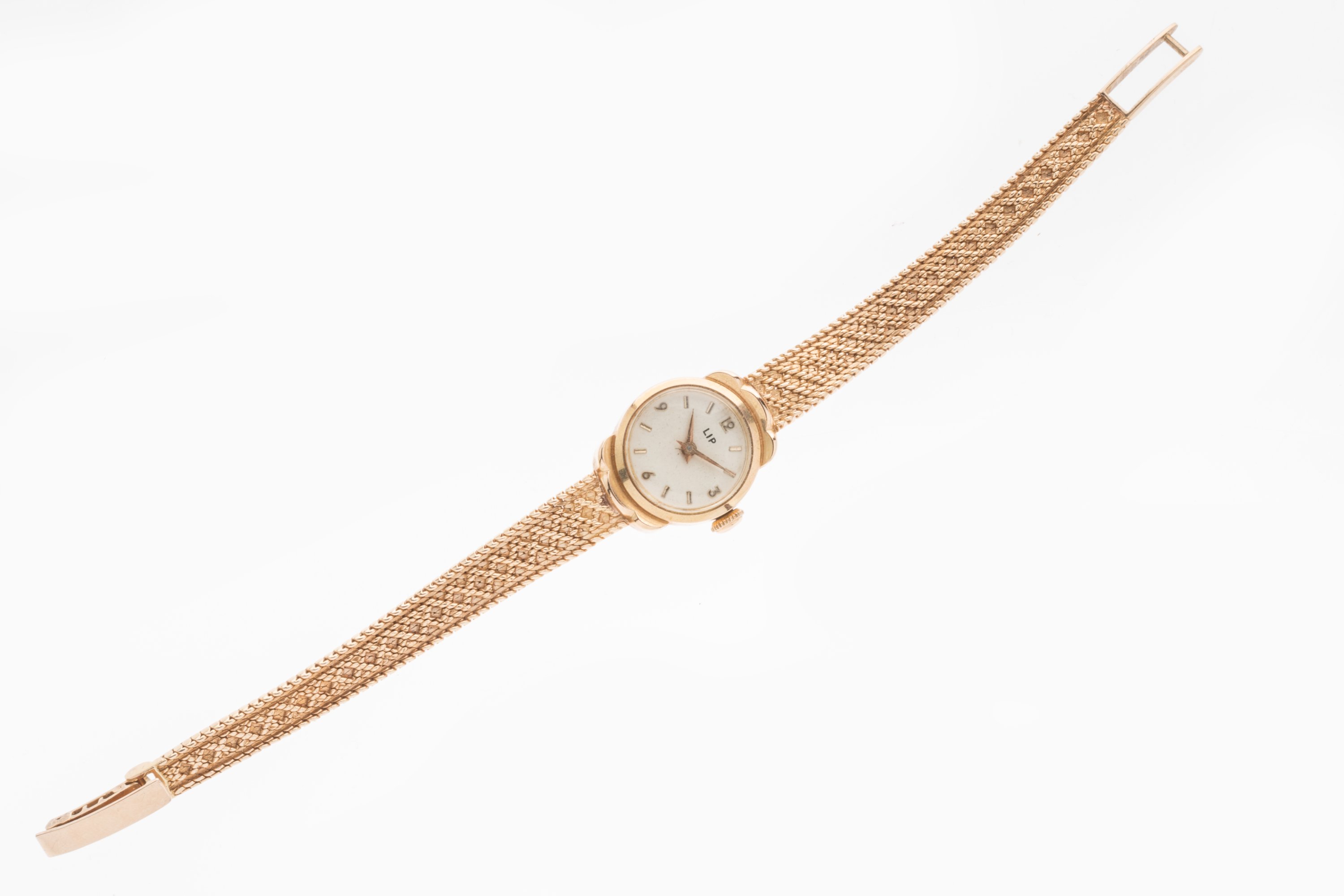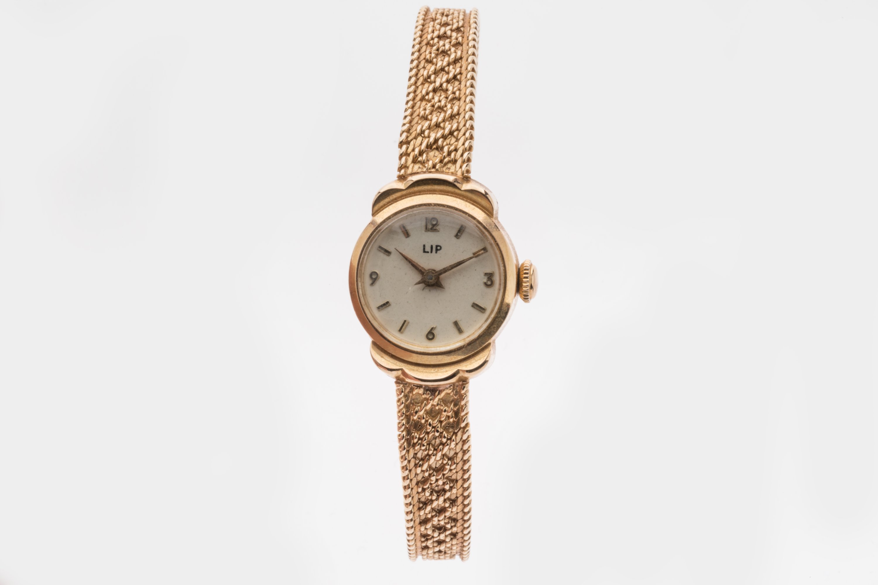 LIP. MONTRE DE DAME en or jaune 750 millièmes, boîtier de forme ronde, cadran émaillé, index et chiffres arabes pour les heures, bracelet souple tressé en or jaune 750 millièmes.
