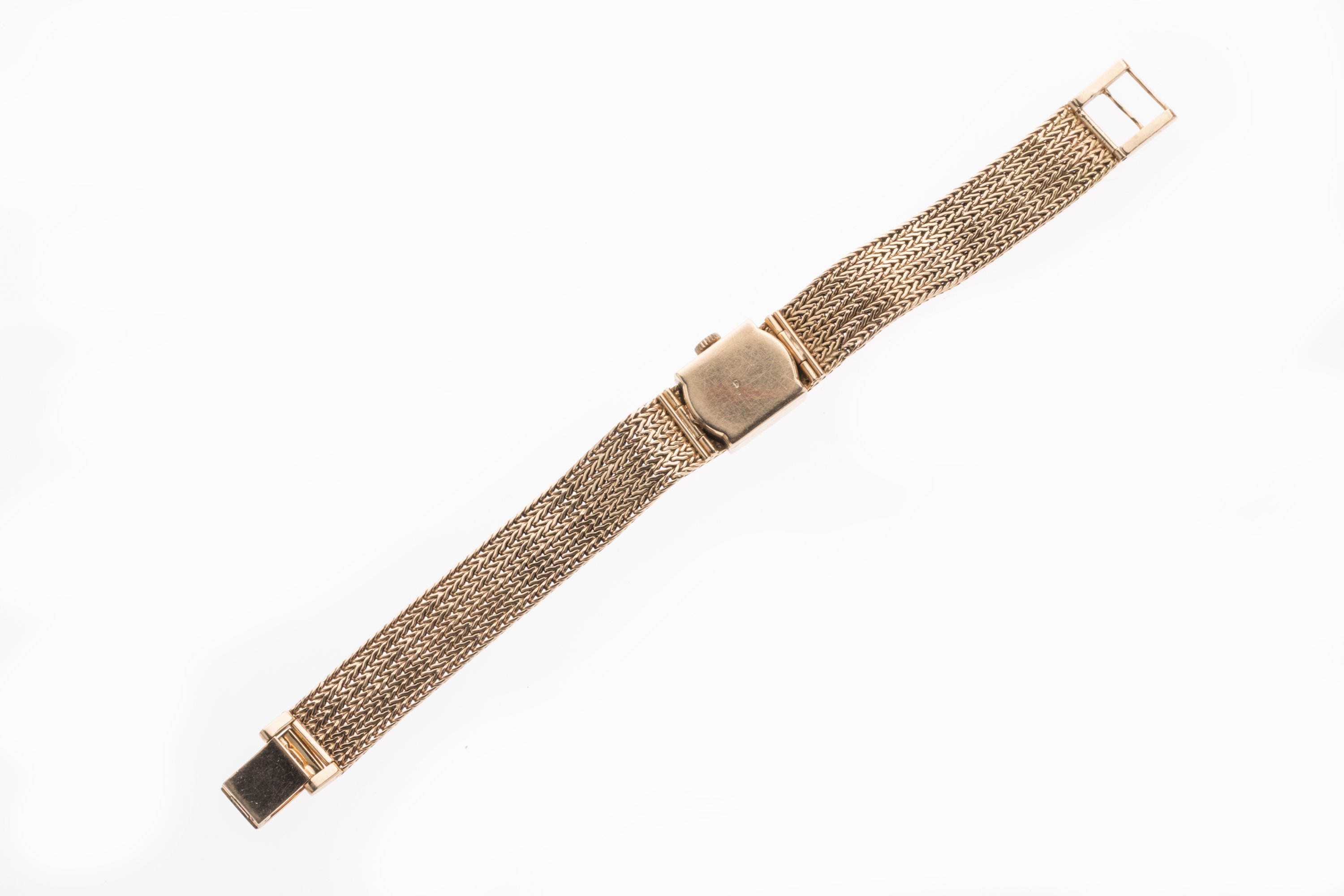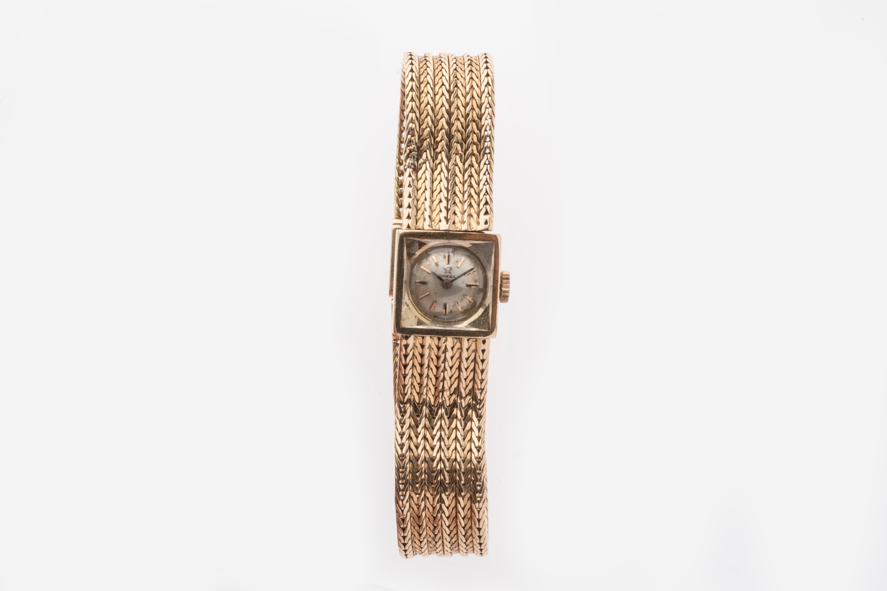 OMEGA. MONTRE BRACELET DE DAME en or jaune 750 millièmes. Le boitier de forme quadrangulaire avec un chemin de fer pour les heures. Remontoir à trois heures. Le bracelet en jaune 750 millièmes tressé, au fermoir sécurisé.