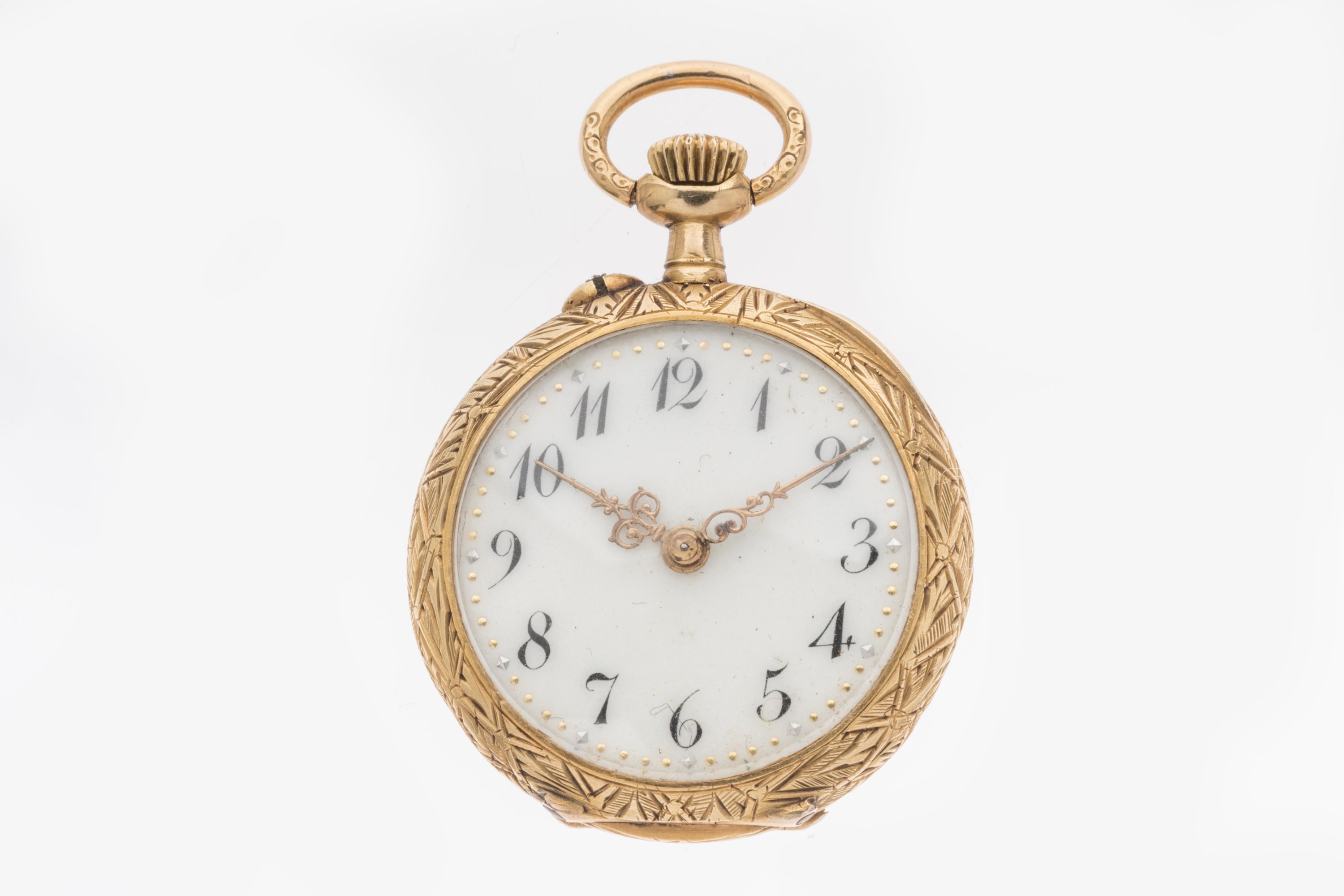 MONTRE de COL en or jaune 750 millièmes au boîtier travaillé, à décor feuillagé orné de pierres de couleurs. Le cadran émaillé avec chemin de fer et les heures en chiffres arabes.