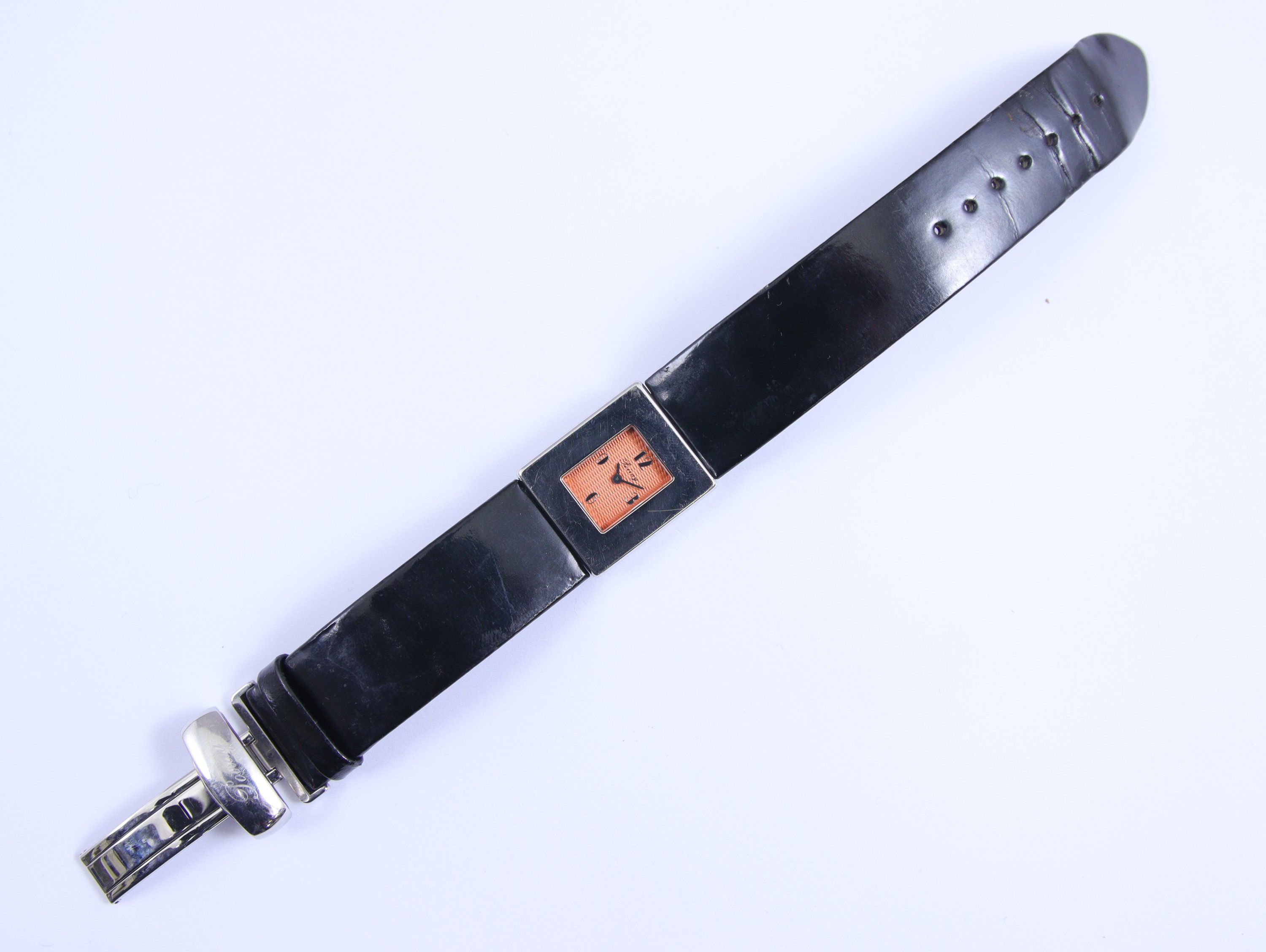 POIRAY. MONTRE BRACELET MA PREMIÈRE de dame en acier . Le boitier de forme rectangulaire. le cadran rose avec les heures 3, 6, 9 et 12 en chiffres arabes. Mouvement à quartz et bouton à six heures. Numérotée A51050.