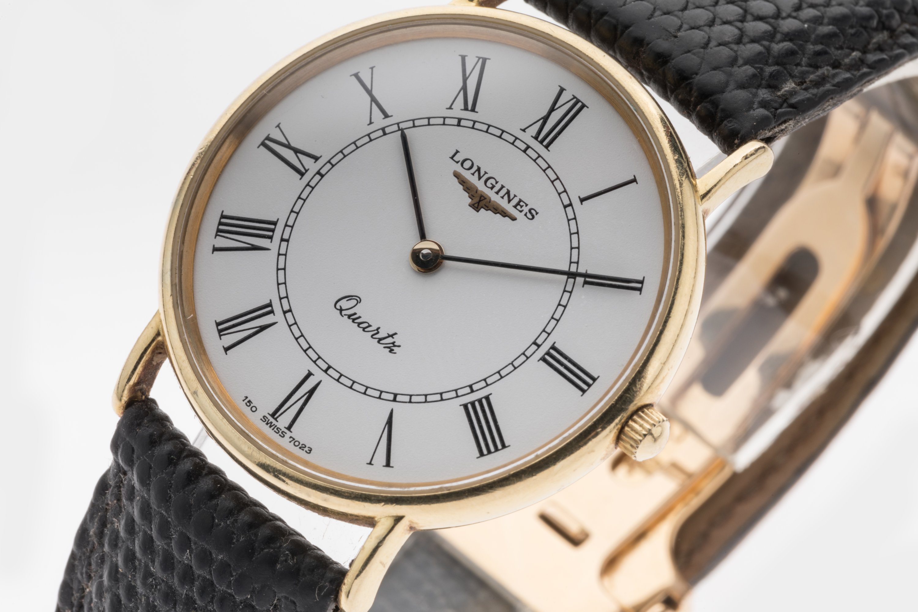 LONGINES. MONTRE BRACELET d'homme, modèle la "GRANDE CLASSIQUE PRÉSENCE", en or jaune 750 millièmes. Cadran circulaire marqué des heures en chiffres romains. Mouvement à quartz.