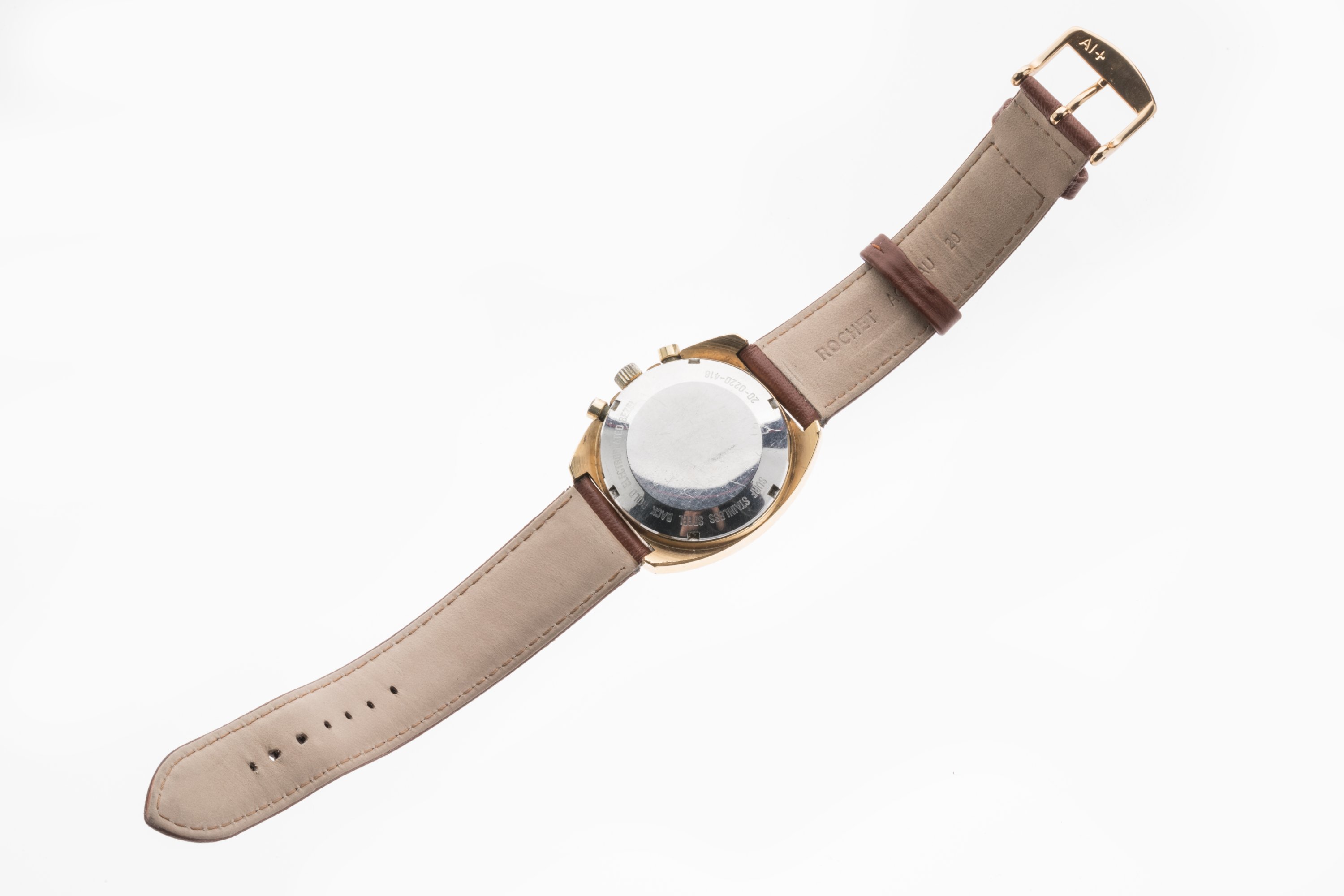Boîtier plaqué en or jaune de forme tonneau. Le cadran plaqué en or brossé avec trois compteurs en creux, échelle des secondes graduées, chemin de fer et logo appliqué à 12h. Fonctions: totalisateur des heures à 6 heures, petite seconde à 9 heures, minutes à 3 heures, date entre 4 heures et 5 heures, trotteuse lance, index appliqués et aiguilles bâton luminescentes. Bracelet en cuir rapporté.