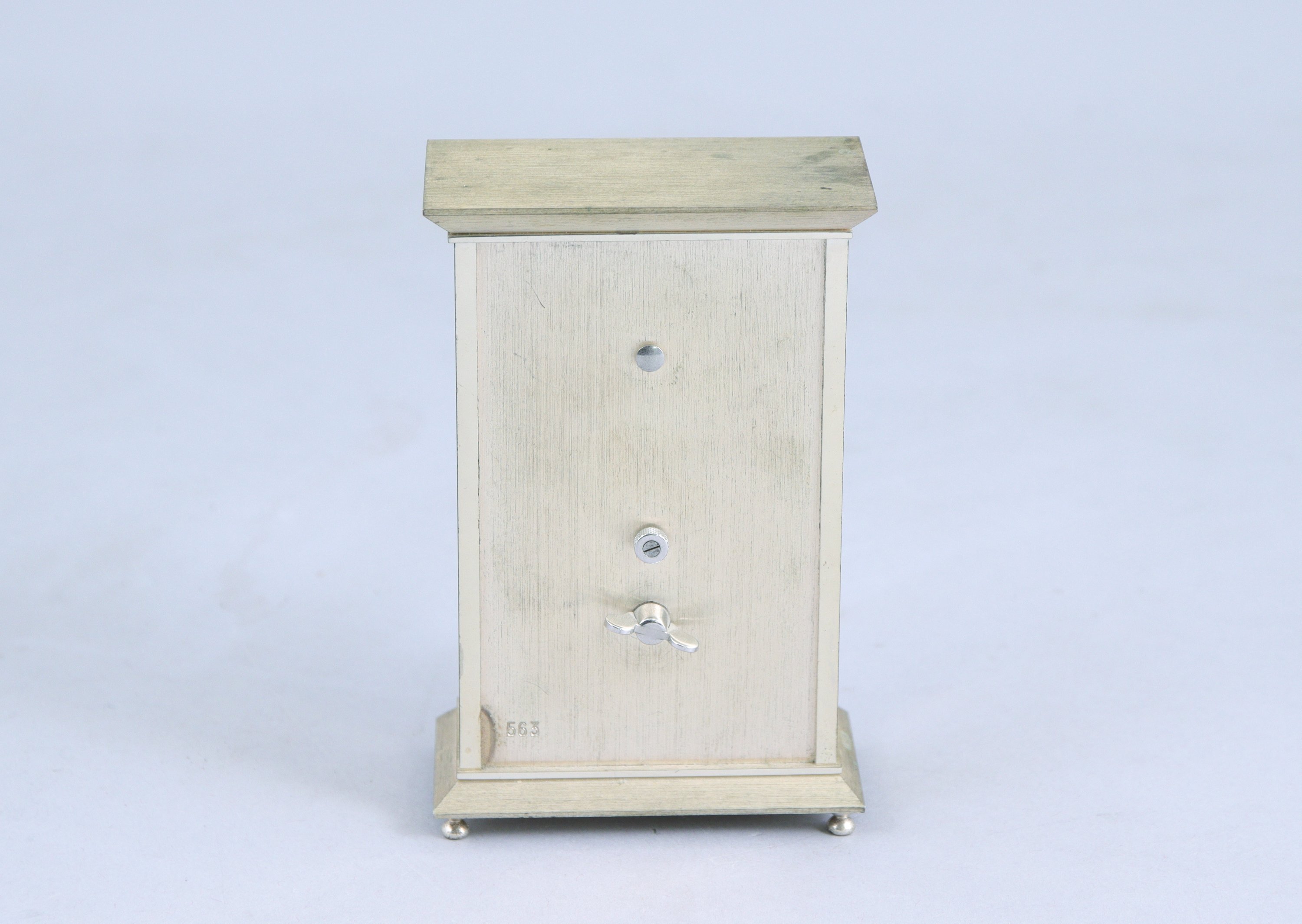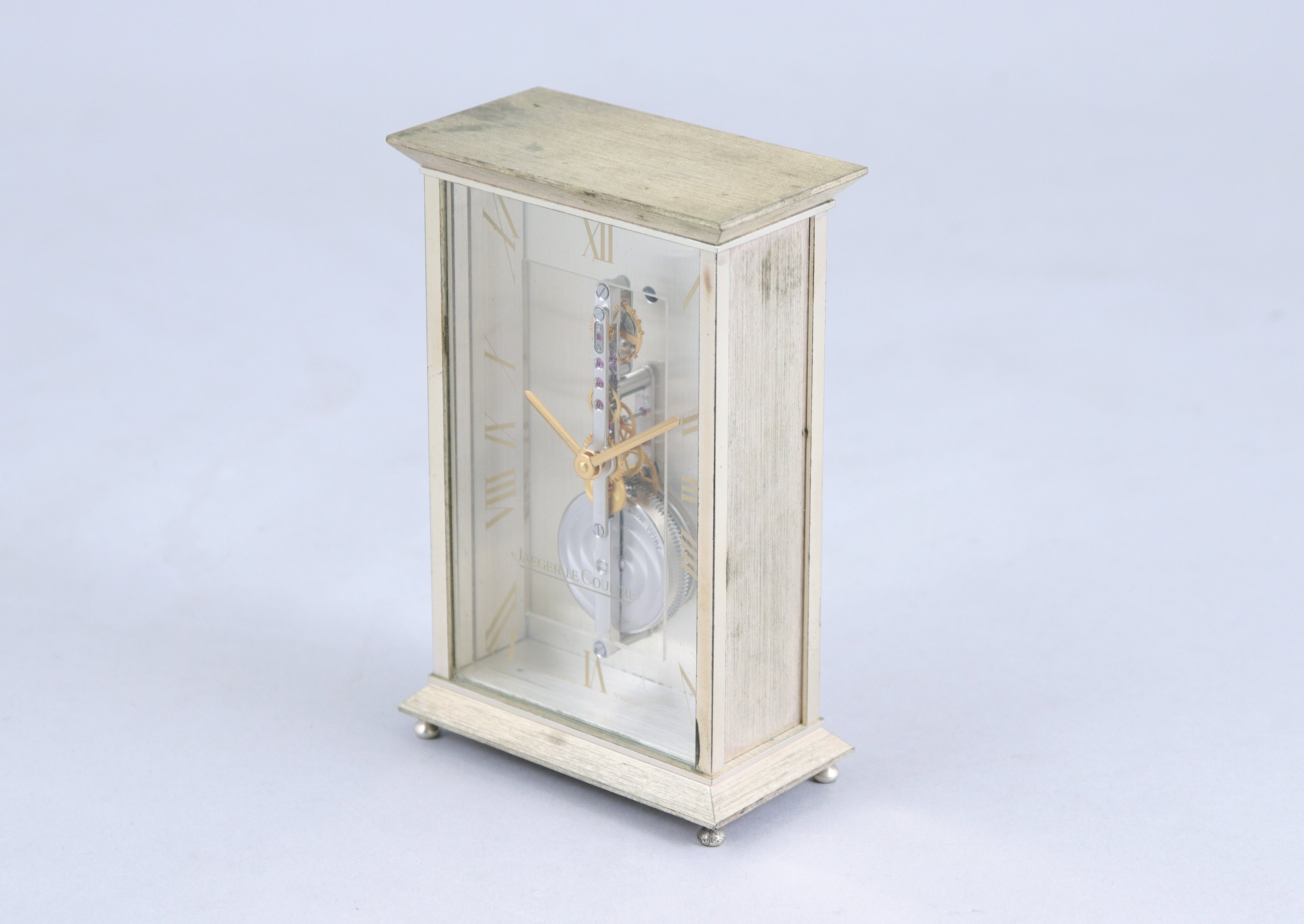 JAEGER LECOULTRE. PENDULETTE DE BUREAU d forme rectangulaire en laiton brossé à mouvement apparent., les heures en chiffre romains sur un cadran transparent. Mouvement mécanique et remontoir à l'arrière. Numérotée 563.