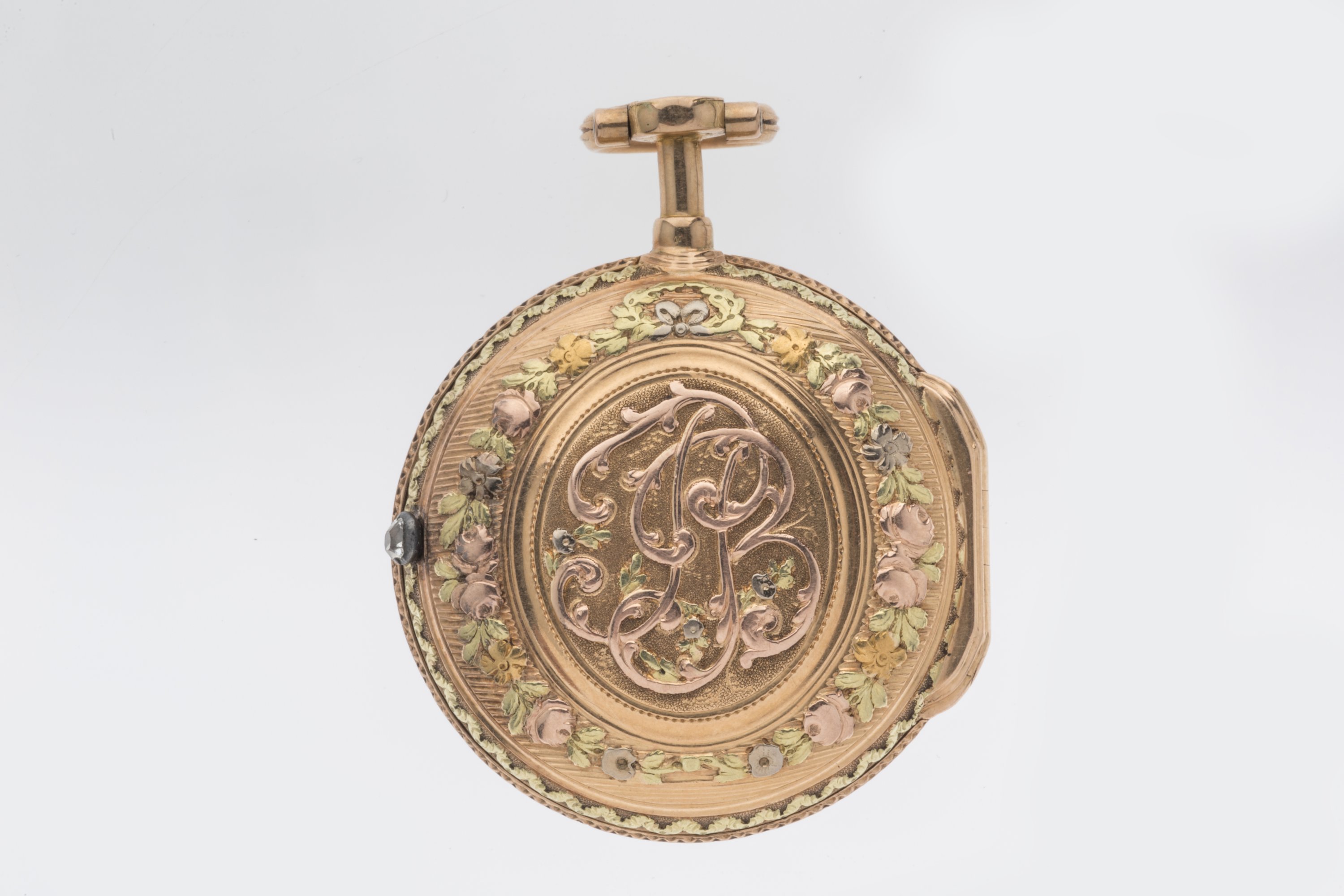 MONTRE à COQ en or 750 millièmes de plusieurs tons et argent. Le fond est à décor de couronnes végétales avec au centre le monogramme "PB". Le cadran est argenté avec les heures en chiffres romains et un chemin de fer pour les minutes. Remontage à clé par le devant à 2 heures, mouvement à coq. Le poussoir est orné d'un diamant (?) à 3 heures.