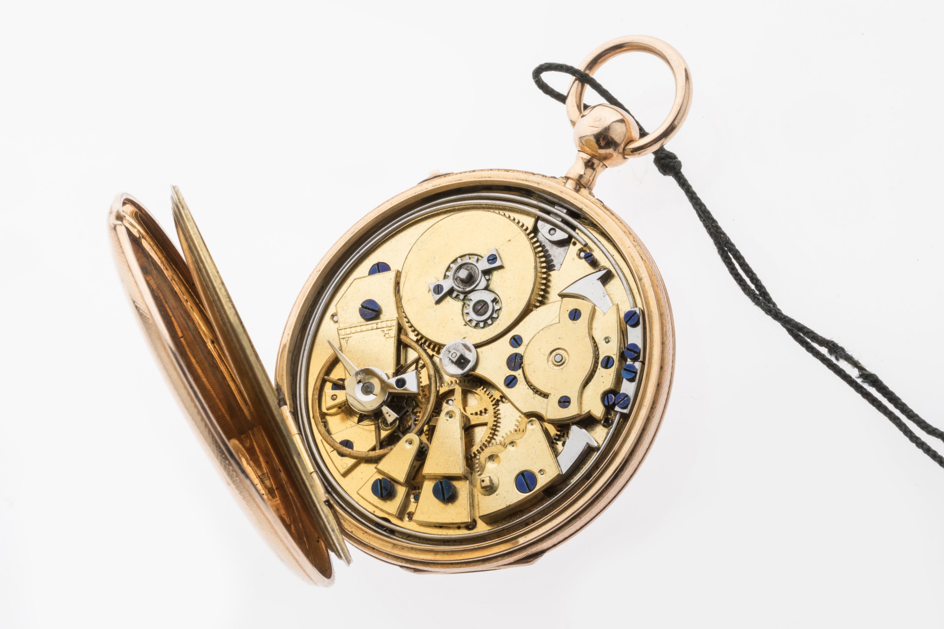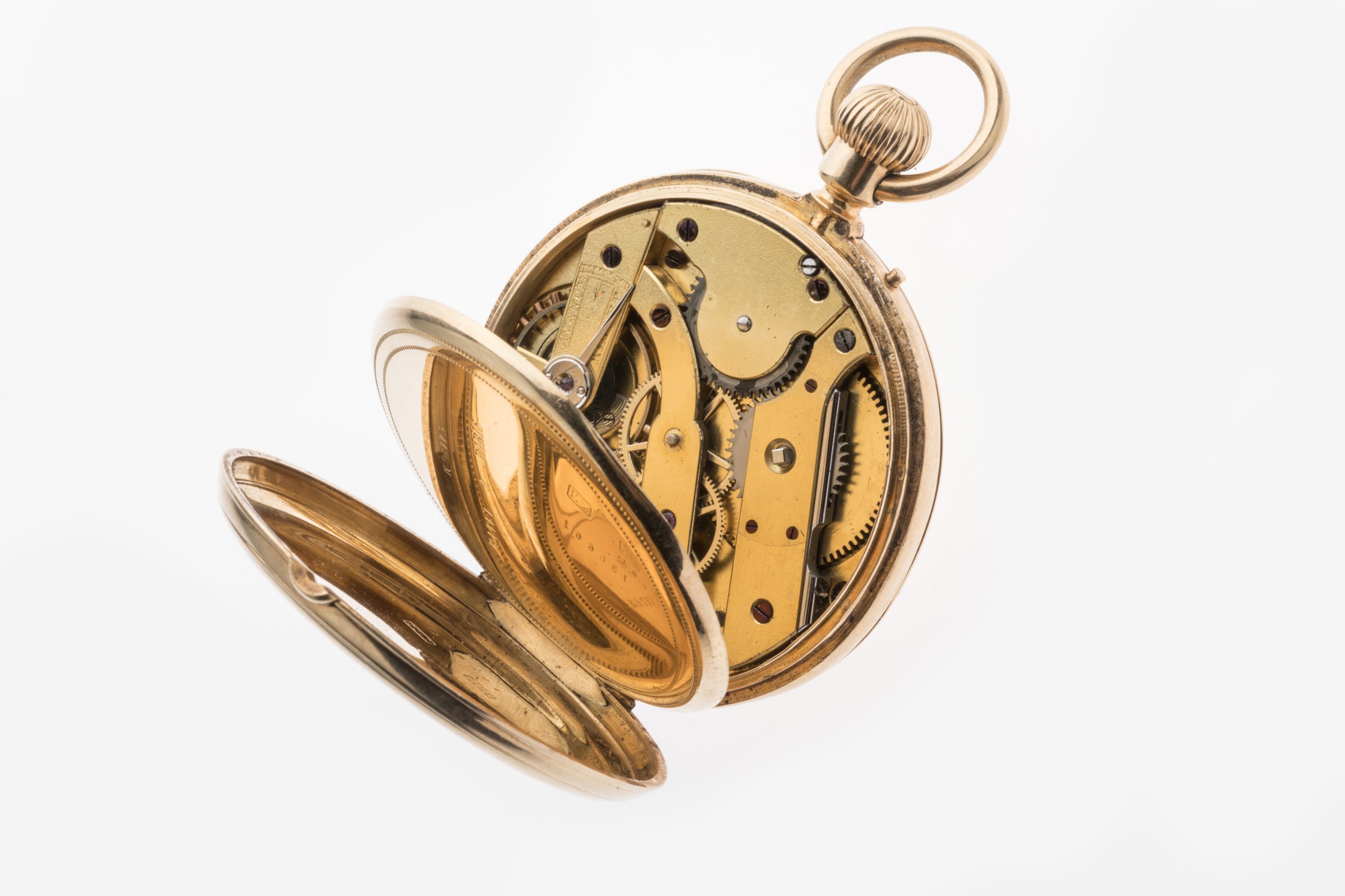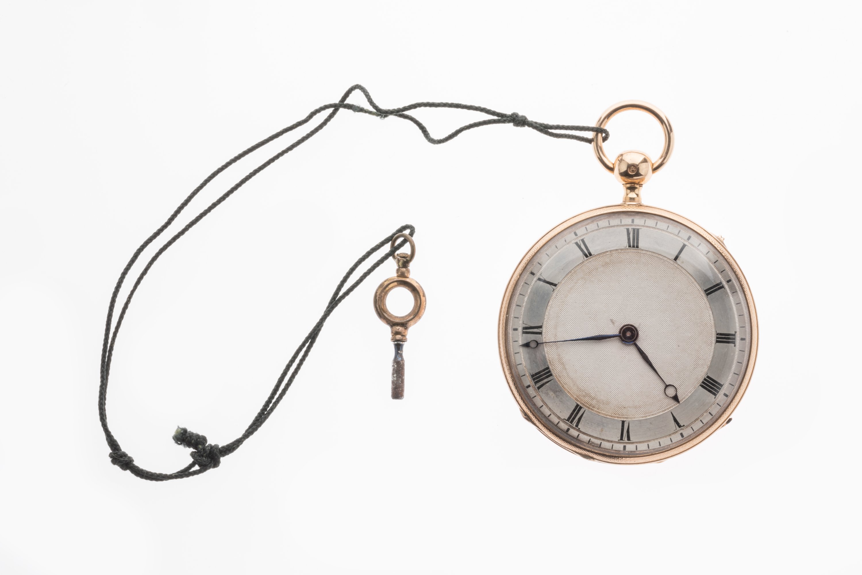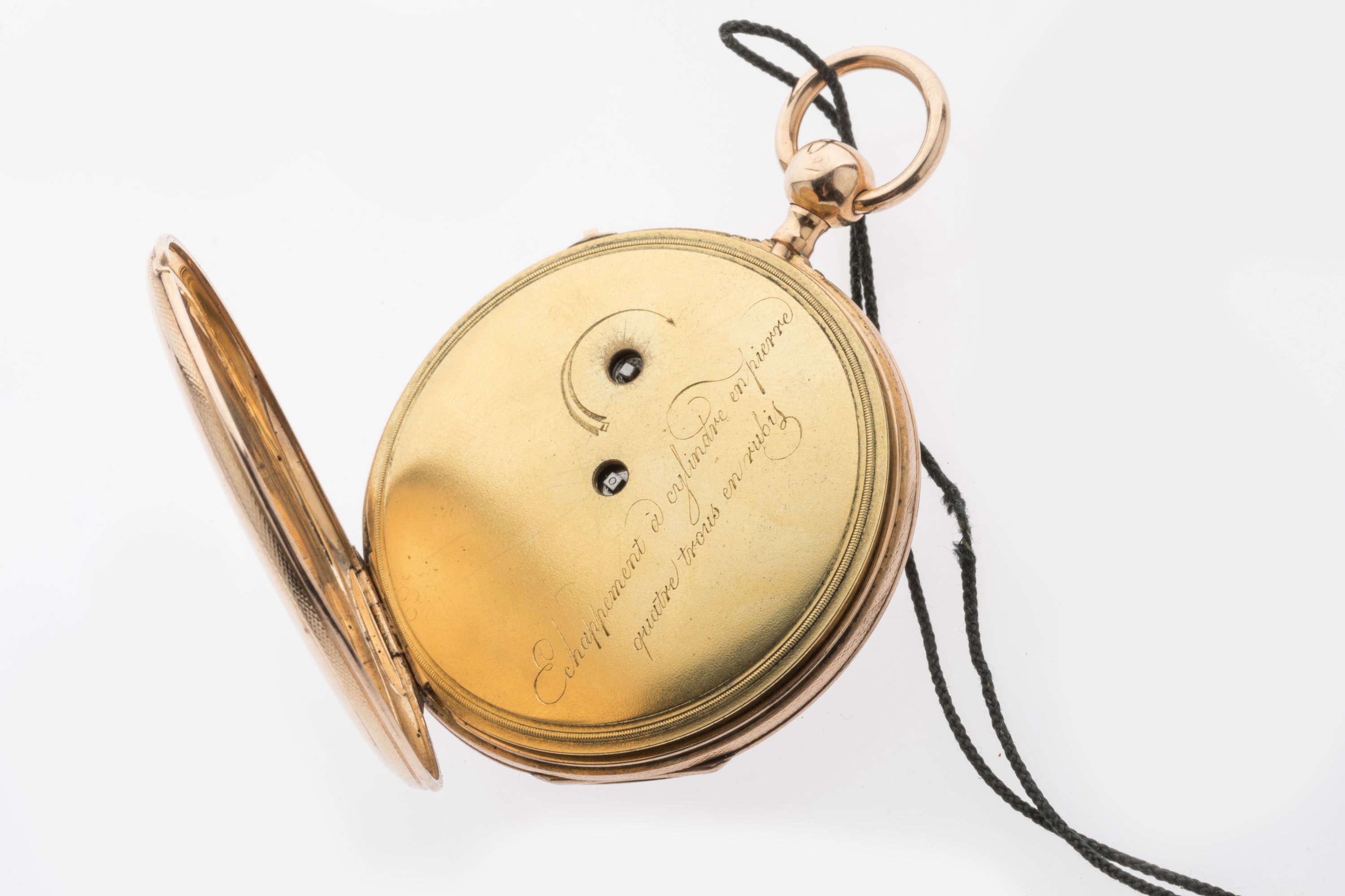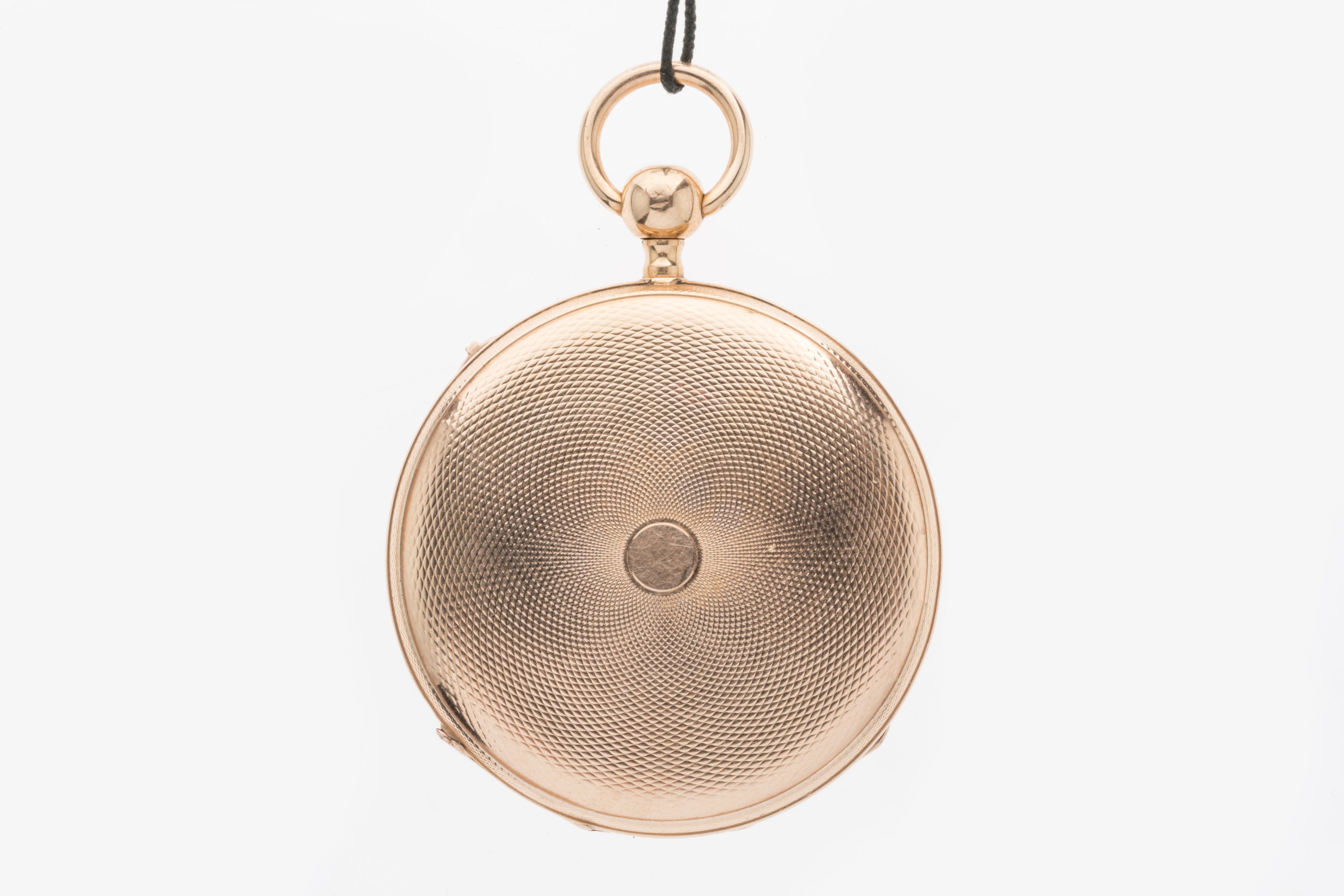 MONTRE DE GOUSSET en or jaune 750 millièmes, le cadran émaillé avec les heures en chiffres arabes et chemin de fer pour les minutes, cadran des secondes à six heures. Remontoir à midi. Le boîtier circulaire monogrammé "OC".