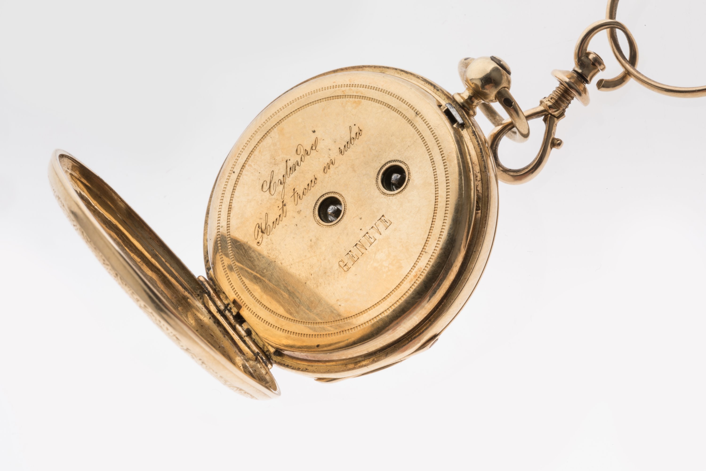 Le cadran de forme ronde est émaillé. Remontage à clé, échappement à cylindre, huit trous en rubis. Cache poussière gravé "GENEVE". Fond ciselé d'un médaillon fleuri, entouré d'une frise géométrique.
