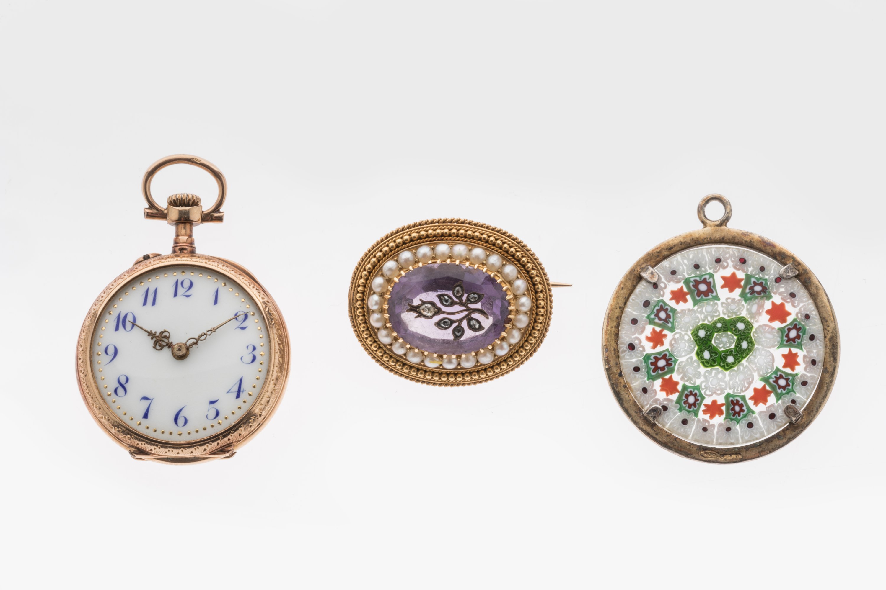 - BROCHE en or 750 millièmes ornée d'une pierre violette façon améthyste gravée d'un motif floral. Frise de semences de perles. Haut. 25 mm. Poids brut 7,3 g.