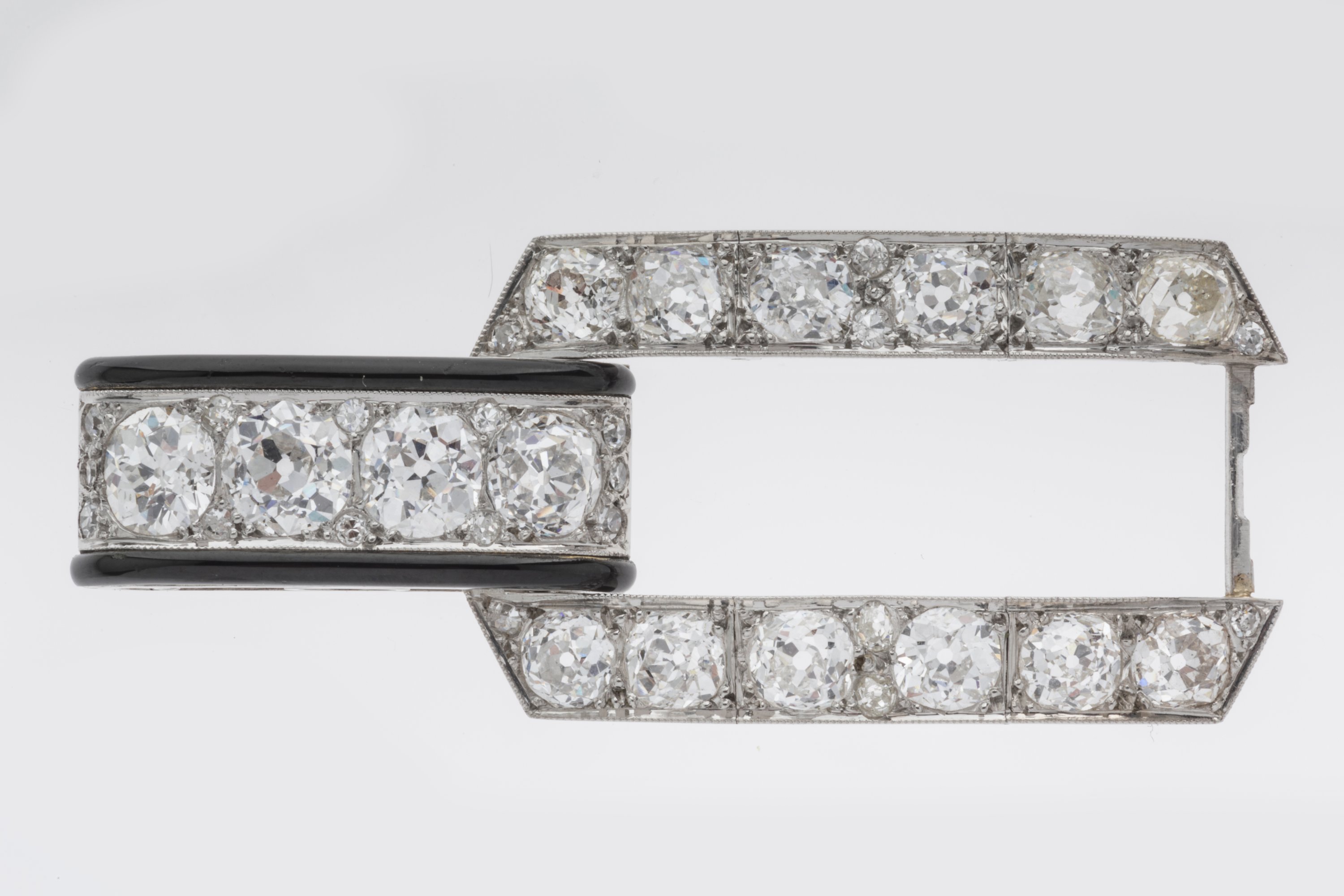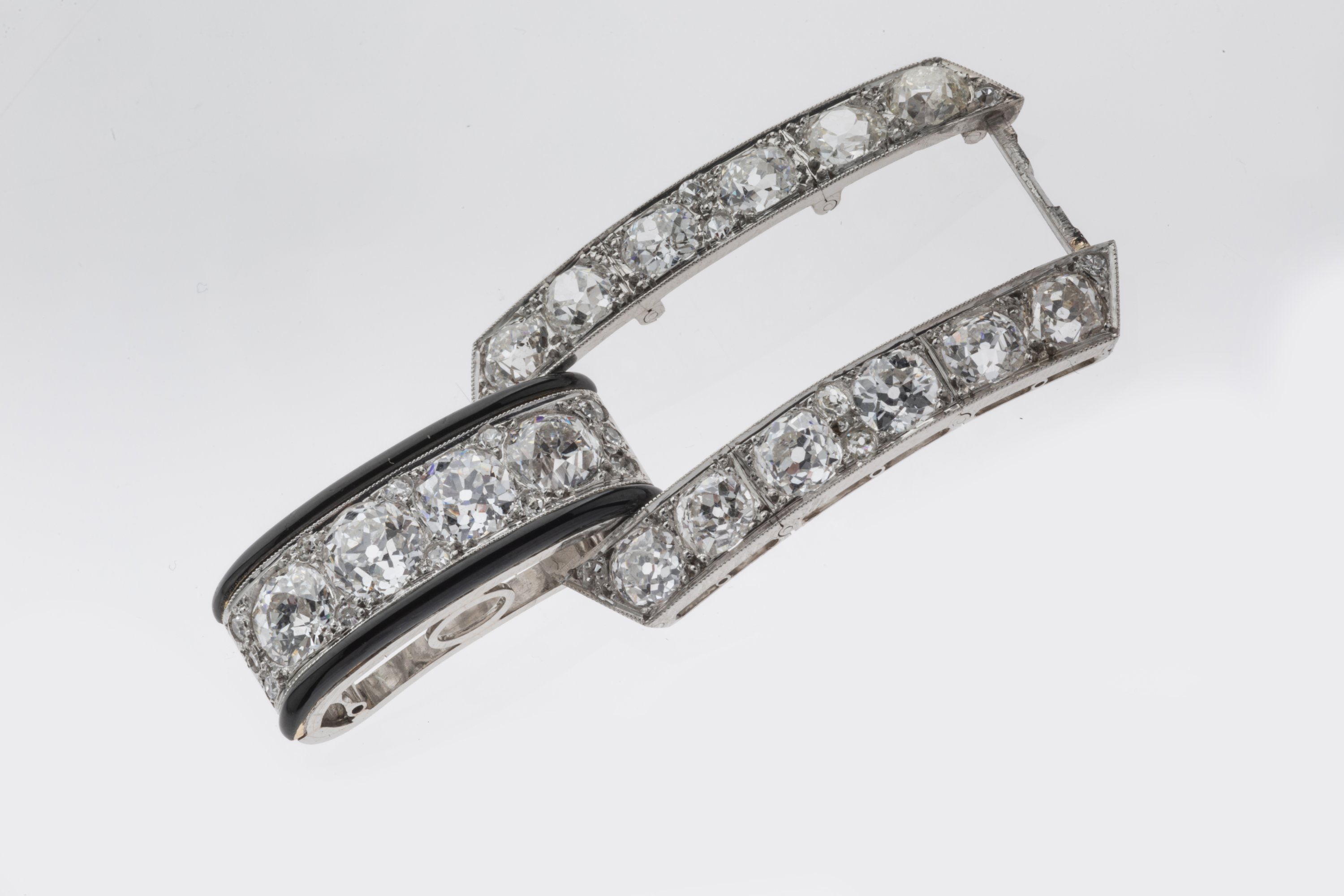 Elément de BRACELET en platine 750 millièmes ajouré entièrement serti de DIAMANTS ronds taillés en huit-huit et de taille ancienne, certains plus importants entre des filets d'émail noirs.