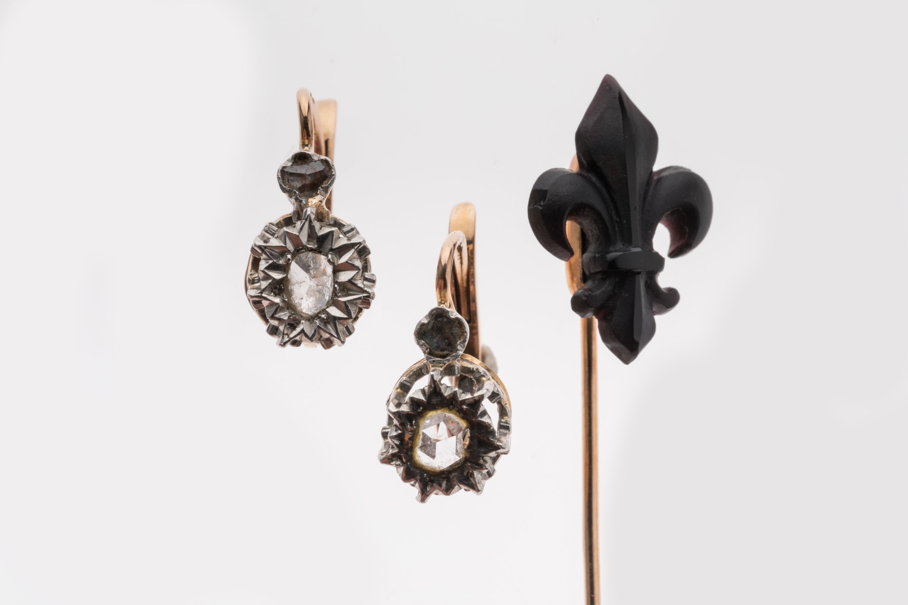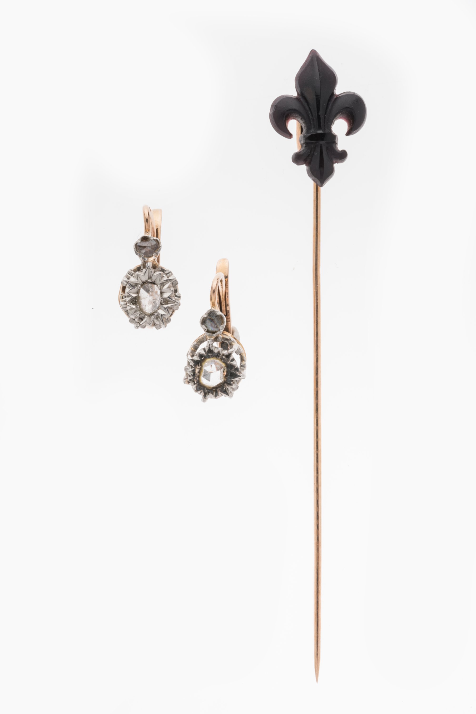 JOINT: ÉPINGLE en or ornée d'une FLEUR de LYS en pierre noire. Poids brut 1,2 g.