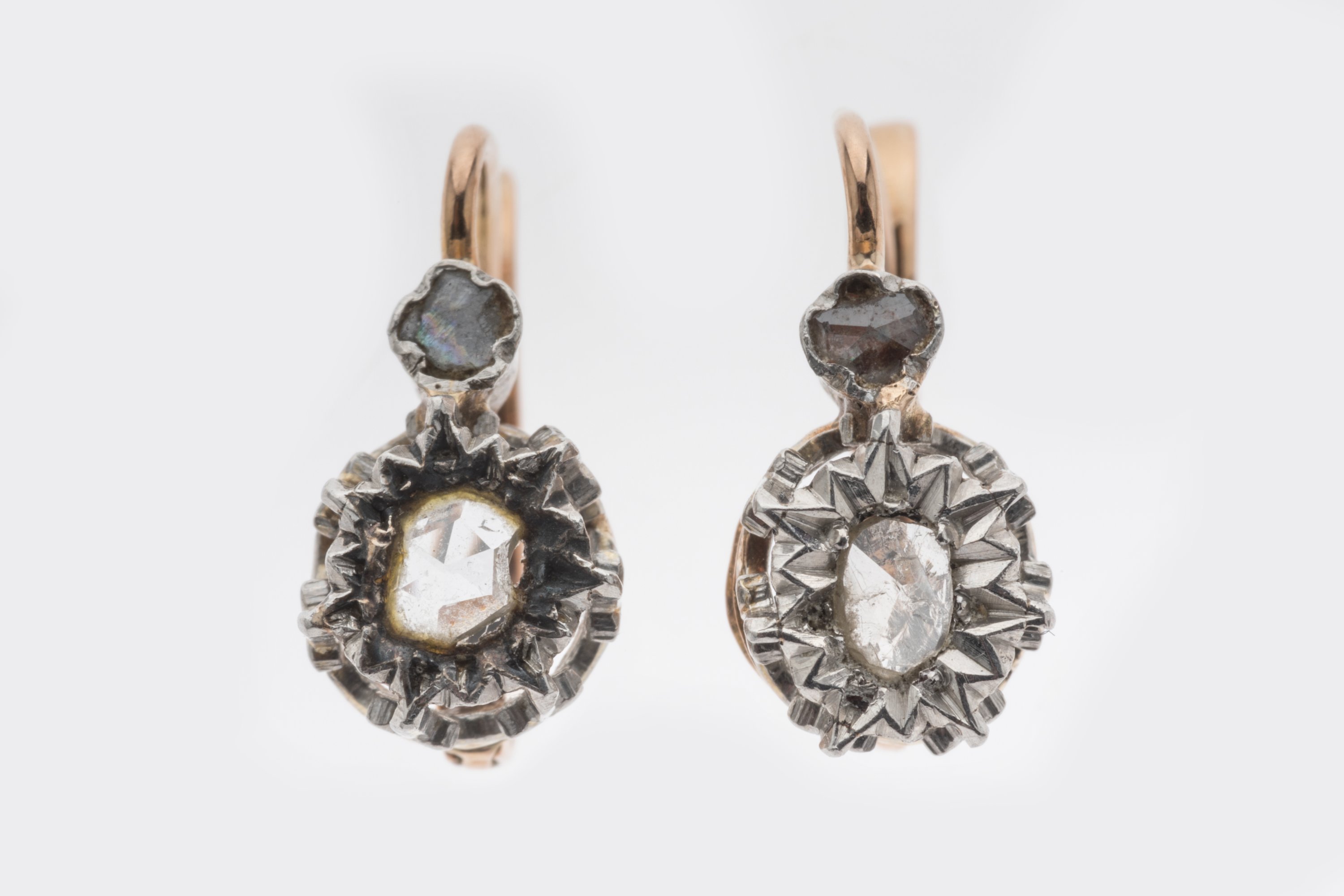 PAIRE de BOUCLES d'OREILLES DORMEUSES en or jaune ornées de quatre DIAMANTS de taille ancienne.